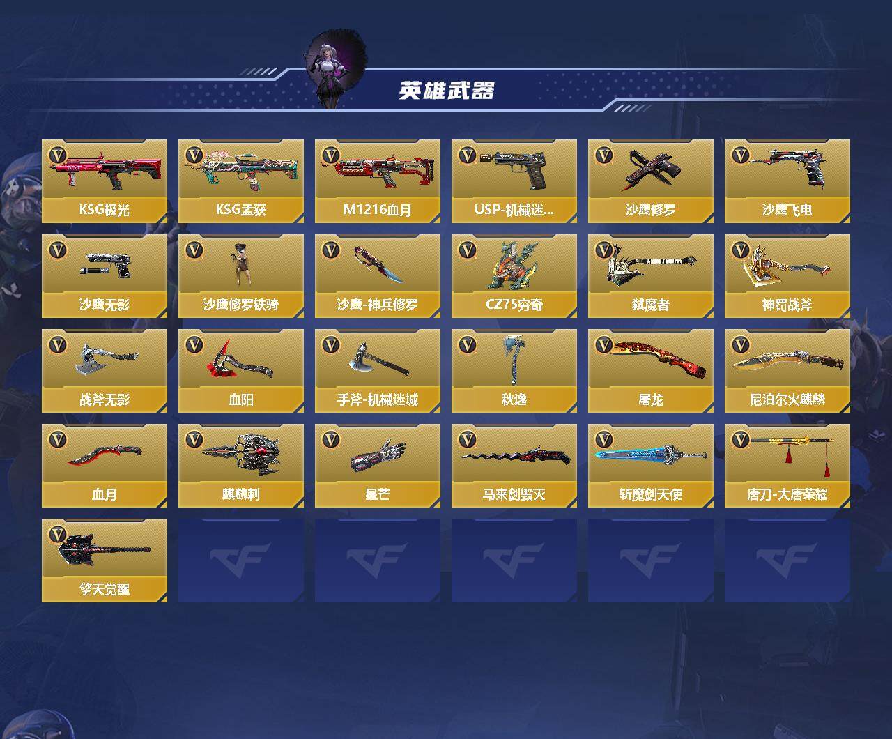 王者之影,王者之狱,王者幻神,M12S-雷霆王者,M4A1-破空冰刃,M4A1-心动次元,M4A1-心动次元觉醒,AK47-黑鲨,屠龙,弑魔者,尼泊尔-火麒麟,马来剑-毁灭,神罚战斧,QBZ03-死神,麒麟刺,加特林-堡垒,AK47-樱斗士-一觉,M14EBR-暗夜,SCAR-幽暗骑士,M4A1-卧龙,QBZ03-金色蔷薇,斩魔剑-天使,擎天觉醒,王者之烈,沙鹰-修罗,沙鹰-飞电,星芒,血阳,战斧-无影,血月,沙鹰-无影,SCAR-守护者觉醒,PP19野牛-造纸术,VEPR12-本初,打击者-天神,M1216-霸王龙,Mk47-鼓龙,M4A1-猎神,秋逸,98K-星神,M14EBR-拂影,QBZ03-玉面羞花,沙鹰-神兵修罗,沙鹰-修罗-铁骑,手斧-机械迷城,唐刀-大唐荣耀,USP-机械迷城,AN94-四凶觉醒,QCW05-变形金刚·大黄蜂,M1216-血月,CZS2-血月,KSG-极光,CZ75-穷奇,M4A1-樱龙·超觉,AK47-冰魂觉醒,M4A1-竞技战魂,M4A1-星象,AK47-耀金伯爵,M4A1-雷神,AK47-无影,M4A1-黑骑士,M4A1-黑龙,剑齿虎,M4A1-死神,AK47-黑武士觉醒,M4A1-玫瑰精灵,9A91-死神,M4A1-游骑兵,QBZ03-湮灭,AN94-超新星,AK47-变色龙,AK47-幸运日觉醒,AK47-雷麒麟,M4A1-赛博雷神,G36-机械纪元,AK47-血武士,M4A1-冰锋觉醒,MK47-云舞,9A91-游骑兵,M14EBR-天神,M4A1-竞界荣光,AK47-沙漠郡主-超觉,AK47-火麒麟,98K-血月,地狱火,黑龙魂,地狱烈炎,亡命之徒-幻兽,汤姆逊-烈龙,双持斯泰尔-天使,MK5-机械纪元,M200-心动次元觉醒,AWM-裁决,09式狙-天神,AWM-游骑兵,巴雷特-枪娘,暗杀神,斯泰尔-恶魔,A180-地狱凤凰,斯泰尔-蝴蝶,MG3-雏凤,加特林-蟒蛇,AWM-天龙,巴雷特-毁灭,巴雷特-极光,KSG-孟获,M4A1-太白诗仙,CBJ-MS-毒蜂,雷霆,寒霜烈龙,关小雨,零-水下丽影,萝拉,炽天使-X,零-新生,王者之魂-白金血钻,MK47-鼓龙-嘴炮,巴雷特-毁灭-现代战场