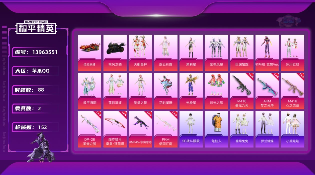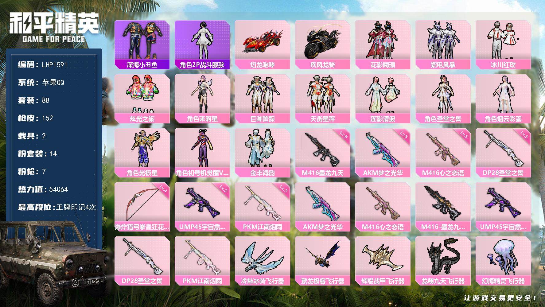 [13963551]【暑期末清货/特价急出/永久包赔/商品详情看图】:苹果 手Q-14粉装-7特效枪-2载具-5.4w热力值-4印记-88套装-152枪皮【稀有载具】:焰龙咆哮,疾风龙骑【特效枪等级】:AKM-梦之光华(五级),M416-心之恋语(五级),M416-墨龙九天(六级),UMP45-宇宙意志(三级),DP-28-圣堂之誓(五级),PKM-江南烟雨(三级),爆炸猎弓-拳皇·狂花道(四级)【热门品类】:套装-深海小丑鱼,角色-2P战斗服款【优质套装】:粉装-梦幻火箭,粉装-花影阑珊,粉装-紫电风暴,粉装-冰川红玫,粉装-炫光之旅,角色-茉莉星,粉装-巨渊蟹踪,粉装-天衡星秤,粉装-莲影清波,角色-圣堂之誓,角色-烟云彩露,角色-光极星,角色-初号机 觉醒Ver.,粉装-金丰海韵【优质飞行器】:冷魅冰骑飞行器,繁龙极客飞行器,辉耀战甲飞行器,龙翔九天飞行器,幻海精灵飞行器,深渊漩涡飞行器