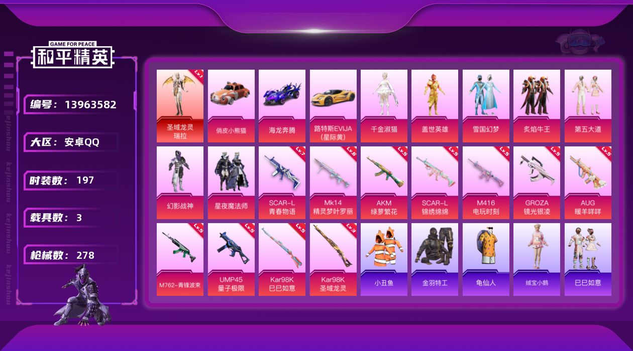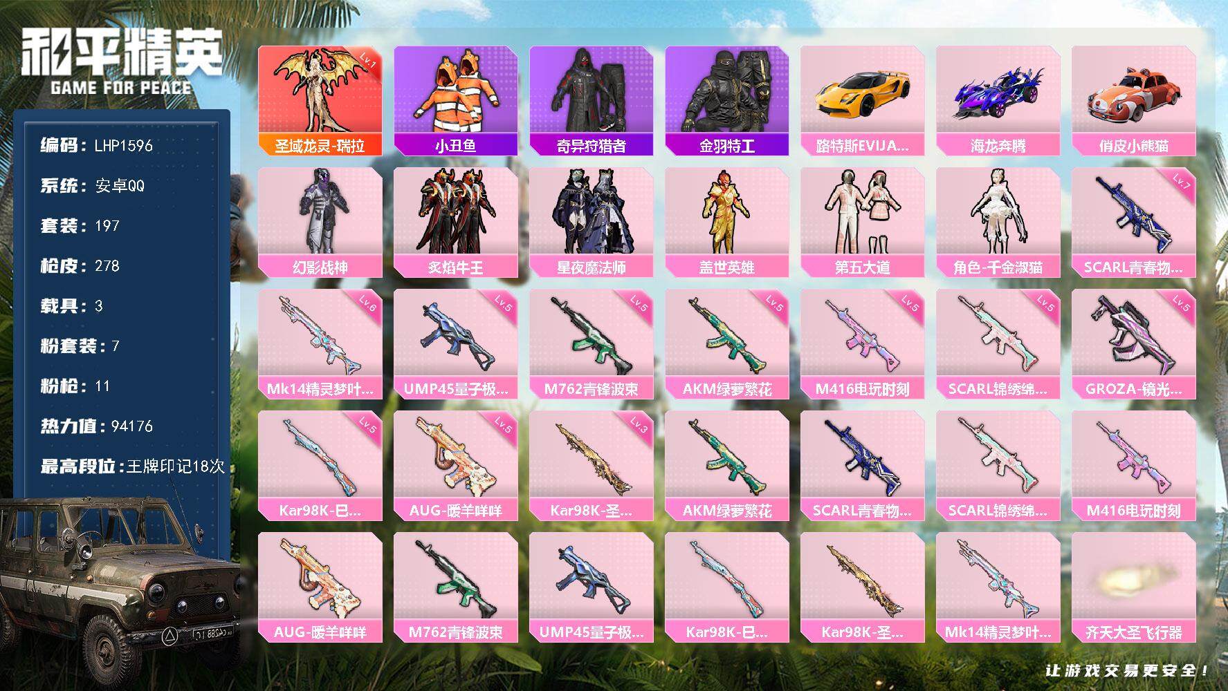 [13963582]【暑期末清货/特价急出/永久包赔/商品详情看图】:安卓 手Q1红装-7粉装-11特效枪-3载具-9万热力值-18印记-197套装-278枪皮【热门品类】:套装-小丑鱼,套装-奇异狩猎者,套装-金羽特工【角色神装】:圣域灵-瑞拉【角色神装等级】:圣域龙灵-瑞拉(一级)【稀有载具】:路特斯EVIJA(星际黄),海龙奔腾,俏皮小熊猫【特效枪等级】:AKM-绿萝繁花(五级),SCAR-L-青春物语(七级),SCAR-L-锦绣绵绵(五级),M416-电玩时刻(五级),GROZA-镜光银凌(五级),AUG-暖羊咩咩(五级),M762-青锋波束(五级),UMP45-量子极限(五级),Kar98K-圣域龙灵(三级),Kar98K-巳巳如意(五级),Mk14-精灵梦叶罗丽(六级)【优质套装】:粉装-幻影战神,粉装-雪国幻梦,粉装-炙焰牛王,粉装-星夜魔法师,粉装-盖世英雄,粉装-第五大道,角色-千金淑猫【稀有套装】:套装-龟仙人,套装-绒宝小鹅,套装-巳巳如意,套装-雏菊兔兔,套装-萝兰蝴蝶,套装-小熊娃娃,套装-糖糖葫芦,套装-青团波波,套装-棉花软糖,角色-都市丽猫,角色-摩登魅猫,套装-燕燕于飞,套装-鱼渊荷华,角色-海琴烟,套装-焰舞炽心,套装-紫幽梦,套装-蓝冰羽【优质武器皮肤】:AKM-绿萝繁花,SCAR-L-青春物语,SCAR-L-锦绣绵绵,M416-电玩时刻,AUG-暖羊咩咩,M762-青锋波束,UMP45-量子极限,Vector-创世·救赎,Kar98K-巳巳如意,Kar98K-圣域龙灵,Mk14-精灵梦叶罗丽