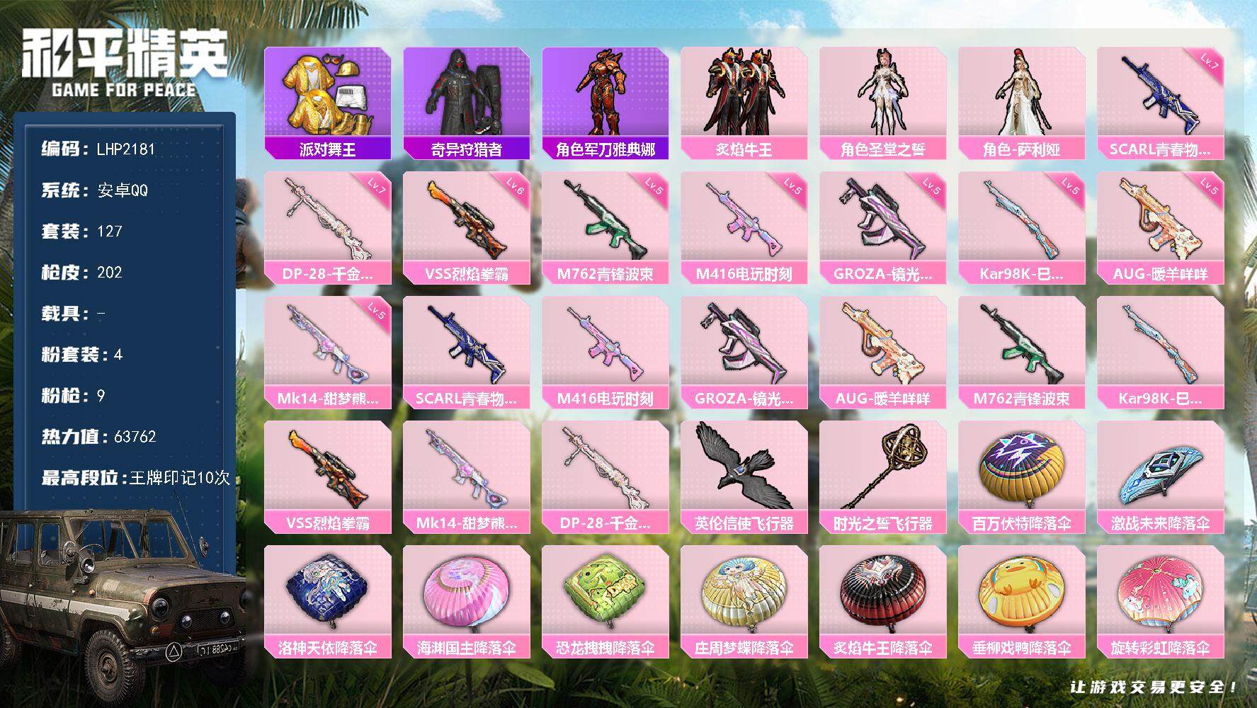 [13963759]地铁满天赋【暑期末清货/特价急出/永久包赔/商品详情看图】:安卓 手Q-4粉装-9特效枪-6.3w热力值-10印记-127套装-202枪皮【热门品类】:套装-派对舞王,套装-奇异狩猎者,角色-军刀雅典娜【特效枪等级】:SCAR-L-青春物语(七级),M416-电玩时刻(五级),GROZA-镜光银凌(五级),AUG-暖羊咩咩(五级),M762-青锋波束(五级),Kar98K-巳巳如意(五级),VSS-烈焰拳霸(六级),DP-28-千金淑猫(七级),MG3-辉羽雀灵(五级Mk14-甜梦熊击)【优质套装】:粉装-炙焰牛王,粉装-音爆索尼克,角色-圣堂之誓,角色-萨利娅【优质飞行器】:英伦信使飞行器,时光之誓飞行器