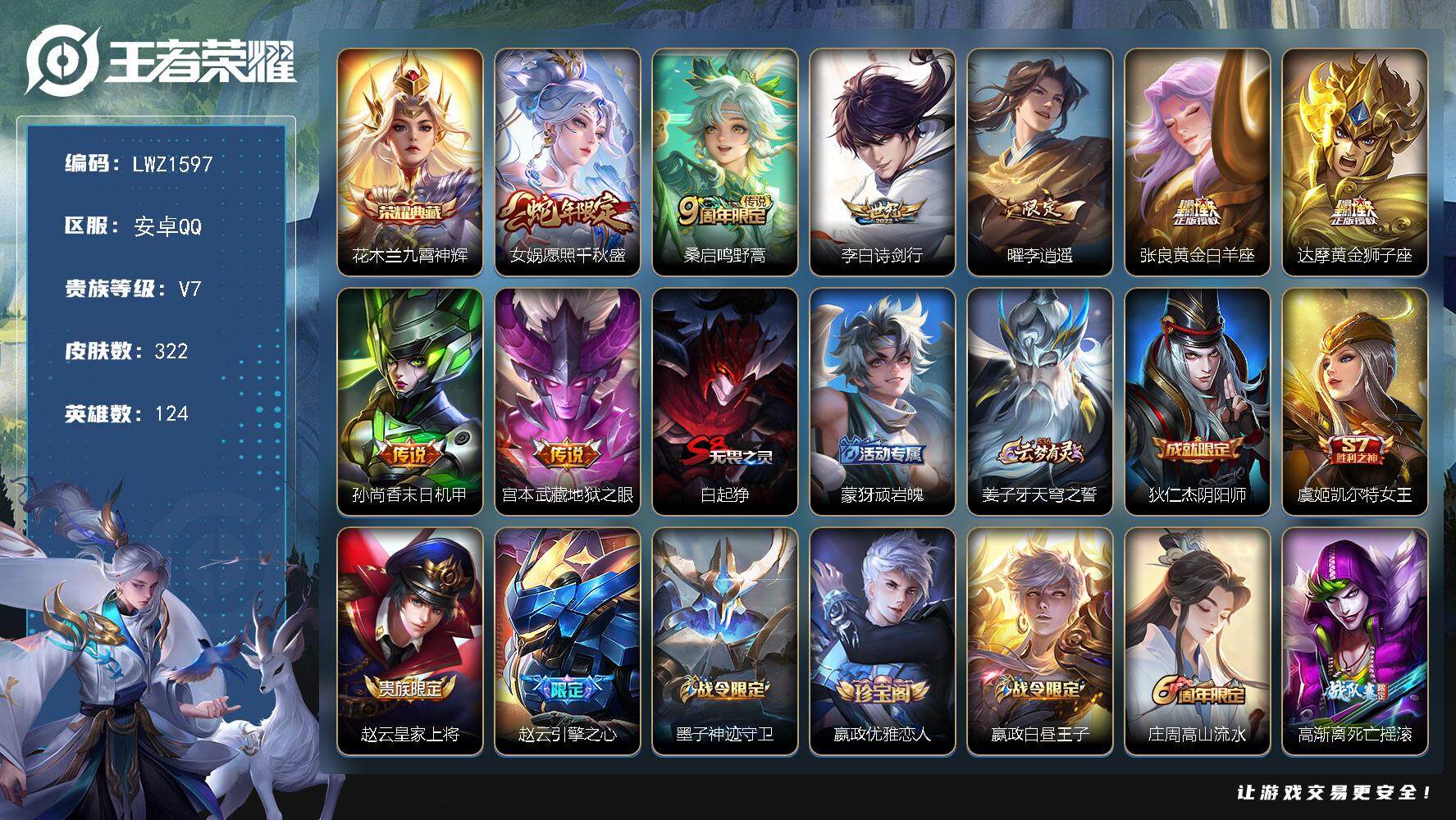 [13963830]【暑期末清货/特价急出/永久包赔】:安卓Q-V7-至尊星耀III段位-124英雄-322皮肤-1典藏-8传说-92史诗【荣耀典藏】:花木兰九霄神辉【传说皮肤】:宫本武藏地狱之眼,孙尚香末日机甲,达摩黄金狮子座,张良黄金白羊座,曜李逍遥,李白诗剑行,桑启鸣野蒿,女娲愿照千秋盛【年限皮肤】:马超神威【史诗皮肤】:鲁班七号电玩小子,项羽苍穹之光,露娜紫霞仙子,钟无艳王者之锤,赵云皇家上将,赵云未来纪元,貂蝉圣诞恋歌,甄姬冰雪圆舞曲,王昭君偶像歌手,狄仁杰魔术师,廉颇地狱岩魂,宫本武藏鬼剑武藏,孙尚香水果甜心,嬴政优雅恋人,嬴政摇滚巨星,妲己女仆咖啡,墨子龙骑士,墨子金属风暴,吕布圣诞狂欢,刘禅绅士熊喵,曹操幽灵船长,李白千年之狐,吕布末日机甲,张飞乱世虎臣,韩信白龙吟,关羽冰锋战神,孙悟空至尊宝,赵云引擎之心,花木兰水晶猎龙者,夏侯惇乘风破浪,小乔缤纷独角兽,兰陵王暗隐猎兽者,诸葛亮黄金分割率,亚瑟心灵战警,雅典娜冰冠公主,安琪拉心灵骇客,百里守约特工魅影,铠曙光守护者,蔡文姬舞动绿茵,裴擒虎梅西,刘禅天才门将,李元芳逐浪之夏,程咬金功夫厨神,白起星夜王子,阿轲节奏热浪,杨玉环遇见飞天,东皇太一逐梦之光,嬴政白昼王子,孙策猫狗日记,大乔猫狗日记,干将莫邪冰霜恋舞曲,孙悟空大圣娶亲,伽罗箭羽风息,裴擒虎天狼狩猎者,狄仁杰鹰眼统帅,兰陵王驯魔猎人,上官婉儿梁祝,蔡文姬繁星吟游,小乔青蛇,不知火舞魅语,橘右京修罗,马超神威,孙尚香时之恋人,马可波罗暗影游猎,百里玄策原初追逐者,裴擒虎李小龙,云中君纤云弄巧,米莱狄胡桃异想国,老夫子航海奇遇记,伽罗天狼溯光者,杨戬天秀启明,干将莫邪真爱魔法,孙悟空孙行者,庄周高山流水,嫦娥拒霜思,雅典娜黎明之约,夏洛特永昼,明世隐吟游魔法,鬼谷子五谷丰年,元歌无心,梦奇顽趣,扁鹊奇幻香踪,刘禅电玩爆裂旋风,阿古朵江河有灵,蒙犽百解令,周瑜雪夜绮愿,蒙恬荣光圣徽,伽罗琥珀纪元,姬小满妄想食味,蒙犽顽岩魄,赵怀真器灵浮梦炉,刘禅鸭鸭历险记,狂铁龙之律动