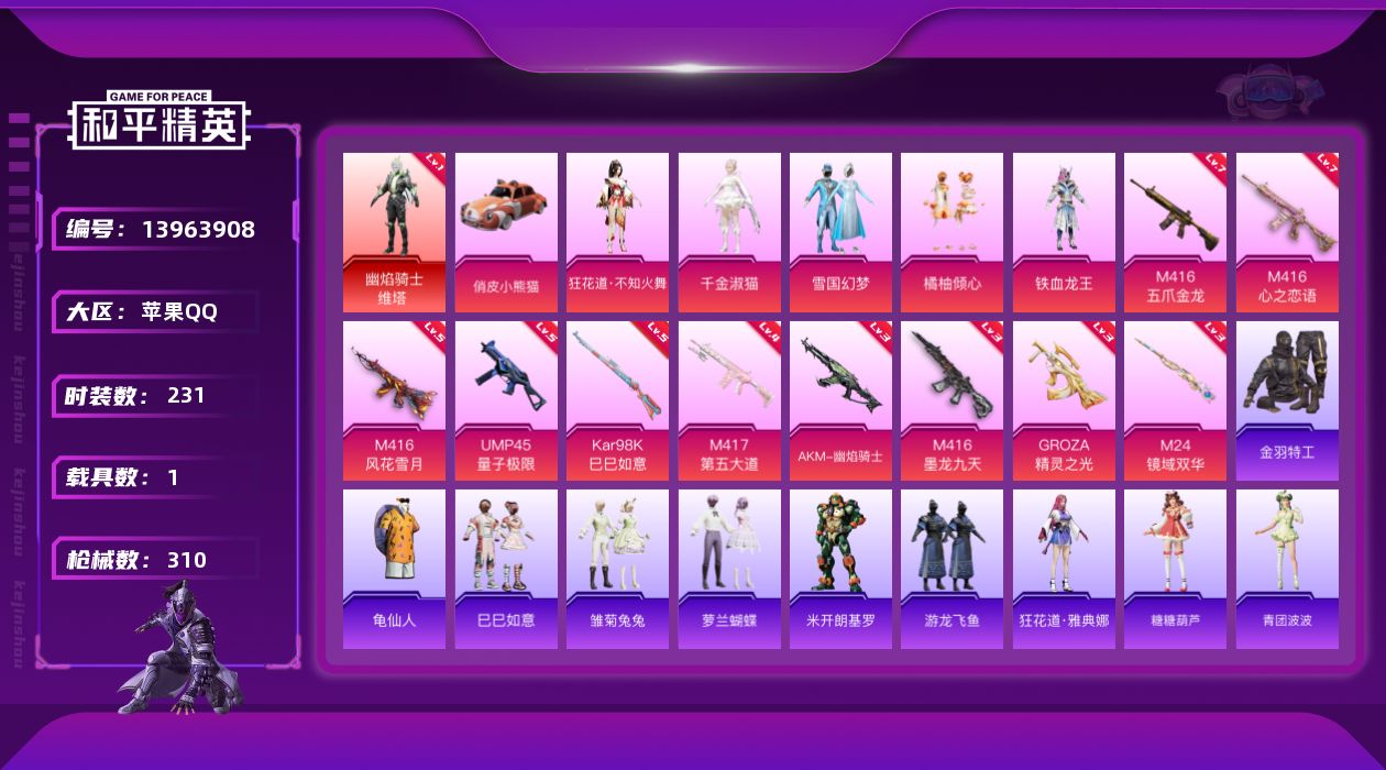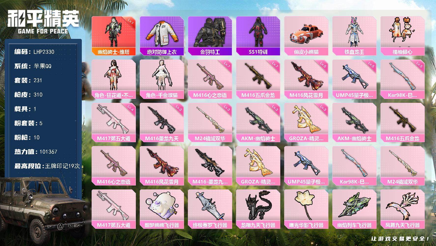 [13963908]【暑期末清货/特价急出/永久包赔/商品详情看图】:苹果 手Q-1红装-5粉装-10特效枪-1载具-10.1w热力值-19印记-231套装-310枪皮【热门品类】:绝对防御上衣,套装-金羽特工,套装-SS1特训【角色神装等级】:幽焰骑士-维塔(一级)【稀有载具】:俏皮小熊猫【特效枪等级】:AKM-幽焰骑士(三级),M416-五爪金龙(七级),M416-心之恋语(七级),M416-风花雪月(五级),M416-墨龙九天(三级),GROZA-精灵之光(三级),UMP45-量子极限(五级),Kar98K-巳巳如意(五级),M24-镜域双华(三级),M417-第五大道(四级)【优质套装】:粉装-雪国幻梦,粉装-铁血龙王,粉装-橘柚倾心,角色-狂花道·不知火舞,角色-千金淑猫【优质飞行器】:酣梦熊熊飞行器,终极赛罗飞行器,龙翔九天飞行器,曦光华影飞行器,幽焰列车飞行器,凤舞九天飞行器,万象金身飞行器