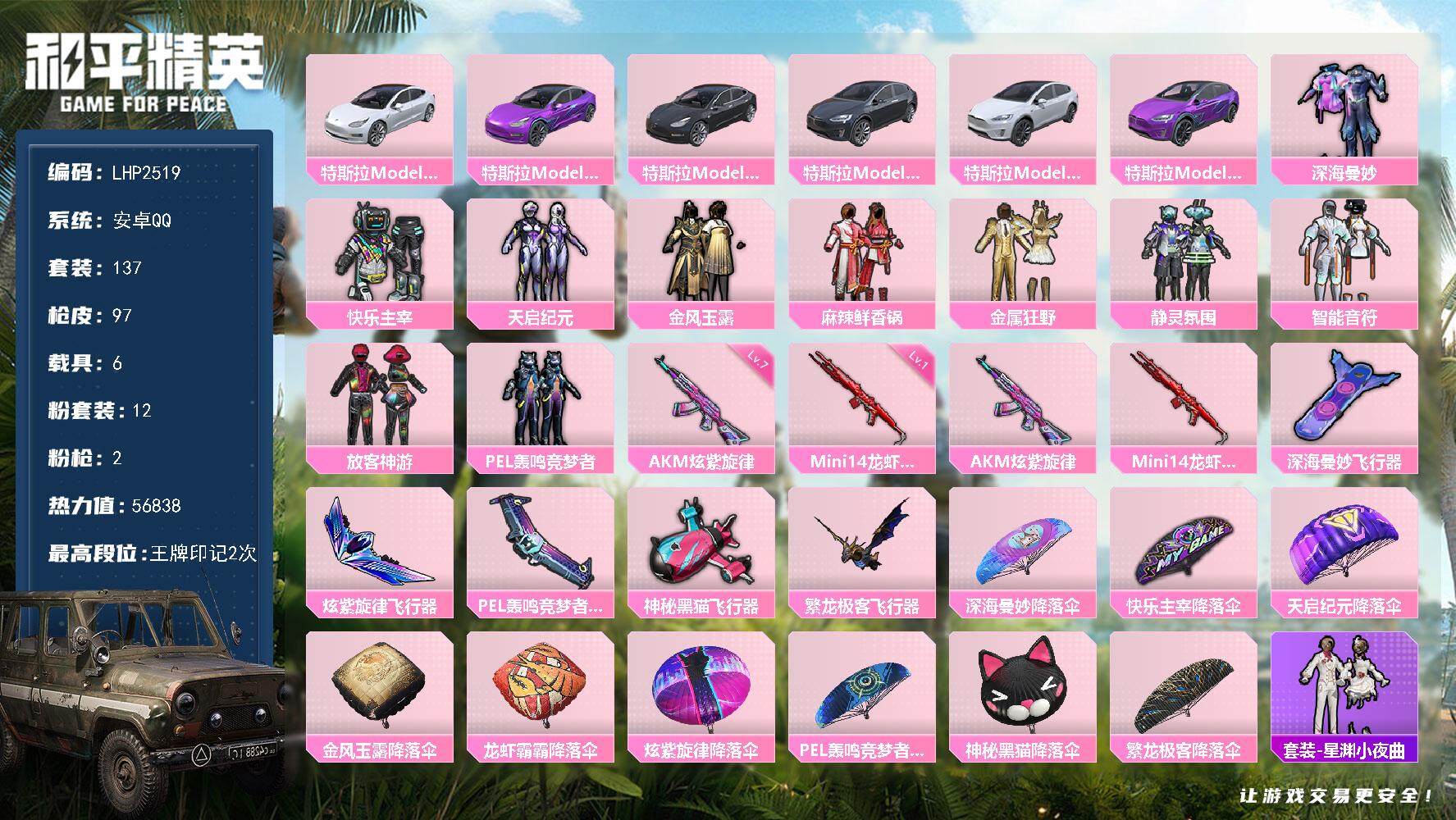 [13963930]【暑期末清货/特价急出/永久包赔/商品详情看图】:安卓 手Q-12粉装-2特效枪-6载具-5.6w热力值-2印记-137套装-97枪皮【稀有载具】:特斯拉Model 3(珍珠白),特斯拉Model 3(奇幻紫),特斯拉Model 3(冷光银),特斯拉Model X(冷光银),特斯拉Model X(珍珠白),特斯拉Model X(奇幻紫)【特效枪等级】:AKM-炫紫旋律(七级),Mini14-龙虾霸霸(一级)【优质套装】:粉装-深海曼妙,粉装-快乐主宰,粉装-天启纪元,粉装-金风玉露,粉装-麻辣鲜香锅,粉装-金属狂野,粉装-静灵氛围,粉装-智能音符,粉装-缤纷油彩,粉装-放客神游,粉装-PEL轰鸣竞梦者,粉装-繁龙极客【优质飞行器】:深海曼妙飞行器,炫紫旋律飞行器,PEL轰鸣竞梦者飞行器,神秘黑猫飞行器,繁龙极客飞行器