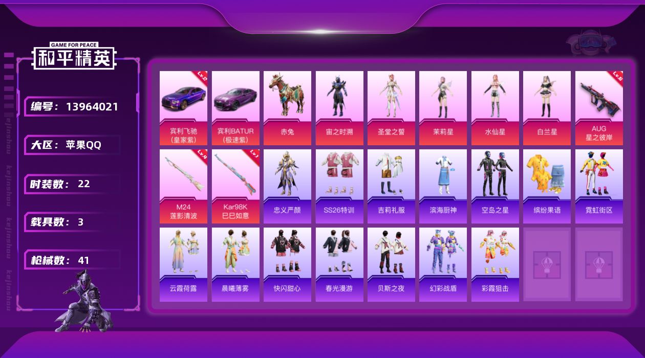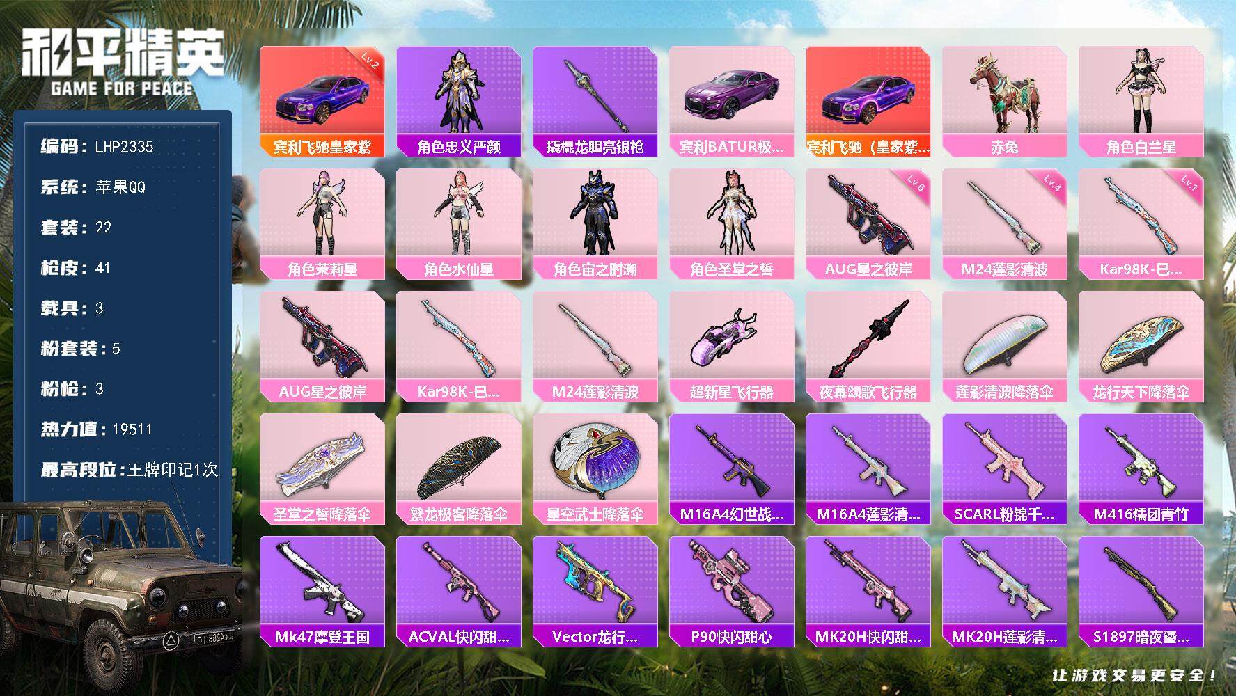 [13964021]地铁满天赋苹果 手Q-5粉装-3特效枪-3载具-1.9w热力值-1印记-22套装-41枪皮【热门品类】:角色-忠义严颜,撬棍-龙胆亮银枪【稀有载具】:宾利BATUR(极速紫),宾利飞驰(皇家紫),赤兔【稀有载具等级】:宾利飞驰(皇家紫)(二级)【特效枪等级】:AUG-星之彼岸(六级),Kar98K-巳巳如意(一级),M24-莲影清波(四级)【优质套装】:角色-白兰星,角色-茉莉星,角色-水仙星,角色-宙之时溯,角色-圣堂之誓【优质武器皮肤】:AUG-星之彼岸,Kar98K-巳巳如意,M24-莲影清波【优质飞行器】:超新星飞行器,夜幕颂歌飞行器
