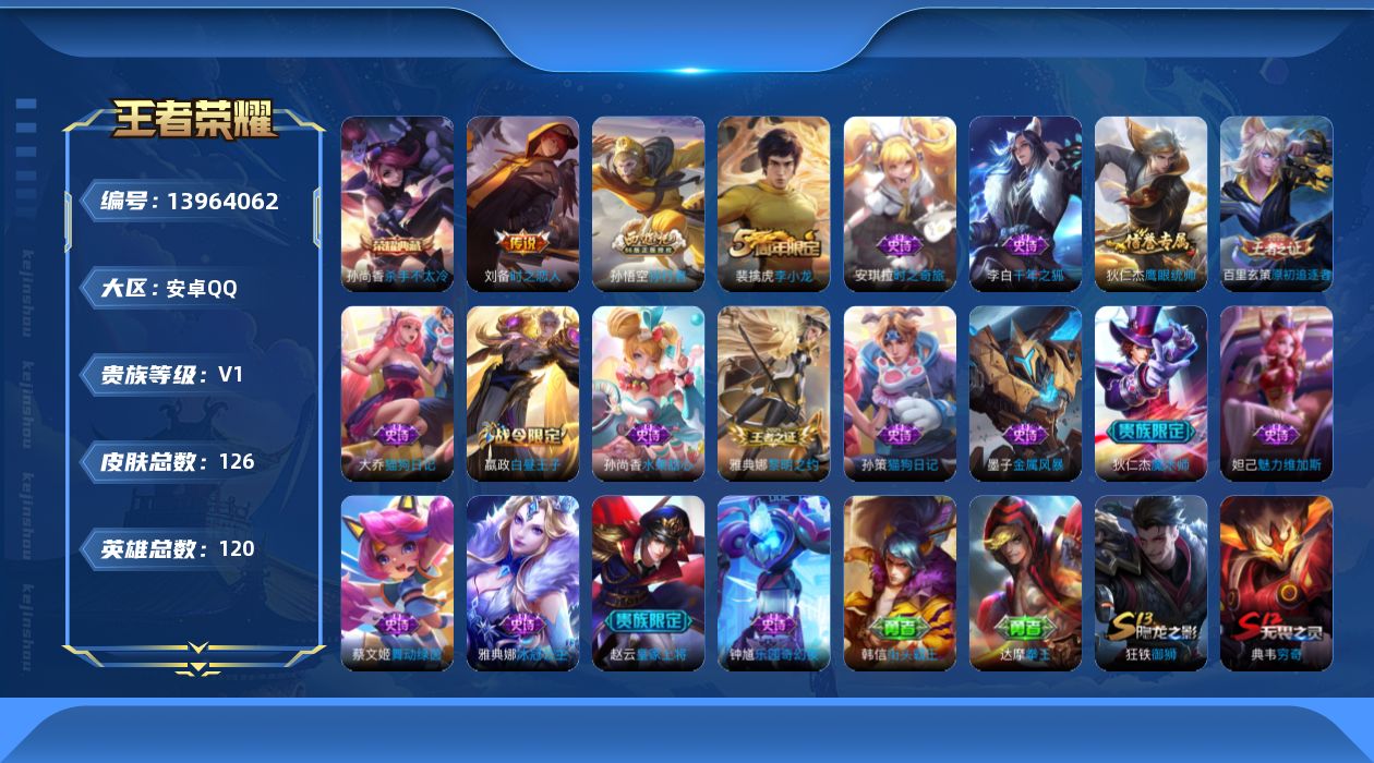 [13964062]【暑期末清货/特价急出/永久包赔】:安卓Q-V0-至尊星耀I段位-120英雄-126皮肤-1典藏-1传说-18史诗
