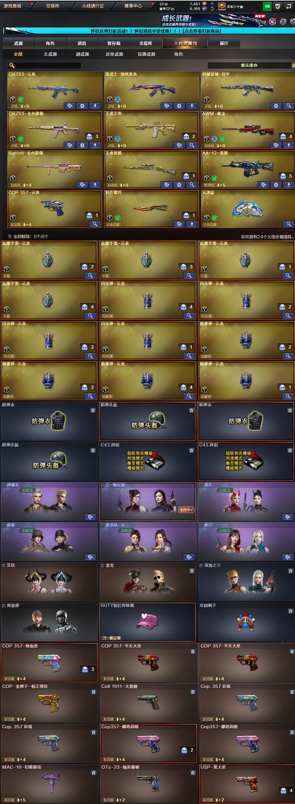 - [12281585]【商品标题】:浙江一区-73V-7王者-0炫金 【传说武器】:传说光耀 【热门武器】:传说光耀,QBZ03-金色蔷薇,HK417-朱雀,M4A1-青龙,M200-竞技荣光,死亡之眼,荣耀世冠-雷神,荣耀世冠-柯尔特,M4A1-黑骑士,汤姆逊-烈龙*6,RPK-盘龙,加特林-炼狱,斯泰尔-蝴蝶,USP-雷暴*2,沙鹰-修罗 【音效卡】:AK47-火麒麟音效卡,Barrett-毁灭音效卡 【稀有皮肤】:雷神-荣耀之魄,AK47-火麒麟-传奇EVEN,火麒麟-荣耀世冠AG,火麒麟-心动糖果,毁灭-荣耀之怒,毁灭-风暴,屠龙-荣耀之锋,屠龙-荣耀世冠AG 【角色】:王者潘多拉,零-水下丽影,灵狐者-职业经理,葵,春,电竞教官-云悠悠,战地猎狐,蜀雪,铁骑荣耀,甜心偶像 【人偶武器】:斯泰尔-蝴蝶,天龙-曼陀罗,AK47-SS-刀锋,AWM-灵狐-15周年嘉年华*2,COP-旗袍,迷你深渊冰龙,迷你巨石泰坦-魔花研究所,迷你波特博士,夺魂,迷你生化手雷*2,生化手雷-机甲核心*3,深渊终结者手雷*2 【暴走生化】:斯泰尔-蝴蝶,死亡之眼,超级对讲机 【挑战大师】:神圣爆裂者-末日III*2,KAC-圣炎切割者III,试炼破坏者III,激光毁灭者III-白马银枪*2 【英雄级武器】:COP 357-云龙,M200-竞技荣光,柯尔特-竞技荣光,擎天-竞技荣光,高爆手雷-竞技荣光,烟雾弹-竞技荣光,闪光弹-竞技荣光,柯尔特-电竞装甲,AK47-雷暴,USP-雷暴*2,斩神刀-雷暴,荣耀世冠-雷神,荣耀世冠-柯尔特,手雷-动感闪耀,QBZ03-金色蔷薇,HK417-朱雀,M4A1-青龙,M4A1-雷神,M4A1-黑骑士,RPK-盘龙,加特林-炼狱,汤姆逊-烈龙*6,AK47-火麒麟,Barrett-毁灭,Barrett-朱雀,黑武士-锦绣游龙,黑骑士-海王,M4A1-赤狱骑士,沙鹰-天神,沙鹰-修罗,擎天,龙啸,屠龙*2 【特殊枪械】:蝴蝶斯泰尔+6烈龙,1黑骑士,6烈龙,1盘龙,1炼狱,1蝴蝶斯泰尔