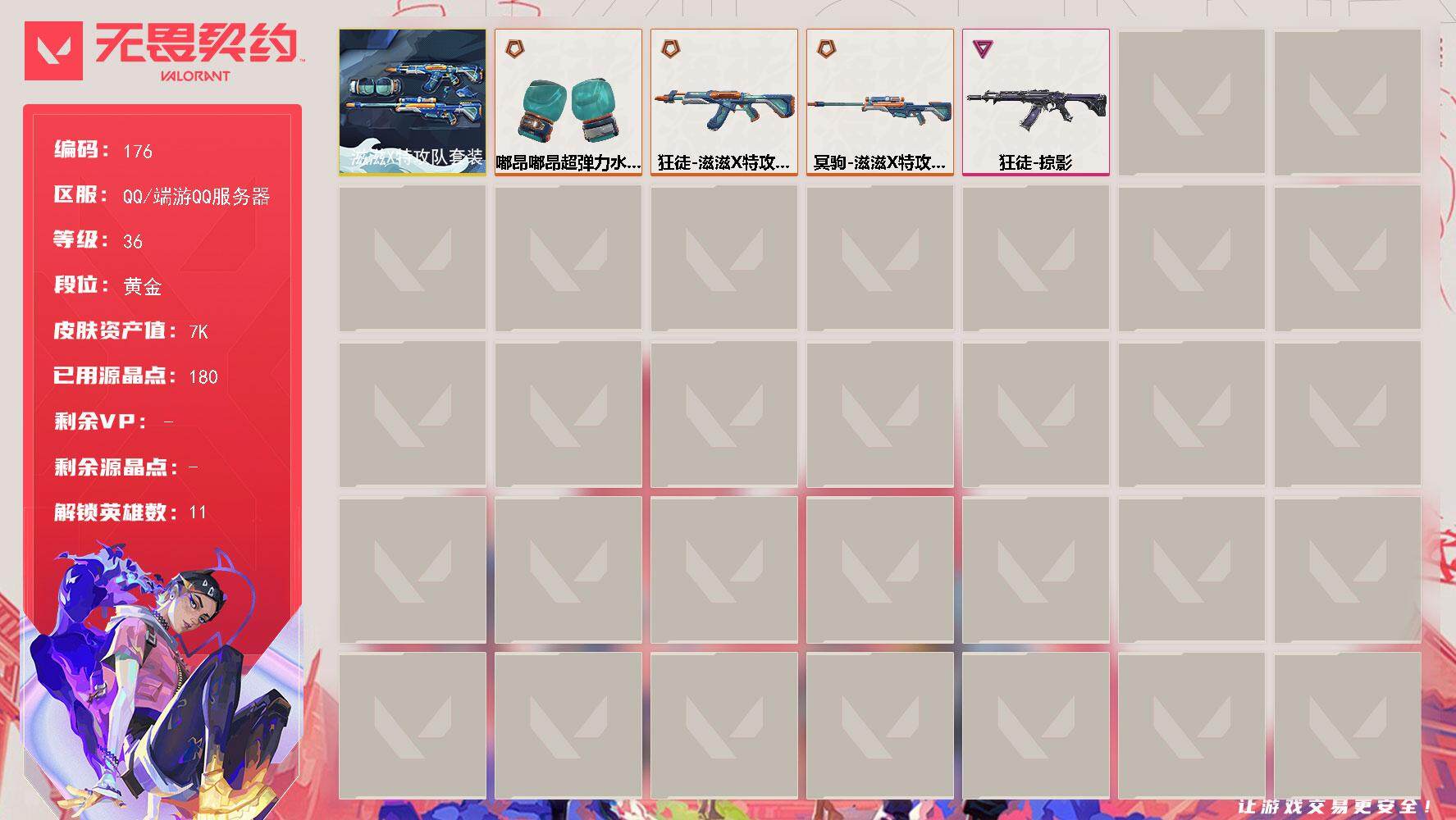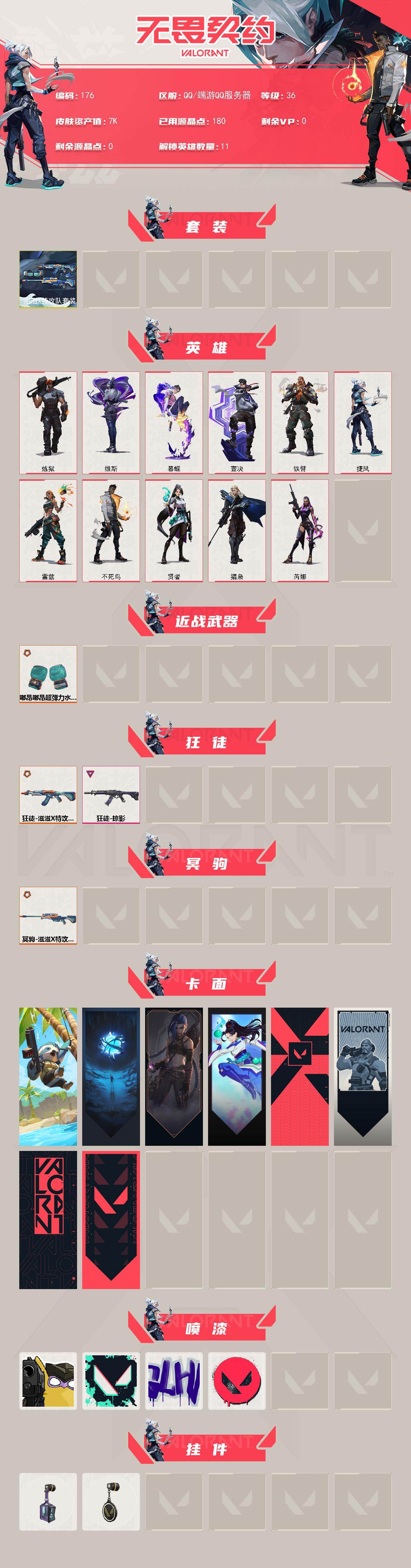[13973426]【套装】:滋滋X特攻队套装 【英雄】:炼狱,维斯,暮蝶,壹决,铁臂,捷风,雷兹,不死鸟,贤者,猎枭,芮娜 【近战 武器】:近战武器-嘟昂嘟昂超弹力水球拳套 【狂徒】:狂徒-滋滋X特攻队,狂徒-掠影 【冥驹】:冥驹-滋滋X特攻队 【卡面】:树懒大作战 卡面,无垠星环 卡面,《双城之战》金克丝 卡面,无畏契约GO!第一卷:贤者 卡面,代号红色 卡面,新兵报到 卡面,V契约 卡面,无畏契约 卡面 【喷漆】:放下武器 喷漆,胜利属于无畏契约 喷漆,GLHF 喷漆,无畏契约 喷漆 【挂饰】:动力机箱 挂饰,无畏契约 纪念币 挂饰