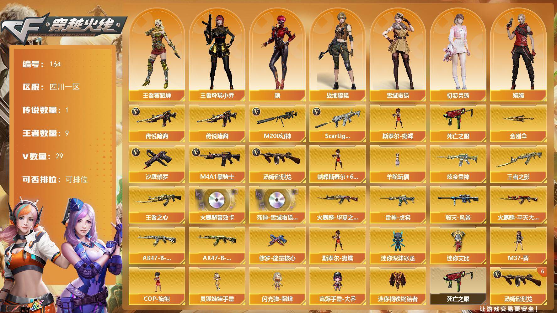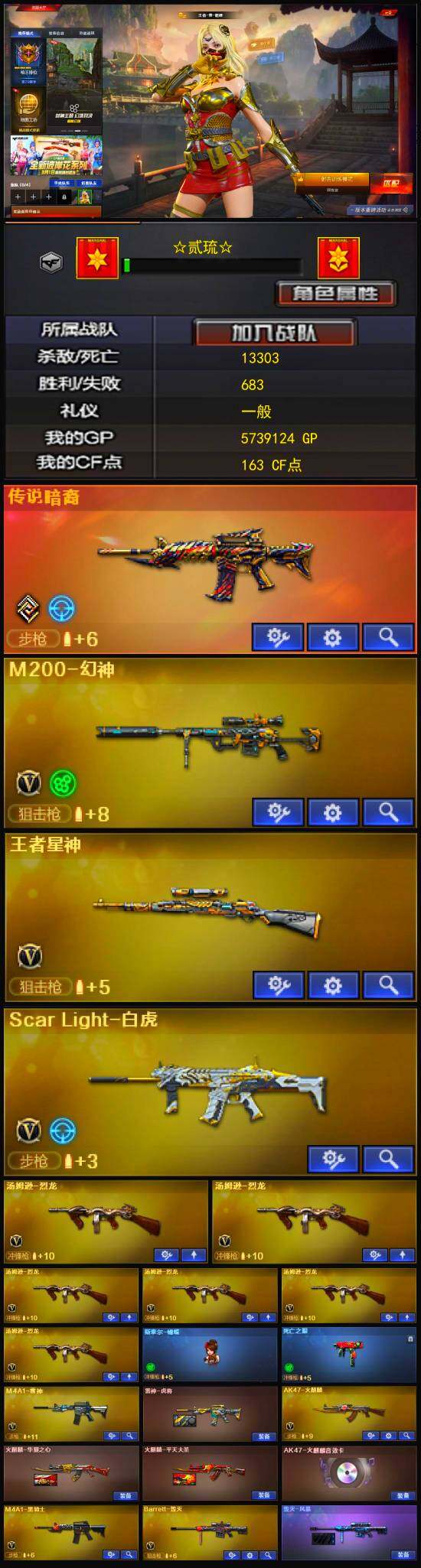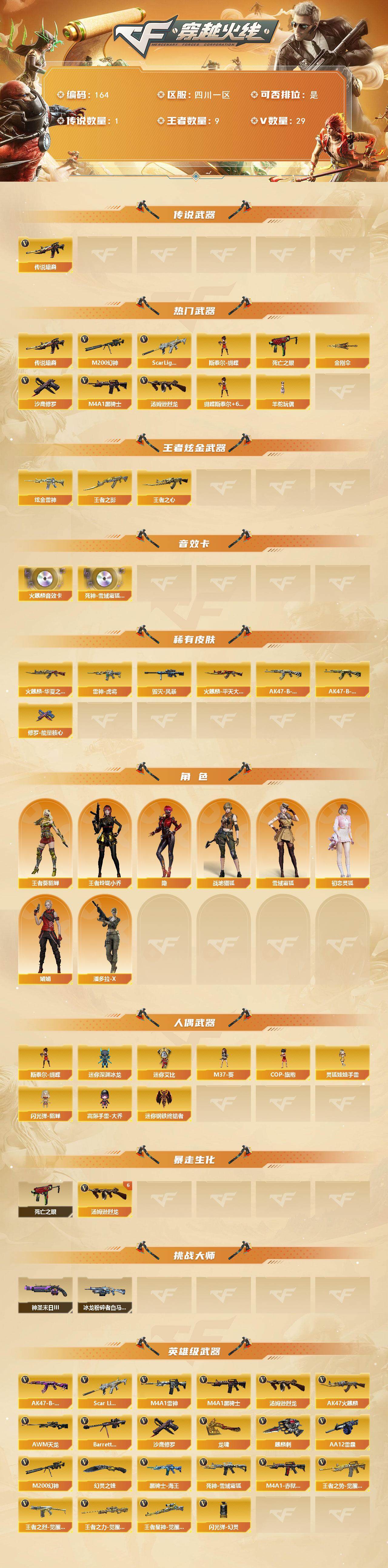 [13974096]四川一区-29V-9王者-1炫金 【传说武器】:传说暗裔 【热门武器】:传说暗裔,Scar Light-白虎,M200-幻神,死亡之眼,M4A1-黑骑士,汤姆逊-烈龙*6,斯泰尔-蝴蝶,羊驼玩偶,沙鹰-修罗,金刚伞 【王者炫金武器】:王者之影,王者之心,炫金雷神 【音效卡】:AK47-火麒麟音效卡,死神-雪域霜狐-怀旧音效卡 【皮肤】:雷神-虎将,火麒麟-华夏之心,火麒麟-平天大圣,毁灭-风暴,AK47-B-常胜将军-刘备,AK47-B-常胜将军-孙权*2,修罗-能量核心 【角色】:隐,战地猎狐,王者-葵-貂蝉,王者玲珑-小乔,雪域霜狐,初恋灵狐,娟娟,潘多拉-X 【人偶武器】:迷你钢铁终结者,斯泰尔-蝴蝶,M37-葵,COP-旗袍,迷你深渊冰龙,闪光弹-貂蝉,高爆手雷-大乔,迷你艾比,灵狐娃娃手雷 【暴走生化】:死亡之眼 【挑战大师】:冰龙粉碎者-白马银枪*2,神圣爆裂者-末日III 【英雄级武器】:AK47-火麒麟,M4A1-雷神,M4A1-黑骑士,Scar Light-白虎,死神-雪域霜狐,王者之势-觉醒版,黑骑士-海王,AK47-B-常胜将军,王者之烈-觉醒版,AWM-天龙,Barrett-毁灭,M200-幻神,王者之力-觉醒版,王者星神-觉醒版,汤姆逊-烈龙*6,AA-12-雷霆,沙鹰-修罗,龙啸,麒麟刺,幻灵之锋,闪光弹-幻灵,M4A1-赤狱骑士 【道具】:女皇终结者-背包,背包-洛丽塔,超级背包,雪域霜狐炫彩背包,圣拳猎手-炽雪,女皇终结者-魔龙之吻,救世主-黑桃战神,黄金生化钩,绿色巨人,灵魂忍者,变异宝贝,迷雾幽灵,夺命之镰,防化服*2,流光-再燃火线,语音特效-怀旧,雪域霜狐表情,CFPL选手表情-第1套,EP战队名片,C4-沙漠,防弹头盔*2,防弹衣*2,C4工具钳*3,手雷包*3 【特殊枪械】:蝴蝶斯泰尔+6烈龙,1白虎,1黑骑士,6烈龙,1蝴蝶斯泰尔