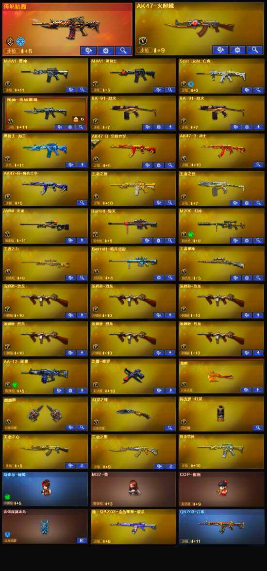 【英雄级武器】:AK47-火麒麟,M4A1-雷神,M4A1-黑骑士,Scar Light-白虎,死神-雪域霜狐,王者之势-觉醒版,黑骑士-海王,AK47-B-常胜将军,王者之烈-觉醒版,AWM-天龙,Barrett-毁灭,M200-幻神,王者之力-觉醒版,王者星神-觉醒版,汤姆逊-烈龙*6,AA-12-雷霆,沙鹰-修罗,龙啸,麒麟刺,幻灵之锋,闪光弹-幻灵,M4A1-赤狱骑士