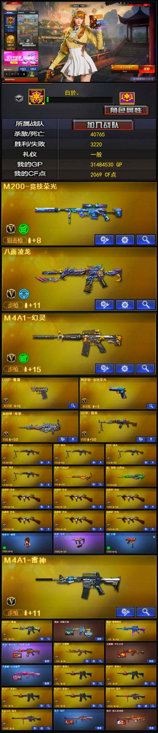【热门武器】:M200-竞技荣光,八面凌龙,死亡之眼,M4A1-黑骑士*4,汤姆逊-烈龙*6,RPK-盘龙*5,加特林-炼狱,斯泰尔-蝴蝶,USP-雷暴,沙鹰-修罗*5