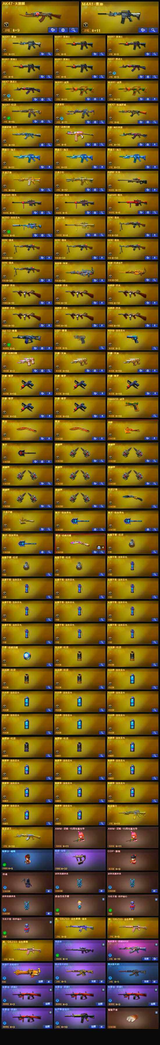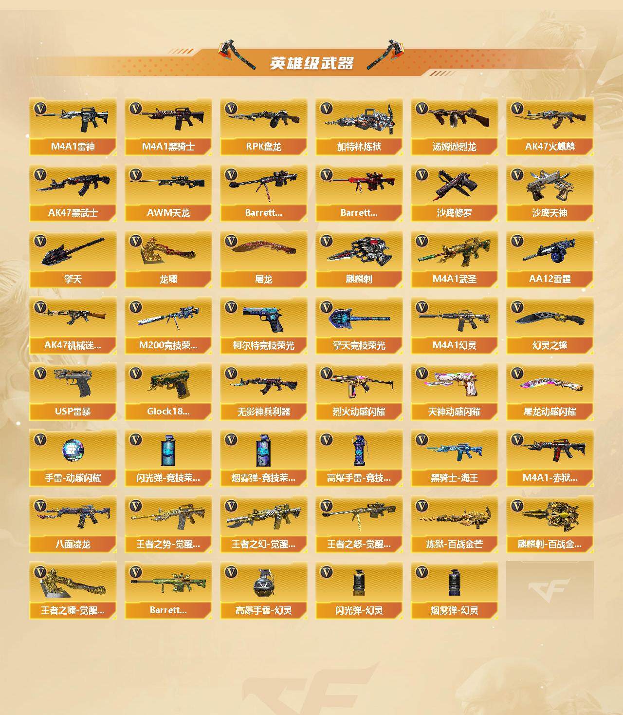 【英雄级武器】:AK47-火麒麟,M4A1-雷神*2,M4A1-黑骑士*4,AK47-黑武士*2,M4A1-武圣*2,AK47-机械迷城,M4A1-幻灵,无影-神兵利器,八面凌龙,烈火-动感闪耀,王者之势-觉醒版,王者之幻-觉醒版,黑骑士-海王*3,AWM-天龙,Barrett-毁灭*2,Barrett-极光,M200-竞技荣光,王者之怒-觉醒版,RPK-盘龙*5,加特林-炼狱,炼狱-百战金芒,汤姆逊-烈龙*6,AA-12-雷霆,沙鹰-修罗*5,沙鹰-天神*2,USP-雷暴,柯尔特-竞技荣光,Glock18-武圣,天神-动感闪耀,屠龙*2,龙啸,擎天,麒麟刺*7,幻灵之锋,擎天-竞技荣光*3,屠龙-动感闪耀,麒麟