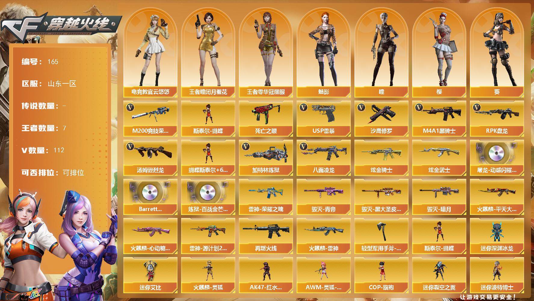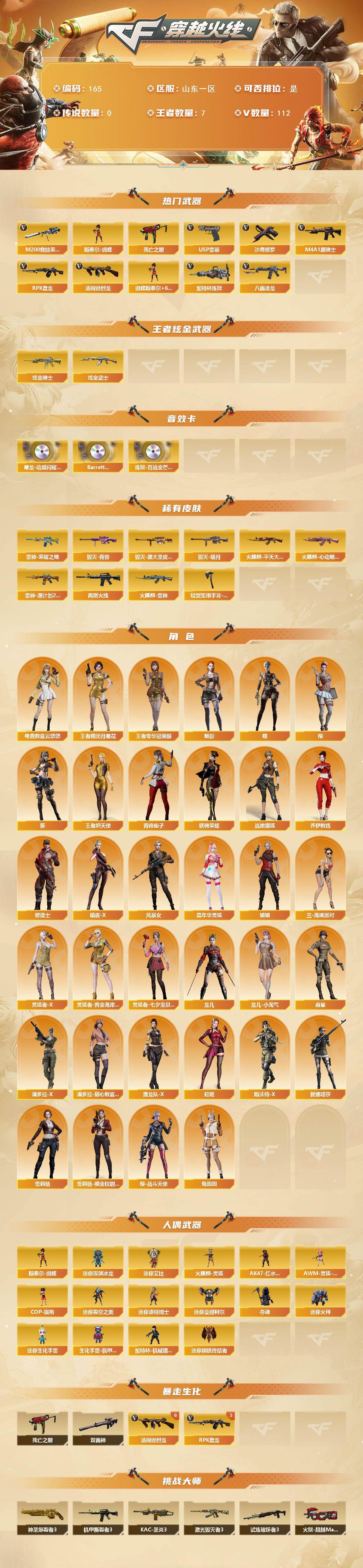 [13974580]山东一区-112V-7王者-2炫金 【热门武器】:M200-竞技荣光,八面凌龙,死亡之眼,M4A1-黑骑士*4,汤姆逊-烈龙*6,RPK-盘龙*5,加特林-炼狱,斯泰尔-蝴蝶,USP-雷暴,沙鹰-修罗*5 【王者炫金武器】:炫金骑士,炫金武士 【音效卡】:屠龙-动感闪耀 音效卡,Barrett-碧霄极光音效卡,炼狱-百战金芒-庆典舞曲音效卡 【皮肤】:雷神-荣耀之魄,雷神-源计划2.0专属 皮肤,M4A1-再燃火线,火麒麟-雷神,火麒麟-平天大圣,火麒麟-心动糖果,毁灭-暗月,毁灭-黑大圣皮肤,毁灭-青帝,轻型军用手斧-再燃火线 【角色】:葵,樱,瞳,魅影,电竞教官-云悠悠,战地猎狐,王者-瞳-闭月羞花,王者零-华冠丽服,王者炽天使,乔伊教练,修道士,暗夜-X,风暴女,嘉年华灵狐,娟娟,兰-海滩派对,灵狐者-X,灵狐者-黄金海岸,灵狐者-七夕宝贝,龙儿,龙儿-小淘气,麻雀,潘多拉-X,潘多拉-甜心教官,潜龙队-X,青霞仙子,蛇姬,斯沃特-X,铁骑荣耀,兔囡囡,新娜塔莎,雪莉杨,雪莉杨-摸金校尉,樱-战斗天使 【人偶武器】:火麒麟-灵狐,迷你钢铁终结者,斯泰尔-蝴蝶,加特林-机械猎手,AK47-红水晶-斯沃特精英,AWM-灵狐-15周年嘉年华*2,COP-旗袍,迷你深渊冰龙*3,迷你裂空之翼*2,迷你波特博士*7,迷你曼提柯尔,夺魂,迷你火种*8,迷你生化手雷,生化手雷-机甲核心*2,迷你艾比 【暴走生化】:双面神,死亡之眼 【挑战大师】:火狱乱世-超越Max,神圣爆裂者III,激光毁灭者III,机甲撕裂者III,试炼破坏者III,KAC-圣炎切割者III 【英雄级武器】:AK47-火麒麟,M4A1-雷神*2,M4A1-黑骑士*4,AK47-黑武士*2,M4A1-武圣*2,AK47-机械迷城,M4A1-幻灵,无影-神兵利器,八面凌龙,烈火-动感闪耀,王者之势-觉醒版,王者之幻-觉醒版,黑骑士-海王*3,AWM-天龙,Barrett-毁灭*2,Barrett-极光,M200-竞技荣光,王者之怒-觉醒版,RPK-盘龙*5,加特林-炼狱,炼狱-百战金芒,汤姆逊-烈龙*6,AA-12-雷霆,沙鹰-修罗*5,沙鹰-天神*2,USP-雷暴,柯尔特-竞技荣光,Glock18-武圣,天神-动感闪耀,屠龙*2,龙啸,擎天,麒麟刺*7,幻灵之锋,擎天-竞技荣光*3,屠龙-动感闪耀,麒麟