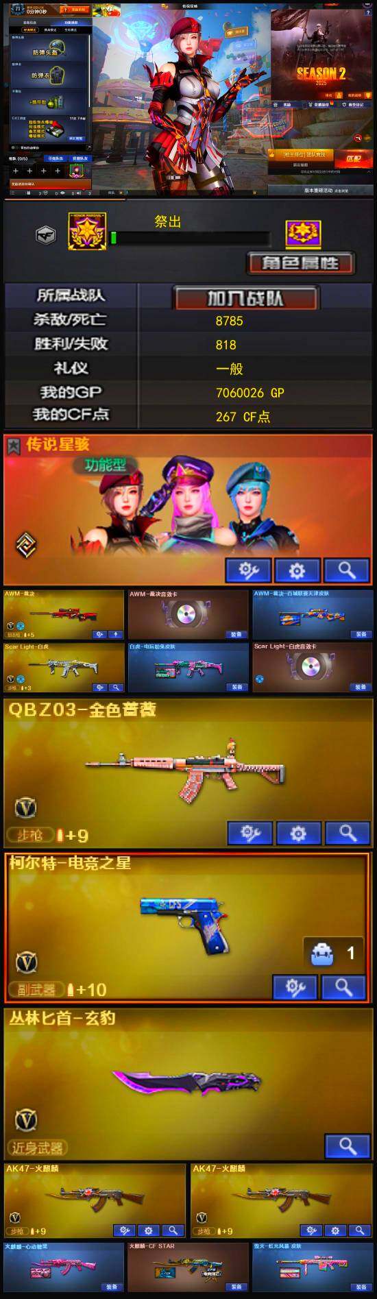 - [13080513]北方大区-59V-6王者-0炫金 【传说武器】:传说圣谕,传说幽冥 【热门武器】:传说圣谕,传说幽冥,G36C-幻影,QBZ03-金色蔷薇,M200-幻神*2,金色蔷薇-古蛇迷踪,修罗-古蛇迷踪,M200-竞技荣光,荣耀世冠-柯尔特,M4A1-黑骑士,沙鹰-修罗,炽芒蝶刃,炽芒蝶刃-破浪逐光 皮肤 【王者炫金武器】:王者凌虎 【音效卡】:擎天-云海游龙音效卡,QBZ03-金色蔷薇音效卡,炼狱-百战金芒-庆典舞曲音效卡,死神-雪域霜狐-怀旧音效卡 【皮肤】:幻神-电流骇客 皮肤,金色蔷薇-破浪逐光 皮肤,裁决-流光秘银,裁决-运输船 皮肤,雷神-耀金皮肤,雷神-CFS十周年纪念版 皮肤,雷神-化蛇 皮肤,雷神-春花弄影 皮肤,M4A1-再燃火线,火麒麟-轻羽皮肤,火麒麟-新春kwai乐,毁灭-星空,毁灭-CFS2020,毁灭-百城浙江 皮肤,毁灭-秦师 皮肤,黑骑士-CFS2021,烈火-动感闪耀 皮肤,修罗-星空,屠龙-破浪逐光 皮肤,屠龙-惊鸿 皮肤,轻型军用手斧-再燃火线,擎天-蒸汽钟表 皮肤,擎天-梧桐 皮肤,麒麟刺-甜蜜糖果 皮肤,麒麟刺-月皮肤,炽芒蝶刃-破浪逐光 皮肤 【角色】:电竞教官-云悠悠,隼,战地猎狐,蛇隐宗,雪域霜狐 【人偶武器】:Scar Light-马枪,迷你巨石泰坦-魔花研究所,夺魂,迷你牛牛 【暴走生化】:超级对讲机 【挑战大师】:神圣爆裂者-末日III 【英雄级武器】:AK47-火麒麟,M4A1-黑龙,M4A1-雷神,M4A1-黑骑士,M4A1-死神,G36C-幻影,黑武士-锦绣游龙,超新星-热带奇洋,金色蔷薇-古蛇迷踪,死神-雪域霜狐,QBZ03-金色蔷薇,Barrett-毁灭,AWM-裁决,M200-幻神*2,M200-竞技荣光,王者风神-觉醒版,炼狱-百战金芒,炼狱-风暴,AA-12-雷霆,沙鹰-修罗,沙鹰-天神,荣耀世冠-柯尔特,柯尔特-竞技荣光*2,修罗-古蛇迷踪,USP-冥王,屠龙*3,擎天*3,麒麟刺*2,擎天-竞技荣光,炽芒蝶刃,龙啸-热带奇洋,麒麟刺-百战金芒,高爆手雷-竞技荣光*7,高爆手雷-云龙*2,手雷-热带奇洋,高爆手雷-古蛇迷踪,高爆手雷-雷霆王者,闪光弹-竞技荣光*7,烟雾弹-竞技荣光*2,烟雾弹-古蛇迷踪,M4A1-赤狱骑士 【特殊枪械】:1黑骑士