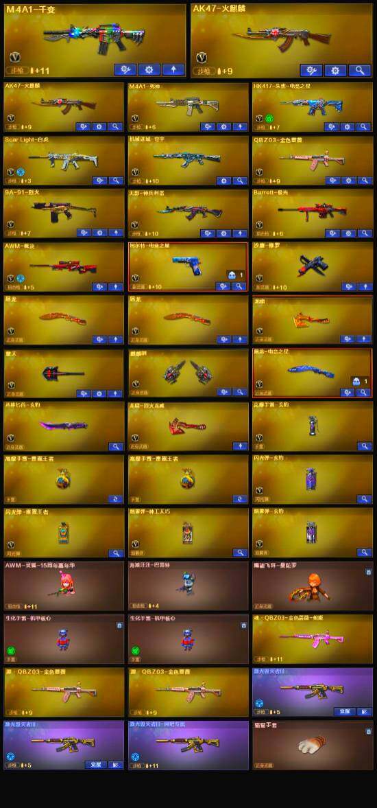 【英雄级武器】:M4A1-千变,AK47-火麒麟*2,M4A1-死神,Scar Light-白虎,无影-神兵利器,QBZ03-金色蔷薇,Barrett-极光,AWM-裁决,沙鹰-修罗,屠龙*2,龙啸,擎天,麒麟刺,麒麟刺-百战金芒,丛林匕首-玄豹,高爆手雷-玄豹,闪光弹-玄豹,闪光弹-雷霆王者-觉醒版,烟雾弹-神工天巧,烟雾弹-玄豹,M4A1-赤狱骑士,AWM-昌龙,Barrett-碧霄极光