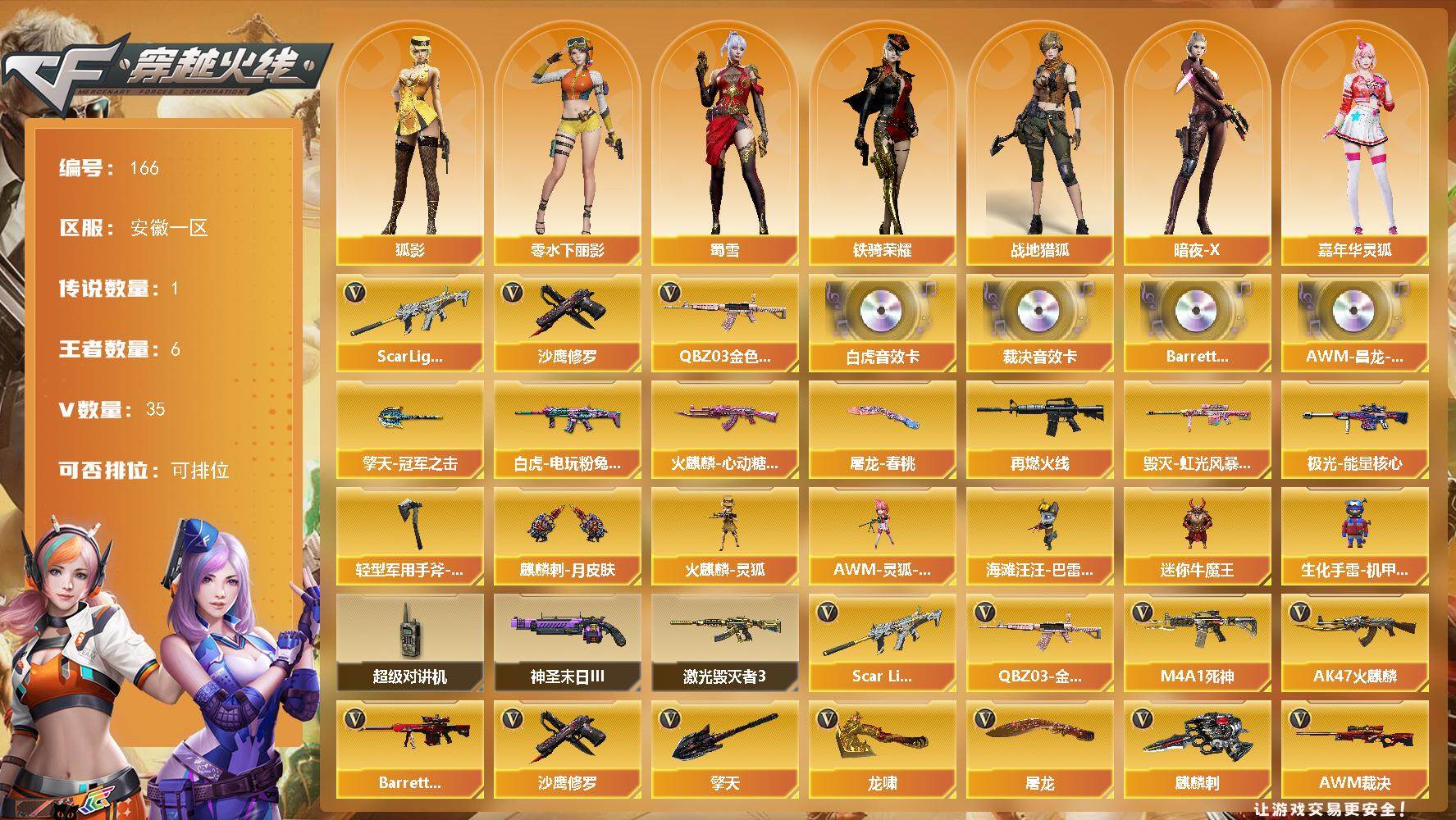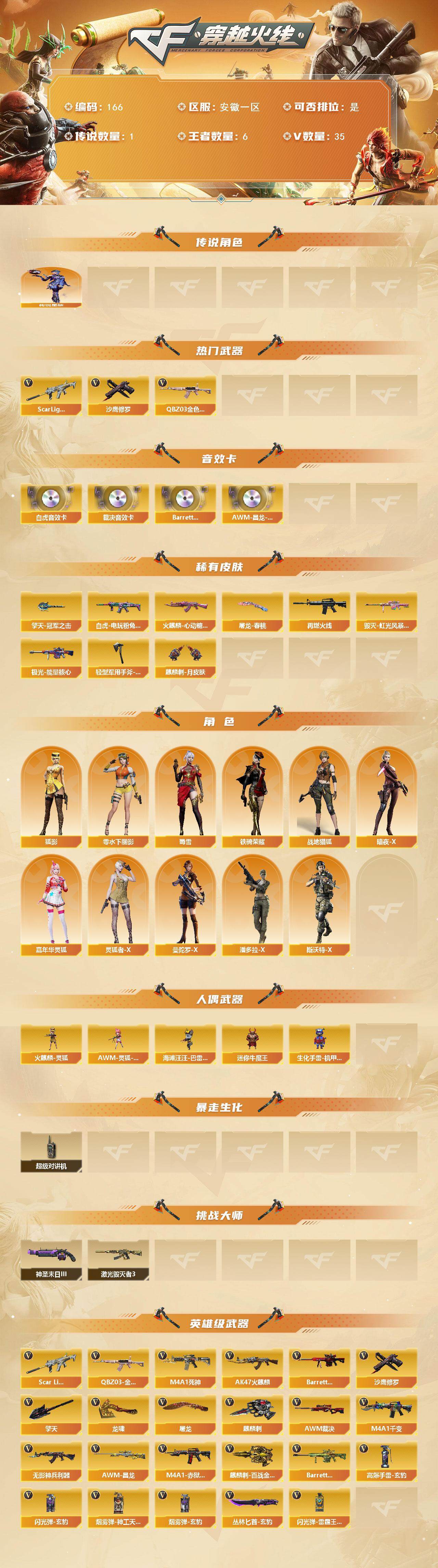 [13974995]安徽一区-35V-6王者-0炫金 【传说角色】:传说星骇 【热门武器】:QBZ03-金色蔷薇,Scar Light-白虎,沙鹰-修罗 【音效卡】:AWM-裁决音效卡,Scar Light-白虎音效卡,Barrett-碧霄极光音效卡,AWM-昌龙-怀旧音效卡 【皮肤】:白虎-电玩粉兔皮肤,M4A1-再燃火线,火麒麟-心动糖果,毁灭-虹光风暴 皮肤,极光-能量核心,屠龙-春桃 皮肤,轻型军用手斧-再燃火线,擎天-冠军之击,麒麟刺-月皮肤 【角色】:战地猎狐,狐影,暗夜-X,嘉年华灵狐,零-水下丽影,灵狐者-X,曼陀罗-X,潘多拉-X,斯沃特-X,蜀雪,铁骑荣耀 【人偶武器】:火麒麟-灵狐,AWM-灵狐-15周年嘉年华,海滩汪汪-巴雷特,迷你牛魔王,生化手雷-机甲核心*2 【暴走生化】:超级对讲机 【挑战大师】:激光毁灭者III*2,神圣爆裂者-末日III 【英雄级武器】:M4A1-千变,AK47-火麒麟*2,M4A1-死神,Scar Light-白虎,无影-神兵利器,QBZ03-金色蔷薇,Barrett-极光,AWM-裁决,沙鹰-修罗,屠龙*2,龙啸,擎天,麒麟刺,麒麟刺-百战金芒,丛林匕首-玄豹,高爆手雷-玄豹,闪光弹-玄豹,闪光弹-雷霆王者-觉醒版,烟雾弹-神工天巧,烟雾弹-玄豹,M4A1-赤狱骑士,AWM-昌龙,Barrett-碧霄极光 【道具】:BS战队炫彩背包,云山科技背包,亚洲杯纪念炫彩背包,奇洋探员-海龟背包,炫彩背包-诺拉,炫彩背包,百战金芒炫彩背包,超级背包,哔哩哔哩名片,女皇终结者-魔龙之吻,救世主-黑桃战神,黄金生化钩,绿色巨人,灵魂忍者,迷雾幽灵,夺命之镰,防化服*3,金色流光-枪王排位*2,流光-再燃火线,语音特效-盛典烟火,萌萌小葵表情,斯沃特表情,C4-黑曜,防弹头盔*3,防弹衣*3,C4工具钳*3,手雷包*3 【特殊枪械】:1白虎