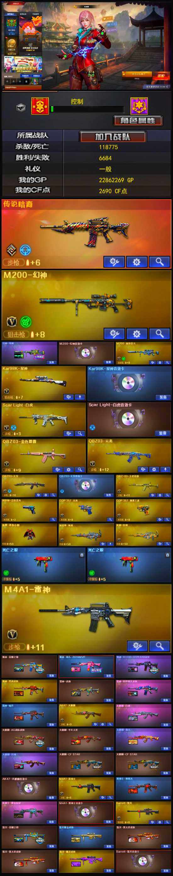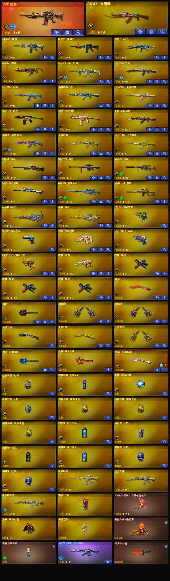 【热门武器】:传说暗裔,QBZ03-金色蔷薇,Scar Light-白虎,M200-幻神,M200-竞技荣光,死亡之眼*2,Kar98K-星神,炼狱-迷你小钢,M4A1-黑骑士,加特林-炼狱,羊驼玩偶,雷神-小红,沙鹰-修罗*3