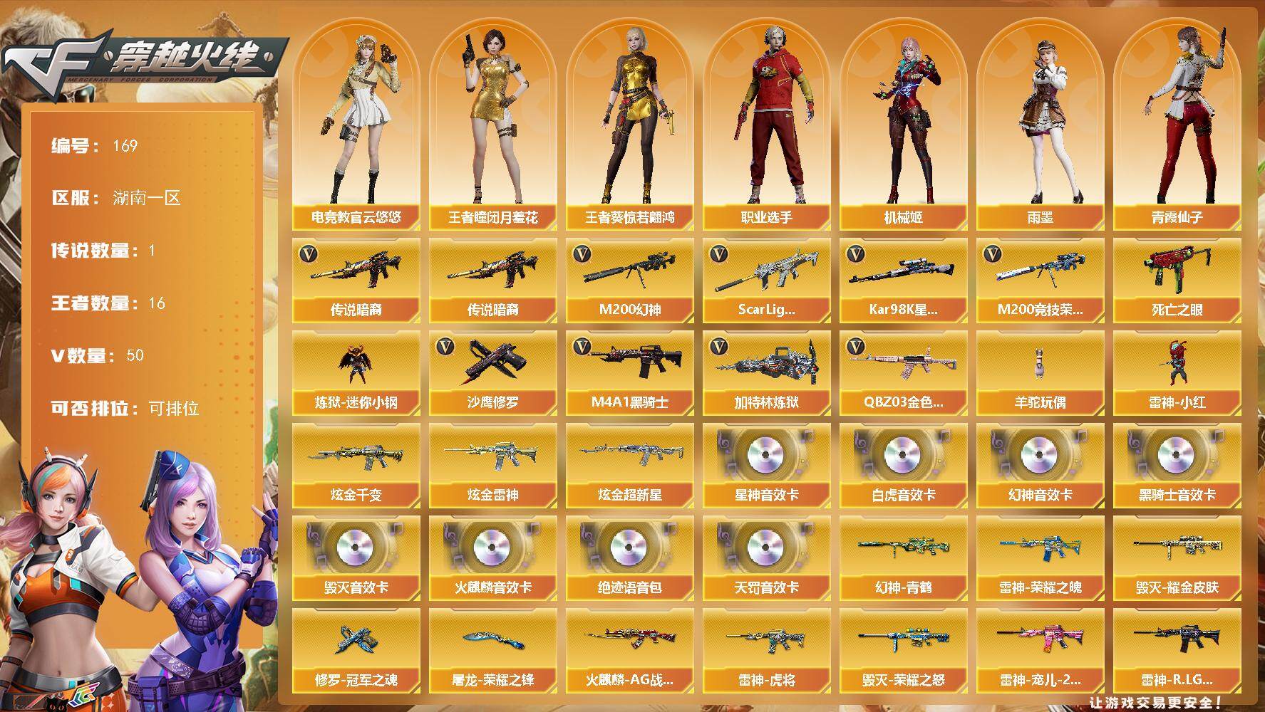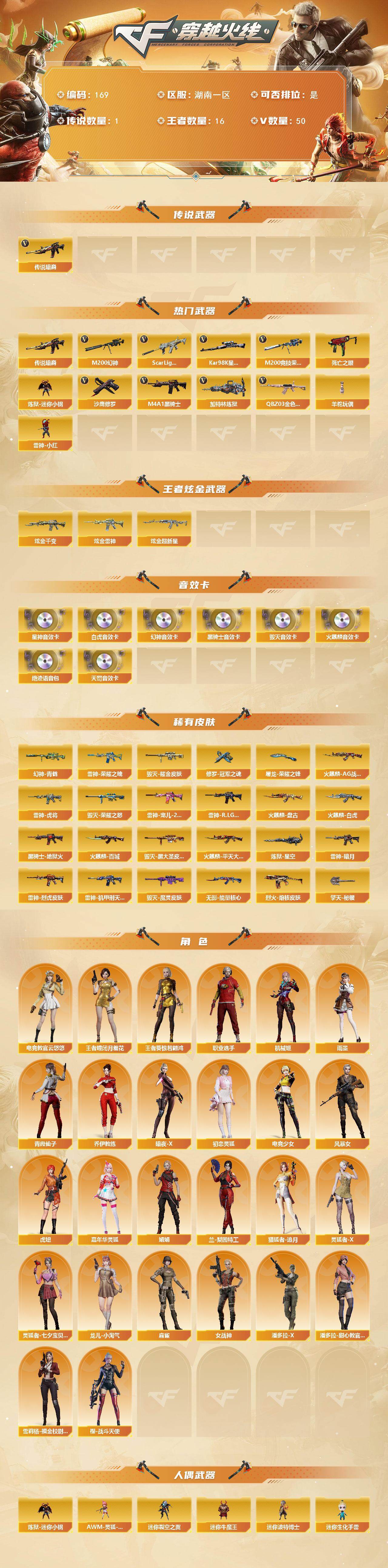 [13975725]湖南一区-50V-16王者-3炫金 【传说武器】:传说暗裔 【热门武器】:传说暗裔,QBZ03-金色蔷薇,Scar Light-白虎,M200-幻神,M200-竞技荣光,死亡之眼*2,Kar98K-星神,炼狱-迷你小钢,M4A1-黑骑士,加特林-炼狱,羊驼玩偶,雷神-小红,沙鹰-修罗*3 【王者炫金武器】:炫金千变,炫金雷神,炫金超新星 【音效卡】:M200-幻神音效卡,AK47-火麒麟音效卡,M4A1-黑骑士音效卡,Barrett-毁灭音效卡,Scar Light-白虎音效卡,绝迹语音包,Kar98K-星神音效卡,QBZ03-天罚音效卡 【皮肤】:幻神-青鹤,雷神-暗月,雷神-荣耀之魄,雷神-虎将,雷神-宠儿-2019MVP,雷神-R.LGD-CFPLS18冠军,雷神-烈虎皮肤,雷神-机甲刑天皮肤,火麒麟-AG战队皮肤,火麒麟-平天大圣,火麒麟-盘古,火麒麟-白虎,火麒麟-百城,毁灭-荣耀之怒,毁灭耀金皮肤,毁灭-黑大圣皮肤*2,毁灭-魔灵皮肤,黑骑士-地狱火,无影-能量核心,烈火-熔核皮肤,炼狱-星空,修罗-冠军之魂,屠龙-荣耀之锋,擎天-秘银 【角色】:电竞教官-云悠悠,雨墨,机械姬,王者-瞳-闭月羞花,王者葵-惊若翩鸿,乔伊教练,暗夜-X,初恋灵狐,电竞少女,风暴女,虎妞,嘉年华灵狐,娟娟,兰-梨园特工,猎狐者-追月,灵狐者-X,灵狐者-七夕宝贝,龙儿-小淘气,麻雀,女战神,潘多拉-X,潘多拉-甜心教官,青霞仙子,雪莉杨-摸金校尉,樱-战斗天使,职业选手 【人偶武器】:雷神-小红,炼狱-迷你小钢,迷你宝贝,AWM-灵狐-15周年嘉年华,迷你裂空之翼,迷你牛魔王,迷你波特博士*2,迷你生化手雷,深渊终结者手雷 【暴走生化】:死亡之眼*2 【挑战大师】:冰龙粉碎者-白马银枪*2,激光毁灭者III-白马银枪,神圣爆裂者-末日III 【英雄级武器】:AK47-火麒麟,M4A1-雷神,M4A1-黑骑士,AK12-天启,AK47-黑鲨,Scar Light-白虎,QBZ03-天罚,无影-神兵利器,QBZ03-云龙,黑武士-锦绣游龙,QBZ03-金色蔷薇,烈火-动感闪耀,王者之影-觉醒版,QBZ-03-王者蔷薇-觉醒版,AWM-天龙,Barrett-毁灭,M200-幻神,Kar98K-星神,M200-竞技荣光,VSK-94-金蚀,加特林-炼狱,炼狱-悦蓝-觉醒版,沙鹰-