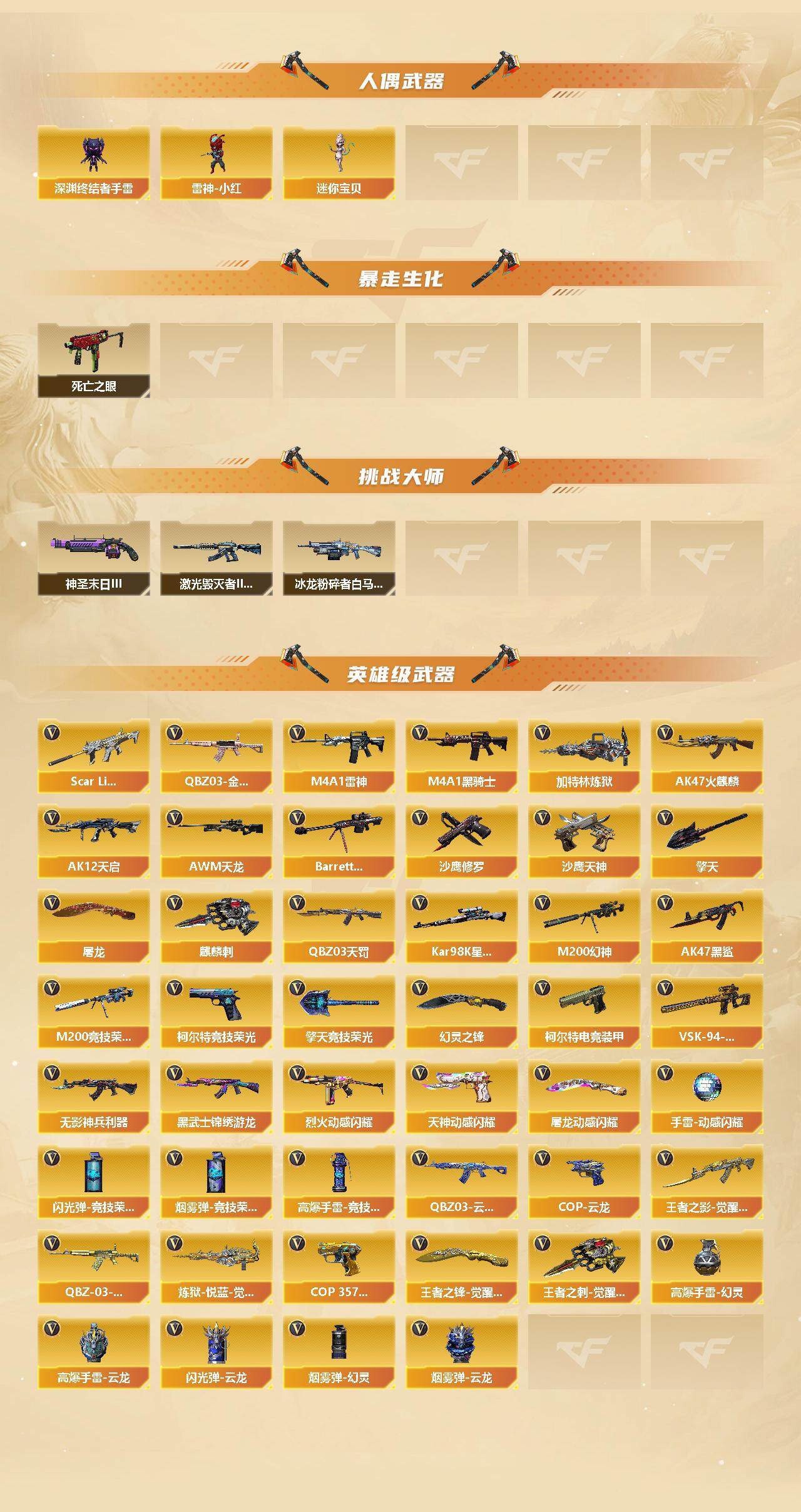 【英雄级武器】:AK47-火麒麟,M4A1-雷神,M4A1-黑骑士,AK12-天启,AK47-黑鲨,Scar Light-白虎,QBZ03-天罚,无影-神兵利器,QBZ03-云龙,黑武士-锦绣游龙,QBZ03-金色蔷薇,烈火-动感闪耀,王者之影-觉醒版,QBZ-03-王者蔷薇-觉醒版,AWM-天龙,Barrett-毁灭,M200-幻神,Kar98K-星神,M200-竞技荣光,VSK-94-金蚀,加特林-炼狱,炼狱-悦蓝-觉醒版,沙鹰-