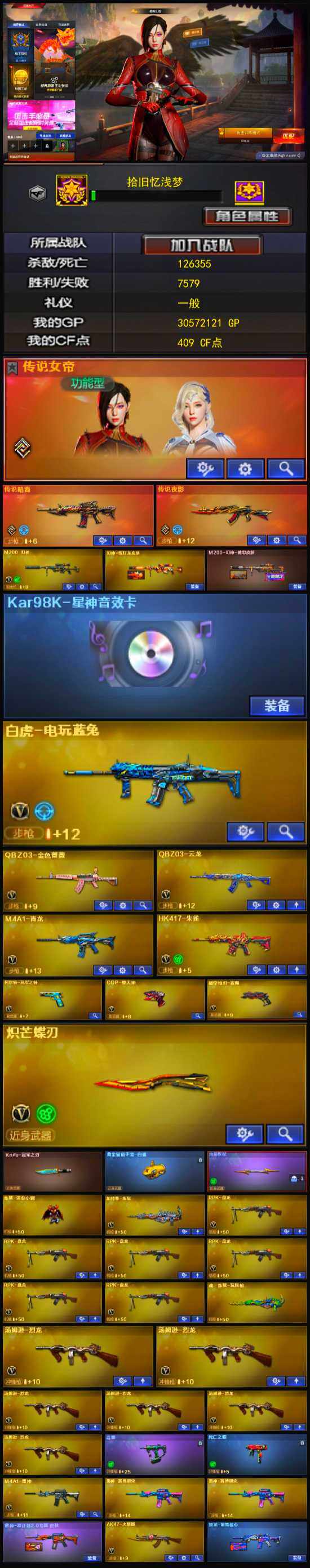 【热门武器】:传说暗裔,传说夜影,QBZ03-金色蔷薇,HK417-朱雀,M4A1-青龙,M200-幻神,修罗-古蛇迷踪,死亡之眼,白虎-电玩蓝兔,柯尔特-冠军之特,炼狱-迷你小钢,毒蜂,牛牛-AK47,汤姆逊-烈龙*6,RPK-盘龙*6,加特林-炼狱,COP-堕天神,Knife-冠军之刃*2,炽芒蝶刃,黄金猫猫手套-白鲨,黄金猫猫手套