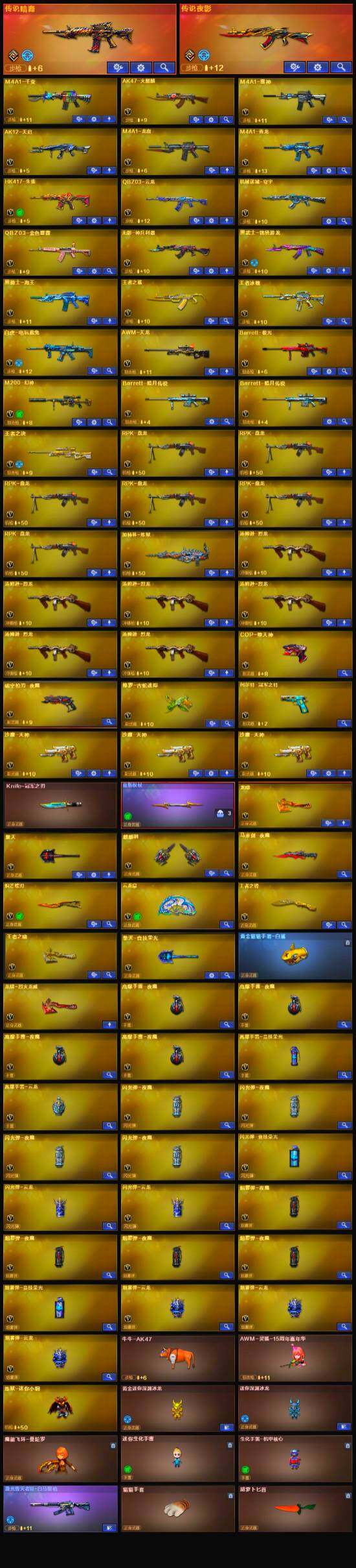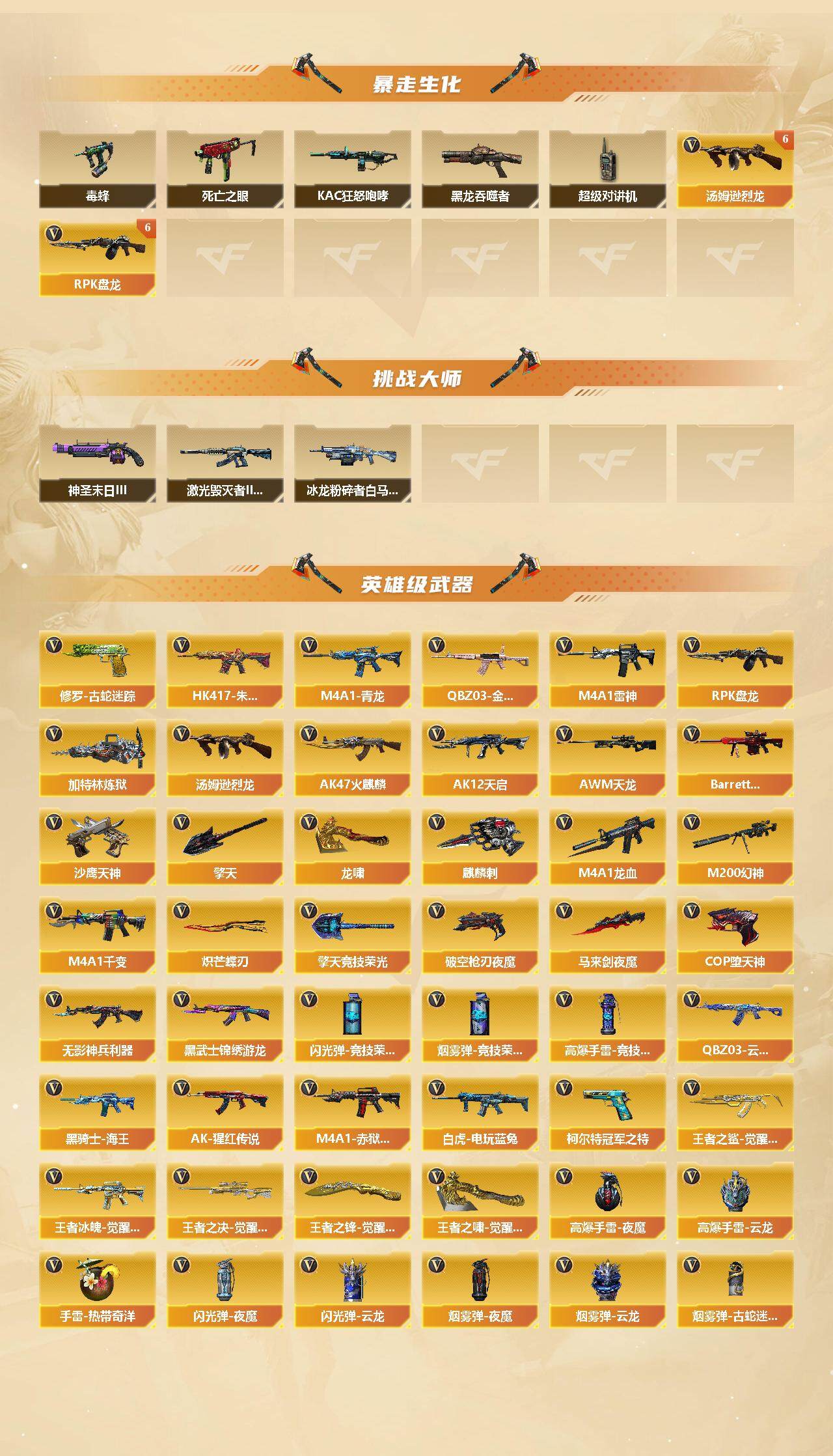 【英雄级武器】:M4A1-千变,AK47-火麒麟,M4A1-雷神,AK12-天启,M4A1-龙血,M4A1-青龙,HK417-朱雀,无影-神兵利器,QBZ03-云龙,黑武士-锦绣游龙,QBZ03-金色蔷薇,AK-47-猩红传说,王者之鲨-觉醒版,王者冰魄-觉醒版,黑骑士-海王,白虎-电玩蓝兔,AWM-天龙,Barrett-极光,M200-幻神,王者之决-觉醒版,RPK-盘龙*6,加特林-炼狱,汤姆逊-烈龙*6,沙鹰-天神*3,COP-堕天神,柯尔特-冠军之特,破空枪刃-夜魔,修罗-古