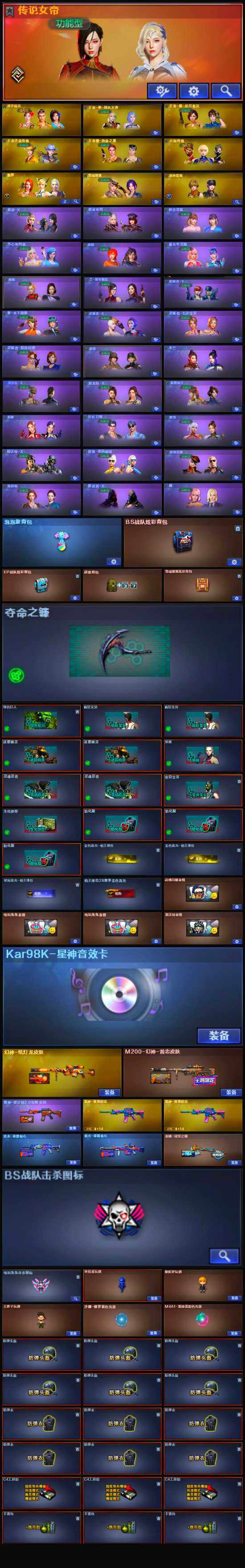 - [12709773]黑龙江区-20V-6王者-0炫金 【传说角色】:传说女帝 【热门武器】:QBZ03-金色蔷薇,M200-幻神,白虎-电玩蓝兔,柯尔特-冠军之特*2,毒蜂,M4A1-黑骑士,沙鹰-修罗,Knife-冠军之刃,黄金猫猫手套-白鲨 【王者炫金武器】:王者霜心,王者云击 【音效卡】:M200-幻神音效卡,M4A1-黑骑士音效卡,QBZ03-金色蔷薇音效卡 【稀有皮肤】:M200-幻神-黄忠皮肤,幻神-丹凤,QBZ03-冠军之薇,火麒麟-战神关羽,黑骑士-冠军之势,毁灭-暗月,毁灭-黑大圣皮肤*2,屠龙-春桃 皮肤 【角色】:传说女帝,王者樱-热浪之夏,王者-零-国色天香 【人偶武器】:雷神-枪娘蕾安娜,AWM-灵狐-15周年嘉年华,迷你生化手雷*2 【暴走生化】:毒蜂,黑龙吞噬者,超级对讲机 【英雄级武器】:QBZ03-金色蔷薇,白虎-电玩蓝兔,无影-神兵利器,M4A1-黑骑士,AK47-火麒麟,AN94-超新星,Barrett-毁灭,M200-幻神,AK-47-猩红传说,AK47-B-常胜将军,柯尔特-冠军之特*2,沙鹰-修罗,屠龙 【特殊枪械】:1黑骑士