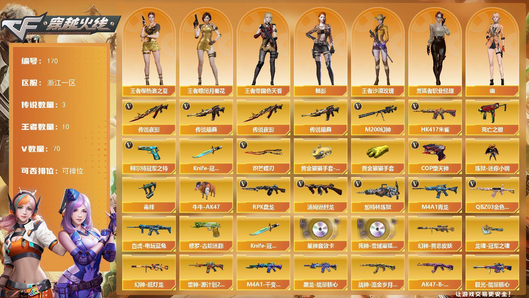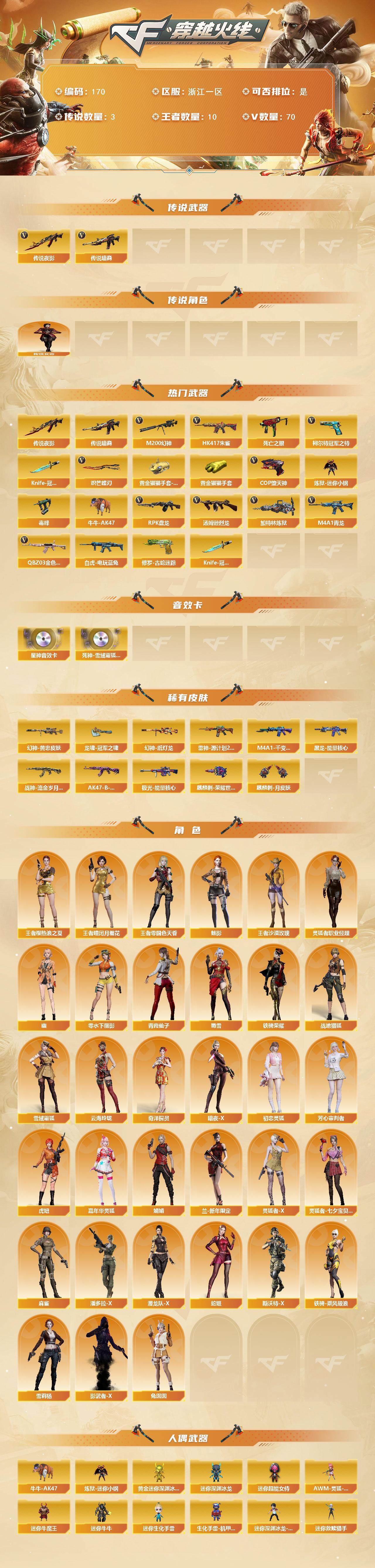[13979356]浙江一区-70V-10王者-0炫金 【传说武器】:传说暗裔,传说夜影 【传说角色】:传说女帝 【热门武器】:传说暗裔,传说夜影,QBZ03-金色蔷薇,HK417-朱雀,M4A1-青龙,M200-幻神,修罗-古蛇迷踪,死亡之眼,白虎-电玩蓝兔,柯尔特-冠军之特,炼狱-迷你小钢,毒蜂,牛牛-AK47,汤姆逊-烈龙*6,RPK-盘龙*6,加特林-炼狱,COP-堕天神,Knife-冠军之刃*2,炽芒蝶刃,黄金猫猫手套-白鲨,黄金猫猫手套 【音效卡】:Kar98K-星神音效卡,死神-雪域霜狐-怀旧音效卡 【皮肤】:M200-幻神-黄忠皮肤,幻神-纸灯龙皮肤,雷神-源计划2.0专属 皮肤,M4A1-千变-孔明皮肤,黑龙-能量核心,战神-流金岁月皮肤,AK47-B-常胜将军-曹操*2,极光-能量核心,龙啸-冠军之啸,麒麟刺-荣耀世冠白鲨,麒麟刺-月皮肤 【角色】:魅影,战地猎狐,王者-瞳-闭月羞花,王者樱-热浪之夏,王者-零-国色天香,王者沙漠玫瑰,雪域霜狐,奇洋探员,云海玲珑,暗夜-X,初恋灵狐,芳心审判者,虎妞,嘉年华灵狐,娟娟,兰-新年限定,零-水下丽影,灵狐者-X,灵狐者-七夕宝贝,灵狐者-职业经理,麻雀,潘多拉-X,潜龙队-X,青霞仙子,蛇姬,斯沃特-X,蜀雪,铁骑-乘风破浪,铁骑荣耀,兔囡囡,雪莉杨,影武者-X,幽 【人偶武器】:炼狱-迷你小钢,迷你救赎猎手*2,AWM-灵狐-15周年嘉年华,牛牛-AK47,黄金迷你深渊冰龙,迷你深渊冰龙,迷你牛魔王,迷你牛牛,迷你生化手雷,生化手雷-机甲核心,迷你深渊冰龙-王绿豆,迷你超能女侍 【暴走生化】:毒蜂,KAC-狂怒咆哮,黑龙吞噬者,死亡之眼,超级对讲机 【挑战大师】:冰龙粉碎者-白马银枪,激光毁灭者III-白马银枪,神圣爆裂者-末日III 【英雄级武器】:M4A1-千变,AK47-火麒麟,M4A1-雷神,AK12-天启,M4A1-龙血,M4A1-青龙,HK417-朱雀,无影-神兵利器,QBZ03-云龙,黑武士-锦绣游龙,QBZ03-金色蔷薇,AK-47-猩红传说,王者之鲨-觉醒版,王者冰魄-觉醒版,黑骑士-海王,白虎-电玩蓝兔,AWM-天龙,Barrett-极光,M200-幻神,王者之决-觉醒版,RPK-盘龙*6,加特林-炼狱,汤姆逊-烈龙*6,沙鹰-天神*3,COP-堕天神,柯尔特-冠军之特,破空枪刃-夜魔,修罗-古