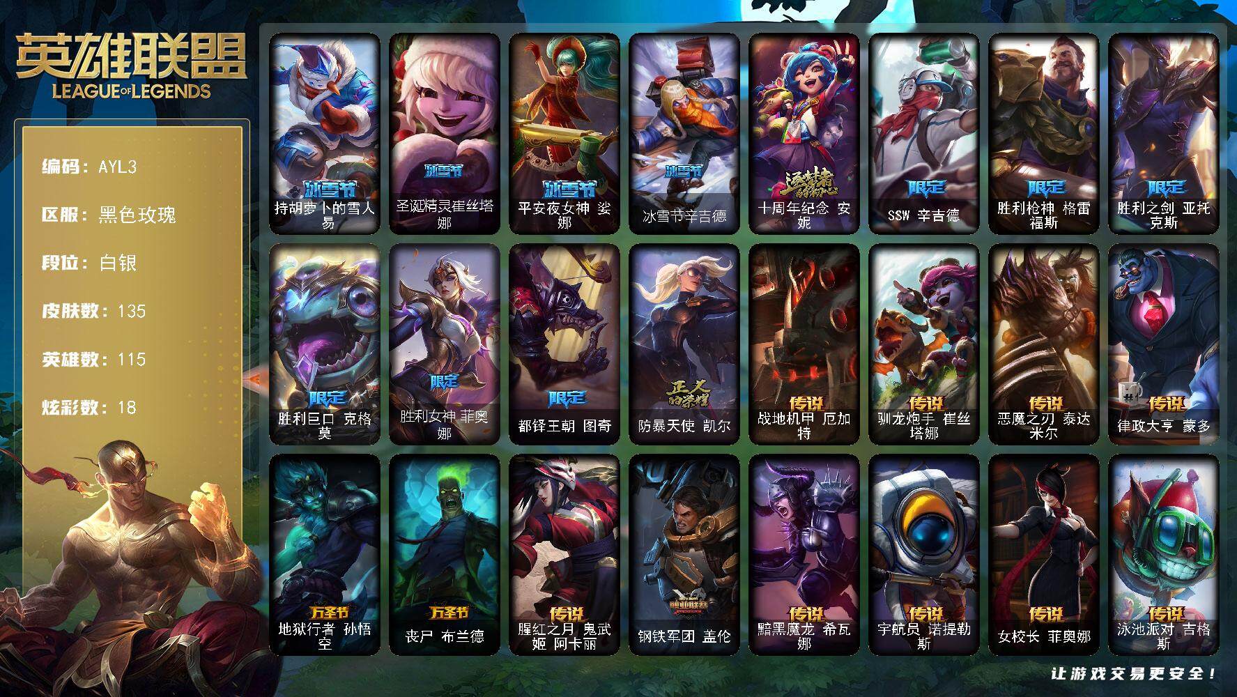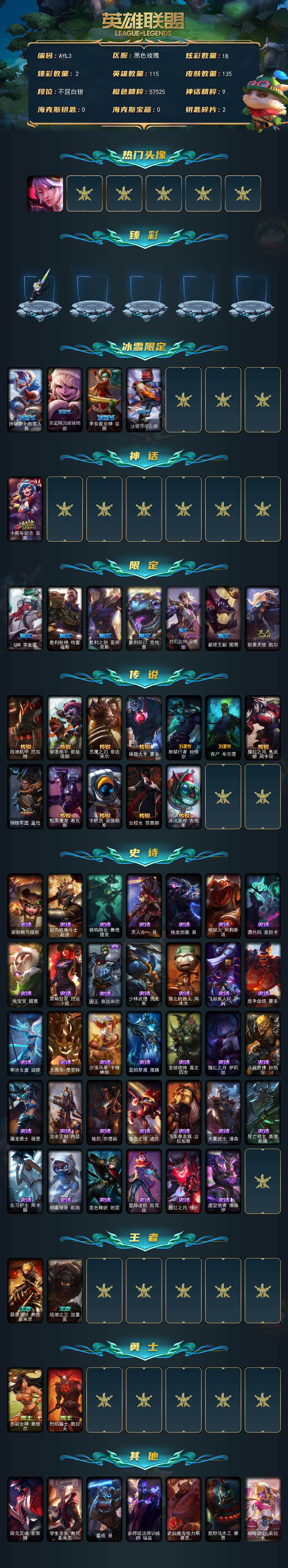 [13979515]白银段位-115英雄-135皮肤-18炫彩-1神话-11限定-12传说-34史诗 【热门头像】:觅心之翼奎因头像 【臻彩皮肤】:持七彩冰棍的雪人易,魔女阿卡丽虚荣 【冰雪限定】:持胡萝卜的雪人易,圣诞精灵崔丝塔娜,平安夜女神娑娜,冰雪节辛吉德 【神话皮肤】:十周年纪念安妮 【限定皮肤】:SSW辛吉德,胜利枪神格雷福斯,胜利之剑亚托克斯,胜利巨口克格莫,胜利女神菲奥娜,都铎王朝图奇,防暴天使凯尔 【传说皮肤】:战地机甲厄加特,驯龙炮手崔丝塔娜,恶魔之刃泰达米尔,律政大亨蒙多,地狱行者孙悟空,丧尸布兰德,腥红之月鬼武姬阿卡丽,钢铁军团盖伦,黯黑魔龙希瓦娜,宇航员诺提勒斯,女校长菲奥娜,泳池派对吉格斯 【史诗皮肤】:安伯斯与提妮,绞肉机角斗士赵信,铁钩船长费德提克,天人合一易,铁血剑豪易,地狱火阿利斯塔,源代码索拉卡,兔宝宝提莫,黑帮狂花厄运小姐,国王泰达米尔,少林武僧贾克斯,殇之机器人阿木木,飞越疯人院萨科,战争血统蒙多,寒冰女皇迦娜,无畏号墨菲特,沙漠风暴卡特琳娜,蓝焰梦魔魔腾,龙骑统帅嘉文四世,腥红之月伊莉丝,斗战胜佛孙悟空,屠龙勇士薇恩,法老王朝内瑟斯,艳后奈德丽,血色之锤波比,飞车暴走族古拉加斯,大夏武士潘森,死亡领主莫德凯撒,实习护士阿卡丽,刺客信条凯南,血色精锐锐雯,星际迷航拉克丝,腥红之月锤石,虚空使者俄洛伊 【王者皮肤】:霹雳游侠弗拉基米尔,战地之王加里奥 【勇士皮肤】:亮丽女神希维尔,烈焰猛士奥拉夫 【其他皮肤1】:探戈灵魂崔斯特,学生会长弗拉基米尔,星战易,宗师级法师训练师瑞兹,武仙座海格力斯赛恩,原野伐木工赛恩,咖啡甜心索拉卡,冻原猎手沃里克,黑暗骑士沃里克,荒野巨兽努努和威朗普,攻城巨兽努努和威朗普,勇敢的心泰达米尔,时间机器基兰,机械污染辛吉德,冲浪高手辛吉德,科学狂人辛吉德,黑色天灾辛吉德,假面女皇伊芙琳,黑金诱惑图奇,五杀摇滚主唱卡尔萨斯,尼斯巨兽科加斯,狂欢阿木木,王子不是我阿木木,沙之守护拉莫斯,联盟之喙艾尼维亚,小丑工作坊萨科,硬汉蒙多,寒冰王座卡萨丁,海牛骑手库奇,灰胡子魔法师维迦,垃圾场特朗德尔,银白枪骑布里茨,珊瑚礁墨菲特,石破天惊墨菲特,劫掠梦魇魔腾,绿茵门神茂凯,星河战队雷克顿,血石战神雷克顿,热带丛林兰博,蛇发女妖卡西奥佩娅,沙暴巨蝎斯卡纳,单身贵族内瑟斯,法国女仆奈德丽,乡村农夫古拉加斯,品酒大师古拉加斯,狂热球迷古拉