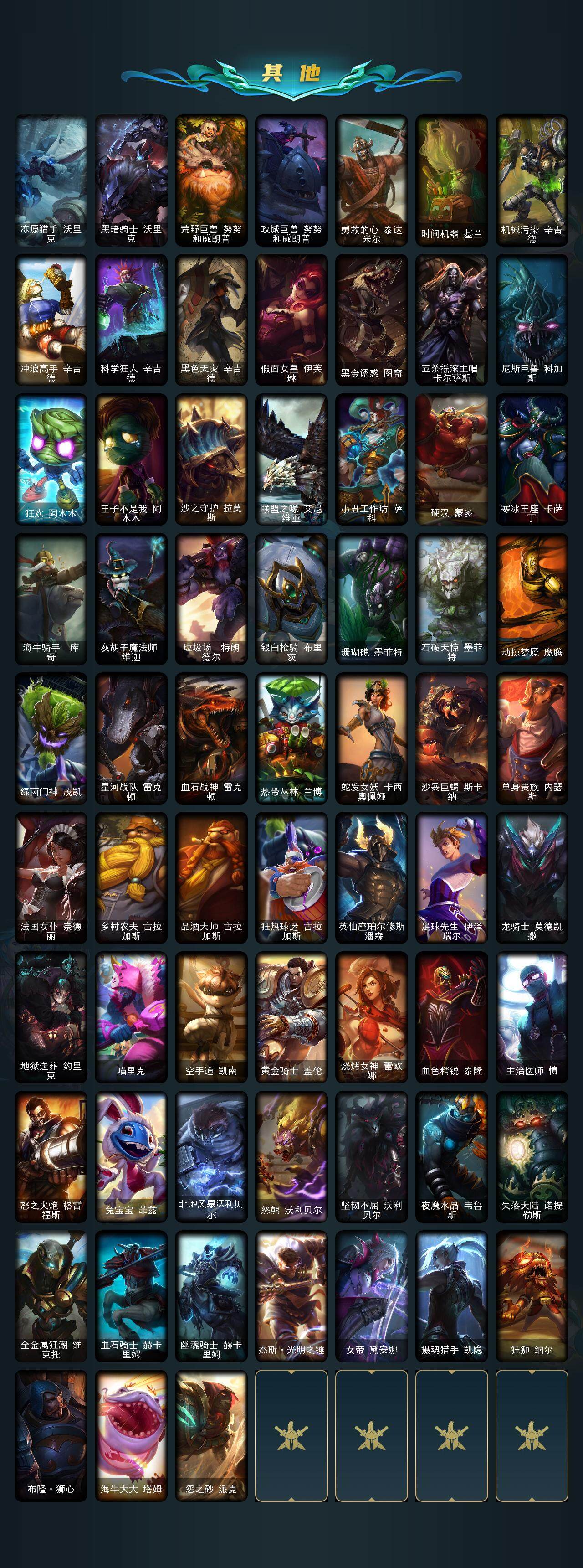 【其他皮肤1】:探戈灵魂崔斯特,学生会长弗拉基米尔,星战易,宗师级法师训练师瑞兹,武仙座海格力斯赛恩,原野伐木工赛恩,咖啡甜心索拉卡,冻原猎手沃里克,黑暗骑士沃里克,荒野巨兽努努和威朗普,攻城巨兽努努和威朗普,勇敢的心泰达米尔,时间机器基兰,机械污染辛吉德,冲浪高手辛吉德,科学狂人辛吉德,黑色天灾辛吉德,假面女皇伊芙琳,黑金诱惑图奇,五杀摇滚主唱卡尔萨斯,尼斯巨兽科加斯,狂欢阿木木,王子不是我阿木木,沙之守护拉莫斯,联盟之喙艾尼维亚,小丑工作坊萨科,硬汉蒙多,寒冰王座卡萨丁,海牛骑手库奇,灰胡子魔法师维迦,垃圾场特朗德尔,银白枪骑布里茨,珊瑚礁墨菲特,石破天惊墨菲特,劫掠梦魇魔腾,绿茵门神茂凯,星河战队雷克顿,血石战神雷克顿,热带丛林兰博,蛇发女妖卡西奥佩娅,沙暴巨蝎斯卡纳,单身贵族内瑟斯,法国女仆奈德丽,乡村农夫古拉加斯,品酒大师古拉加斯,狂热球迷古拉