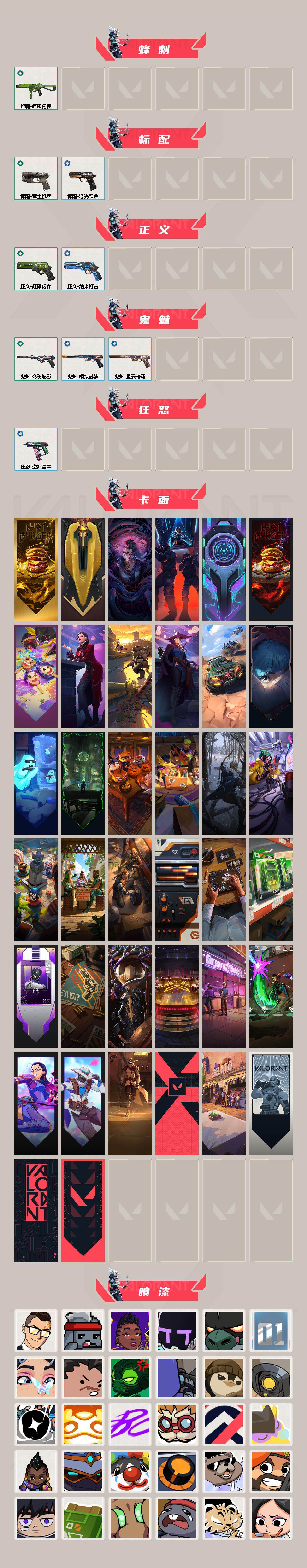 【卡面】:终章:激斗汉堡 卡面,进入射程 卡面,分崩离析 卡面,纳米打击 卡面,抑制技术 卡面,激斗汉堡 卡面,瓦娃脸雪糕 P2 卡面,从黄昏到黎明 卡面,荒土机兵 卡面,银弹猎手 卡面,逆冲蛮牛 卡面,《双城之战》拥抱 卡面,精灵大战 卡面,欢迎来到底城 卡面,南瓜盛典 卡面,唱片的故事 卡面,钢弓与箭弦 卡面,排除故障 卡面,战术桌游 卡面,悠享食光 卡面,修车达人 卡面,模拟赫兹 卡面,浮光跃金 卡面,超限闪存 卡面,维斯工牌 卡面,正义的化身 卡面,时间到 卡面,最高舞台 卡面,梦幻奶茶 卡面,源能反应 卡面,无畏契约GO!第一卷:芮娜 卡面,无畏契约GO!第一卷:零 卡面,没有什么能逃过我的眼睛 卡面,代号红色 卡面,冰淇淋店 卡面,新兵报到 卡面,V契约 卡面,无畏契约 卡面