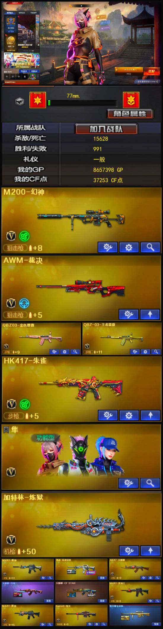 【热门武器】:QBZ03-金色蔷薇,HK417-朱雀,M200-幻神,M4A1-黑骑士,加特林-炼狱,羊驼玩偶,沙鹰-修罗*4