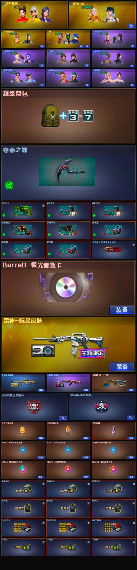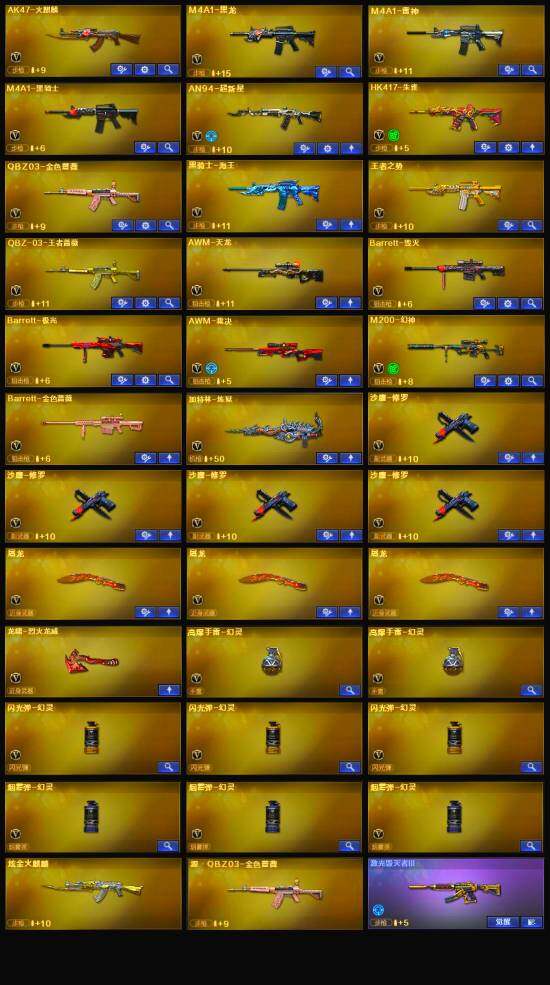 【英雄级武器】:AK47-火麒麟,M4A1-黑龙,M4A1-雷神,M4A1-黑骑士,AN94-超新星,HK417-朱雀,QBZ03-金色蔷薇,王者之势-觉醒版,黑骑士-海王,QBZ-03-王者蔷薇-觉醒版,AWM-天龙,Barrett-毁灭,Barrett-极光,AWM-裁决,M200-幻神,Barrett-金色蔷薇,加特林-炼狱,沙鹰-修罗*4,屠龙*3,高爆手雷-幻灵*2,闪光弹-幻灵*3,烟雾弹-幻灵*3,M4A1-赤狱骑士