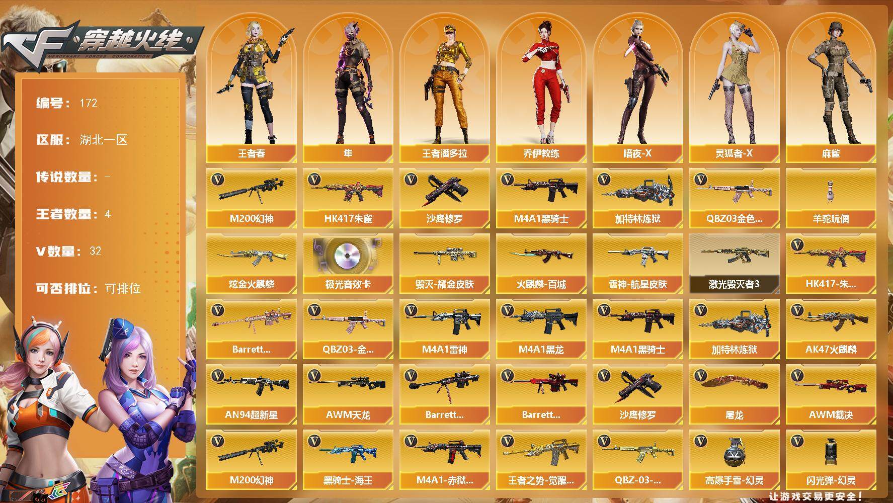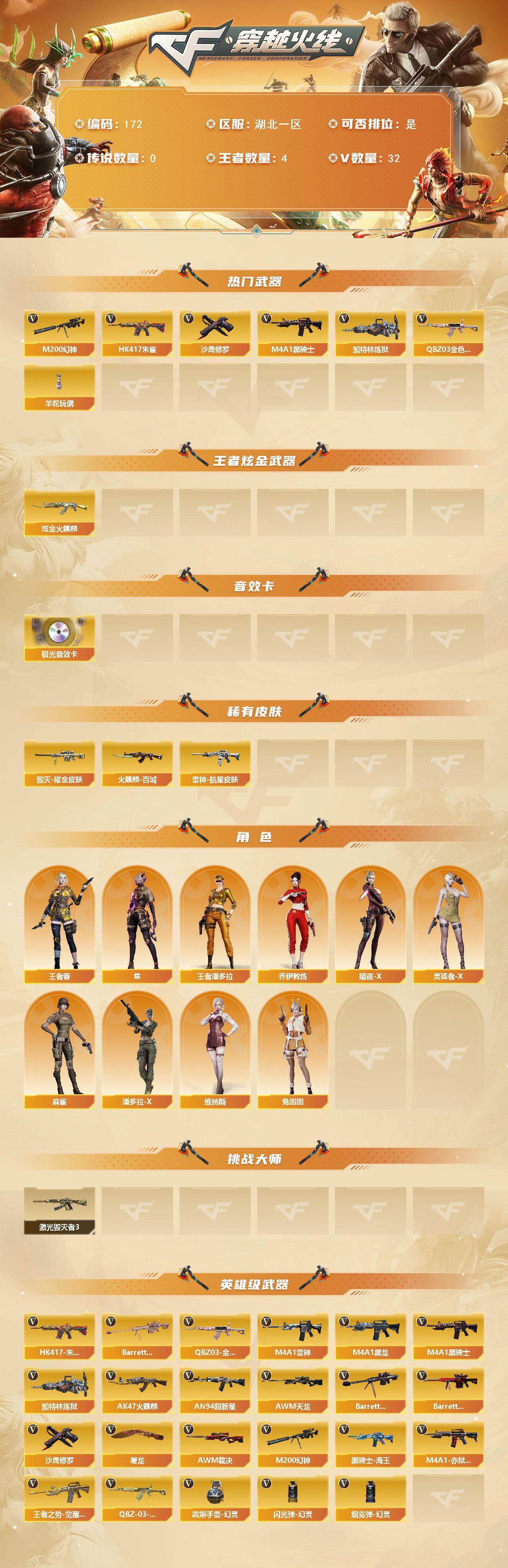 [13979620]湖北一区-32V-4王者-1炫金 【热门武器】:QBZ03-金色蔷薇,HK417-朱雀,M200-幻神,M4A1-黑骑士,加特林-炼狱,羊驼玩偶,沙鹰-修罗*4 【王者炫金武器】:炫金火麒麟 【音效卡】:Barrett-极光音效卡 【皮肤】:雷神-航星皮肤,火麒麟-百城,毁灭耀金皮肤 【角色】:隼,王者春,王者潘多拉,乔伊教练,暗夜-X,灵狐者-X,麻雀,潘多拉-X,兔囡囡,维纳斯 【挑战大师】:激光毁灭者III 【英雄级武器】:AK47-火麒麟,M4A1-黑龙,M4A1-雷神,M4A1-黑骑士,AN94-超新星,HK417-朱雀,QBZ03-金色蔷薇,王者之势-觉醒版,黑骑士-海王,QBZ-03-王者蔷薇-觉醒版,AWM-天龙,Barrett-毁灭,Barrett-极光,AWM-裁决,M200-幻神,Barrett-金色蔷薇,加特林-炼狱,沙鹰-修罗*4,屠龙*3,高爆手雷-幻灵*2,闪光弹-幻灵*3,烟雾弹-幻灵*3,M4A1-赤狱骑士 【道具】:炫彩背包,超级背包,绿色巨人,灵魂忍者,迷雾幽灵,夺命之镰,防化服*3,流光-鎏金之域,枪王排位28赛季金色流光,枪王排位29赛季金色流光,防弹头盔*3,防弹衣*3,C4工具钳*3,手雷包*3 【特殊枪械】:1黑骑士,1炼狱