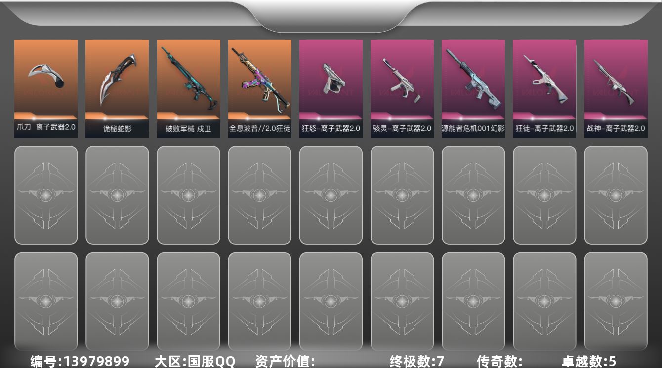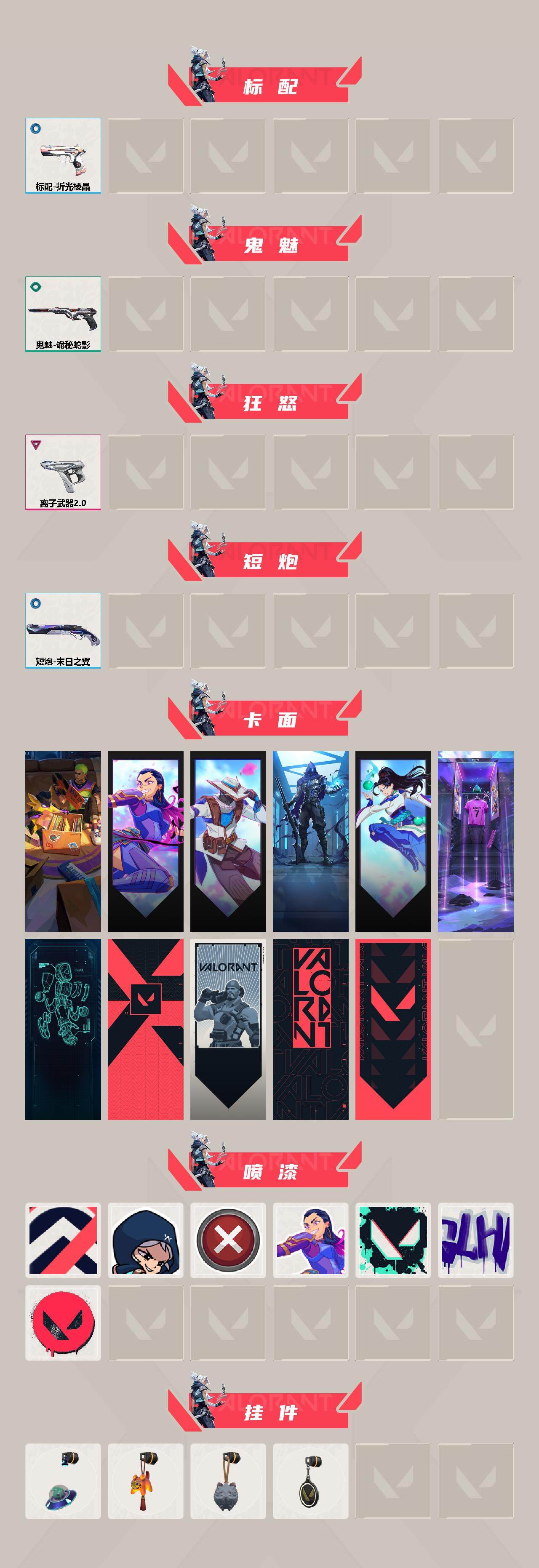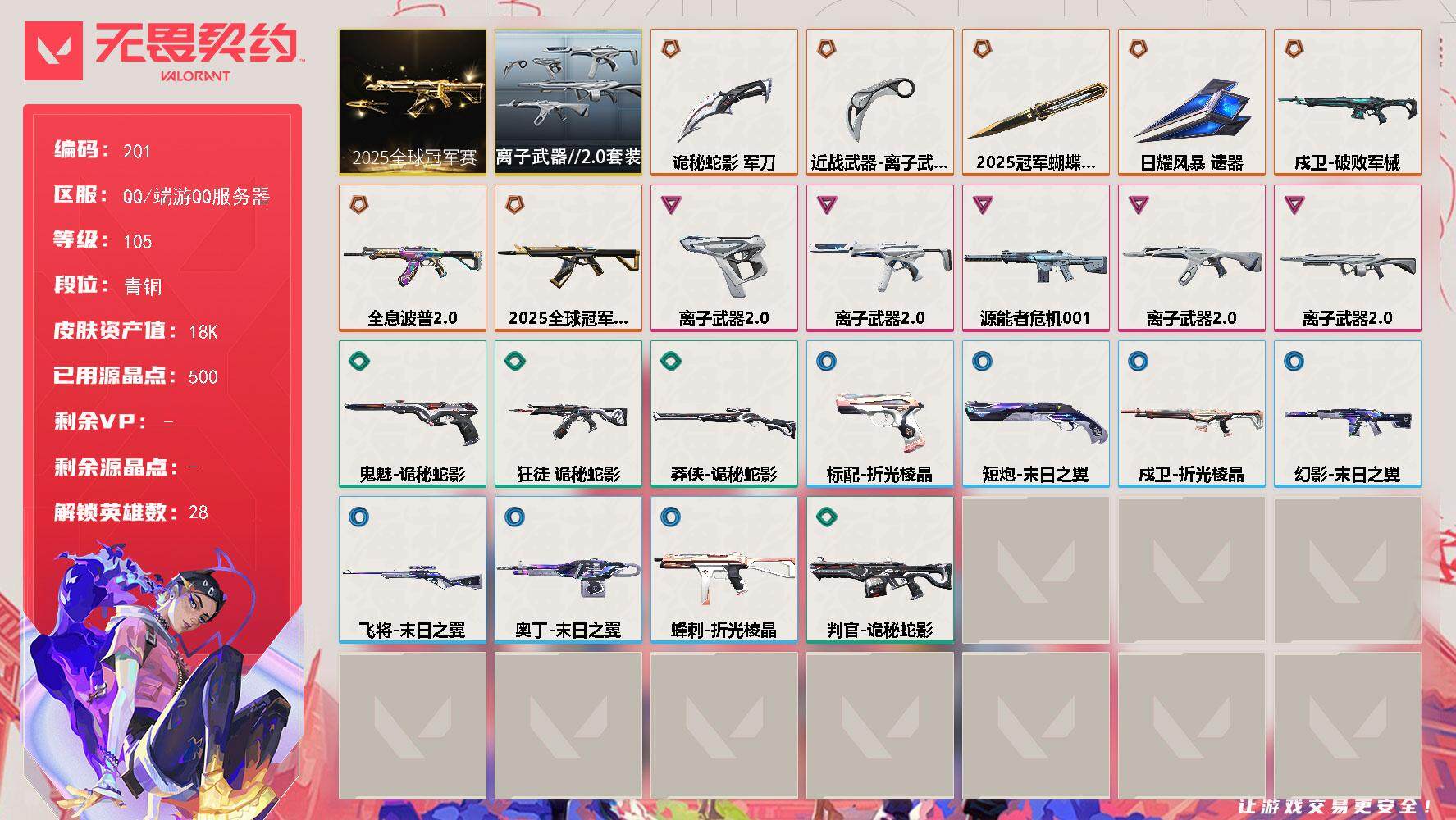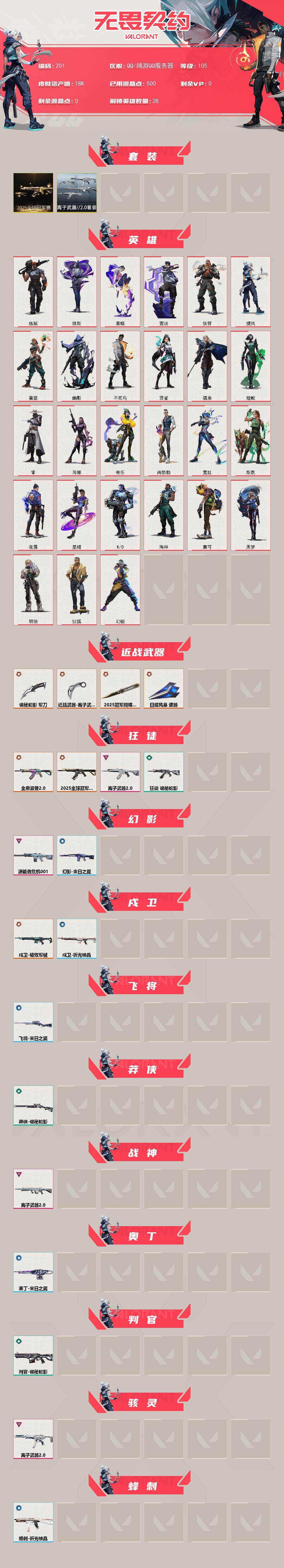 [13979899]【套装】:2025全球冠军赛套装,离子武器//2.0套装 【英雄】:幻棱,炼狱,维斯,暮蝶,钛狐,壹决,铁臂,捷风,雷兹,幽影,不死鸟,贤者,猎枭,蝰蛇,零,芮娜,奇乐,尚勃勒,霓虹,斯凯,夜露,星礈,K/O,海神,盖可,黑梦,钢锁 【近战 武器】:近战武器-2025全球冠军赛 蝴蝶刀,近战武器-离子武器//2.0 爪刀,近战武器-诡秘蛇影 军刀,近战武器-日耀风暴 遗器 【狂徒】:狂徒-2025全球冠军赛,狂徒-全息波普//2.0,狂徒-离子武器//2.0,狂徒-诡秘蛇影 【幻影】:幻影-源能者危机001,幻影-末日之翼 【戍卫】:戍卫-破败军械,戍卫-折光棱晶 【飞将】:飞将-末日之翼 【莽侠】:莽侠-诡秘蛇影 【战神】:战神-离子武器//2.0 【奥丁】:奥丁-末日之翼 【判官】:判官-诡秘蛇影 【骇灵】:骇灵-离子武器//2.0 【蜂刺】:蜂刺-折光棱晶 【标配】:标配-折光棱晶 【鬼魅】:鬼魅-诡秘蛇影 【狂怒】:狂怒-离子武器//2.0 【短炮】:短炮-末日之翼 【卡面】:唱片的故事 卡面,无畏契约GO!第一卷:芮娜 卡面,无畏契约GO!第一卷:零 卡面,暗枪 卡面,无畏契约GO!第一卷:贤者 卡面,"Luie" 卡面,铁臂设计图 卡面,代号红色 卡面,新兵报到 卡面,V契约 卡面,无畏契约 卡面 【喷漆】:控场勿近 喷漆,捷风差距 喷漆,买装还是存钱 喷漆,无畏契约GO!第一卷:芮娜 喷漆,胜利属于无畏契约 喷漆,GLHF 喷漆,无畏契约 喷漆 【挂饰】:天外飞客 挂饰,好运福爪 挂饰,《双城之战》魄罗 挂饰,无畏契约 纪念币 挂饰