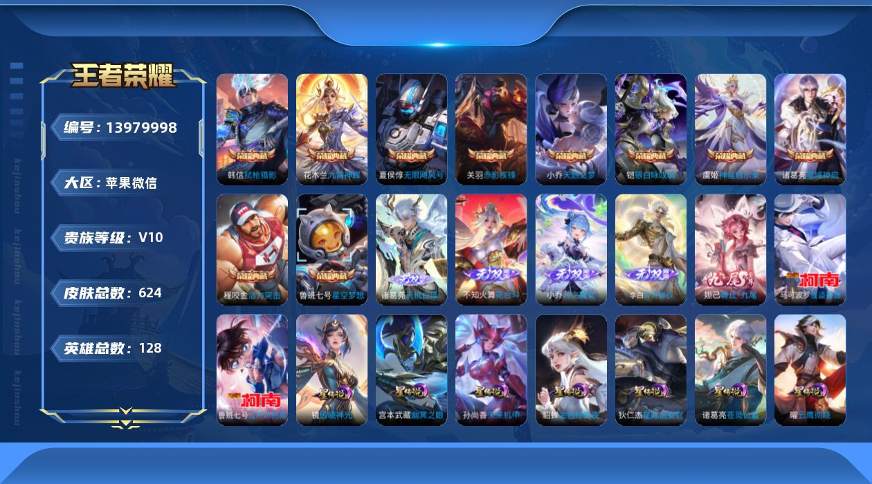 [13979998]苹果WX-V10-最强王者段位-128英雄-624皮肤-10典藏-0珍品无双-5无双-2珍品传说-103传说-215史诗 极品号V10!小乔全皮!诸葛亮全皮!虞姬全皮!最新青铜小兵!15天幕!63按键!10星传说! 【星传说】:诸葛亮-岁雨灵司,诸葛亮-苍灵仙君,曜-云鹰彻晓,武则天-幻海之心,孙悟空-幽冥火,宫本武藏-幽冥之眼,狄仁杰-星际治安官,孙尚香-未来机甲,貂蝉-金色仲夏夜,镜-破晓神光 【英雄全皮】:小乔全皮,赵云全皮,墨子全皮,鲁班七号全皮,刘禅全皮,阿轲全皮,钟无艳全皮,扁鹊全皮,周瑜全皮,夏侯惇全皮,典韦全皮,狄仁杰全皮,达摩全皮,程咬金全皮,姜子牙全皮,刘邦全皮,孙权全皮,兰陵王全皮,不知火舞全皮,娜可露露全皮,橘右京全皮,牛魔全皮,虞姬全皮,钟馗全皮,苍全皮,太乙真人全皮,鬼谷子全皮,诸葛亮全皮,黄忠全皮,沈梦溪全皮,裴擒虎全皮,狂铁全皮,李信全皮,盾山全皮,猪八戒全皮,亚连全皮,海月全皮,鲁班大师全皮,蒙恬全皮,阿古朵全皮,夏洛特全皮,司空震全皮,金蝉全皮,赵怀真全皮,莱西奥全皮,空空儿全皮,影全皮 【荣耀典藏】:武则天英雄,夏侯惇无限飓风号,小乔天鹅之梦,鲁班七号星空梦想,程咬金活力突击,诸葛亮星域神启,花木兰九霄神辉,关羽赤影疾锋,铠银白咏叹调,韩信弑枪猎影,虞姬神鉴启示录 【无双皮肤】:妲己青丘九尾,李白碎月剑心,小乔时之魔女,不知火舞花合斗,诸葛亮天机白泽 【珍品传说】:马可波罗怪盗基德,鲁班七号江户川柯南 【传说皮肤】:后羿神树通天,曹操万灵伏威,大司命死亡执政官,司空震愿照山河定,妲己愿照众生和,澜愿照九州拓,虞姬愿照岁时盈,云缨幻光神枪,裴擒虎祥瑞亨通,夏侯惇霜北刀,铠冥王哈迪斯,墨子黄金天蝎座,海月金乌负日,亚连落雪白狼,吕布曦玄引,典韦战鼓燎原,孙尚香乘龙问璇玑,孙策乘龙淬吴钩,赵云乘龙铭钟鼎,铠琥珀纪元,澜逐花归海,艾琳觅芳踪,孙膑小动物乐团,狄仁杰夜礼服假面,王昭君永恒水手月亮,甄姬至美化雀舞,鲁班七号时之奇旅,兰陵王影龙天霄,吕布遇见神鼓,宫本武藏惊梅引,云缨鹤归松栖,马可波罗妄想实况,东皇太一灼幽烈阳,诸葛亮鹤羽星尊,亚瑟追逃游戏,安琪拉追逃游戏,张飞百相守梦,夏洛特浮生妄,干将莫邪画中仙,花木兰燃星之曲,虞姬无限倾心,项羽无限倾心,伽罗炽翼辉光,孙悟空齐天大圣,小乔山海琳琅生,曜山海苍雷引,李信山海炽霜斩,吕布怒