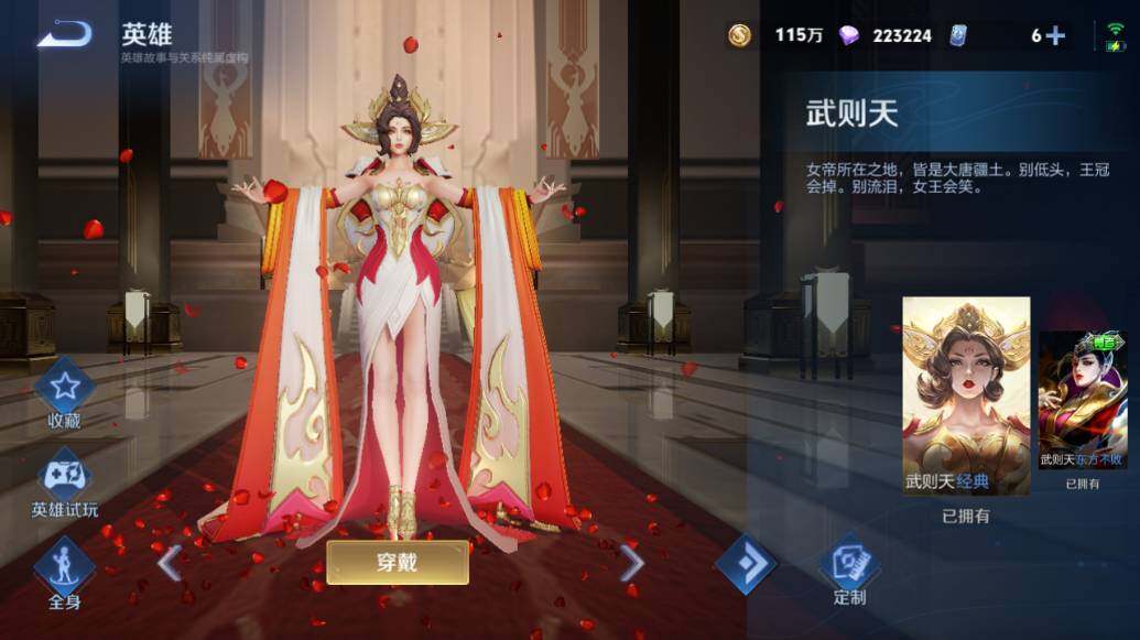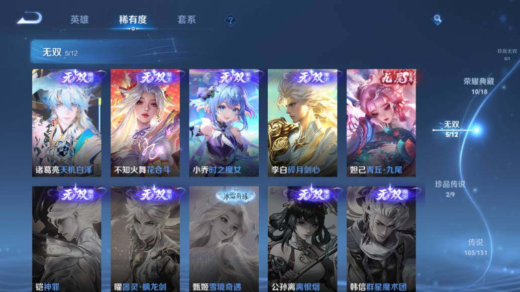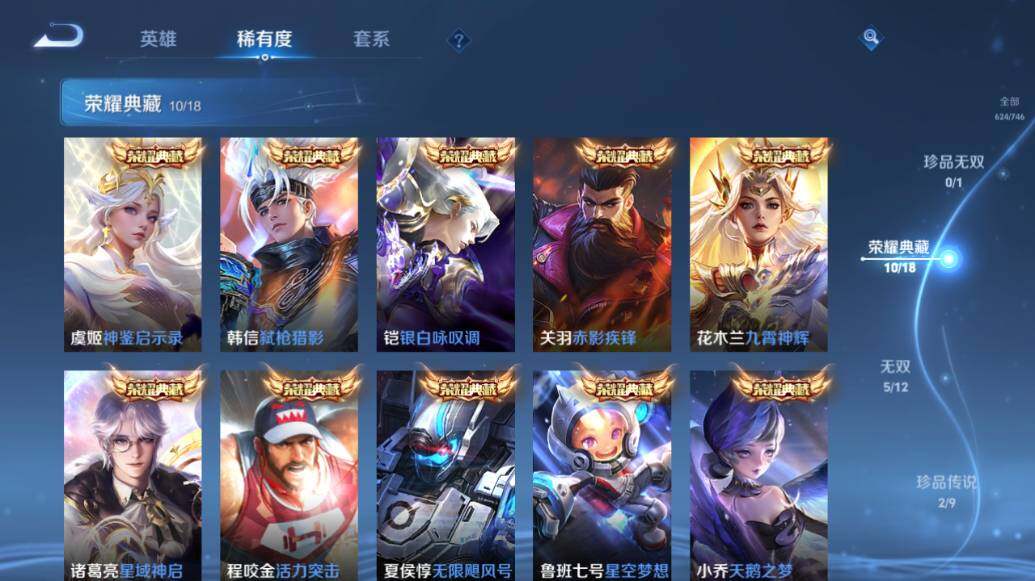 【荣耀典藏】:武则天英雄,夏侯惇无限飓风号,小乔天鹅之梦,鲁班七号星空梦想,程咬金活力突击,诸葛亮星域神启,花木兰九霄神辉,关羽赤影疾锋,铠银白咏叹调,韩信弑枪猎影,虞姬神鉴启示录