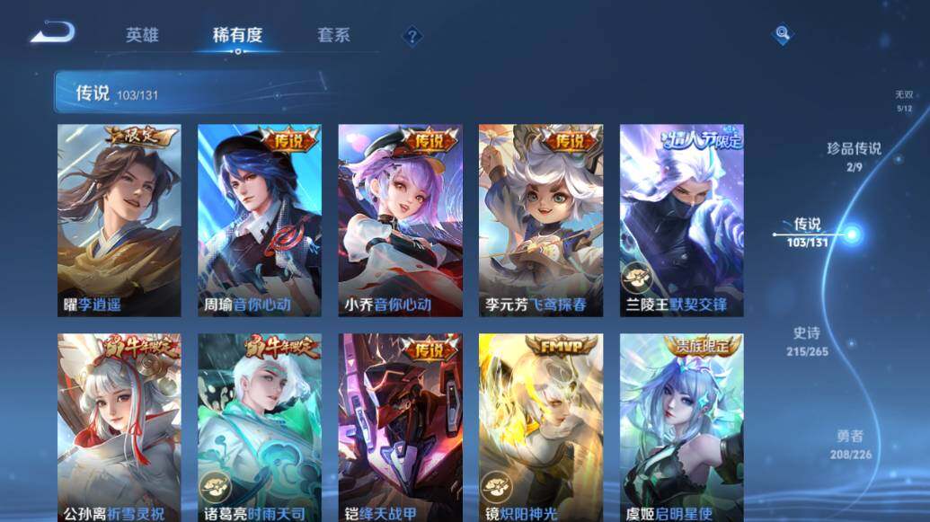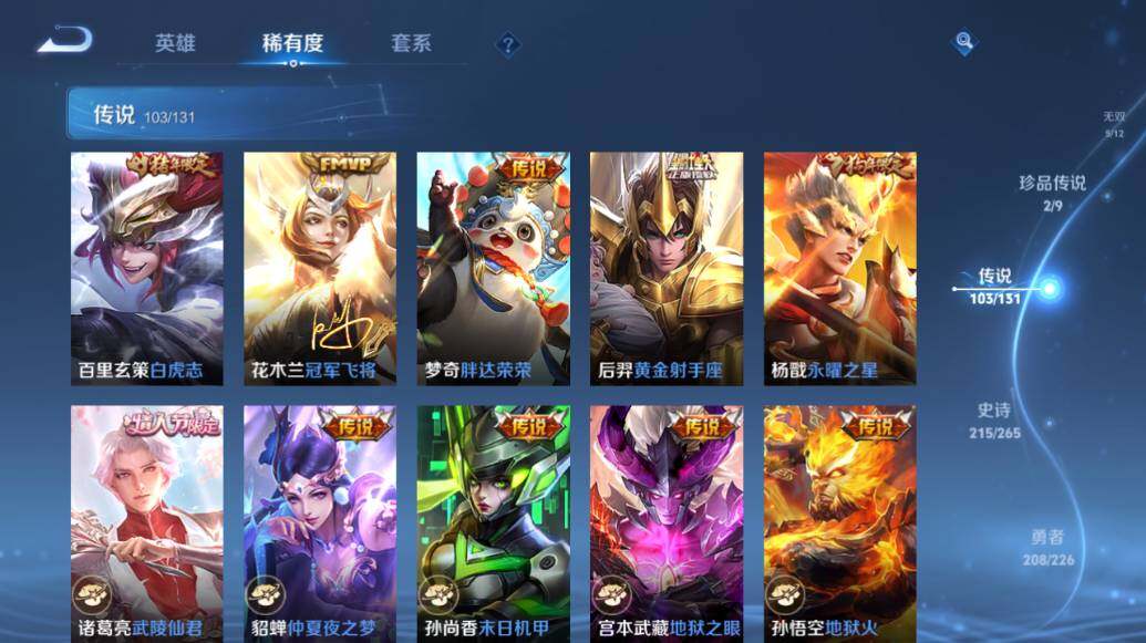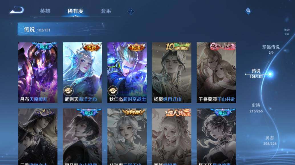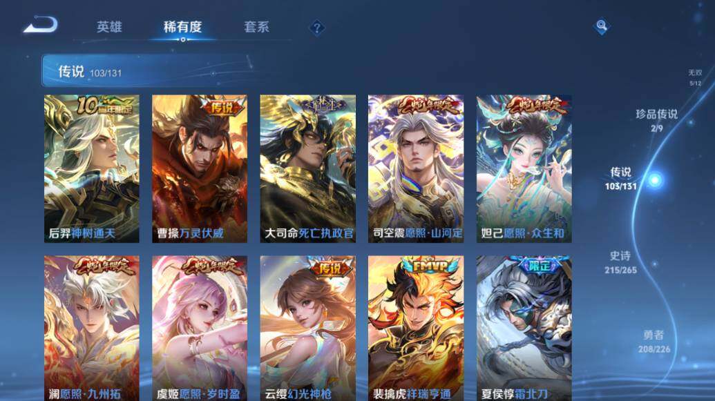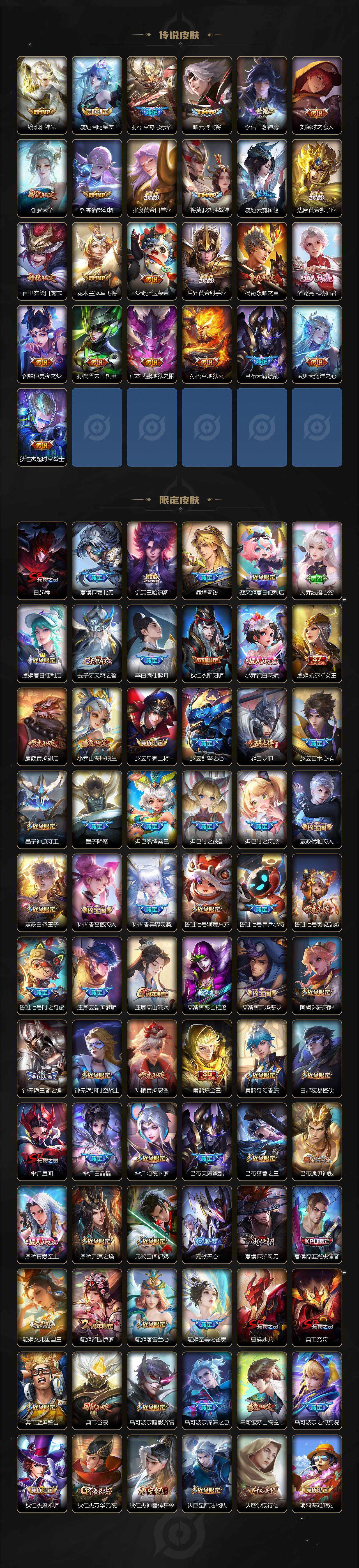 【传说皮肤】:后羿神树通天,曹操万灵伏威,大司命死亡执政官,司空震愿照山河定,妲己愿照众生和,澜愿照九州拓,虞姬愿照岁时盈,云缨幻光神枪,裴擒虎祥瑞亨通,夏侯惇霜北刀,铠冥王哈迪斯,墨子黄金天蝎座,海月金乌负日,亚连落雪白狼,吕布曦玄引,典韦战鼓燎原,孙尚香乘龙问璇玑,孙策乘龙淬吴钩,赵云乘龙铭钟鼎,铠琥珀纪元,澜逐花归海,艾琳觅芳踪,孙膑小动物乐团,狄仁杰夜礼服假面,王昭君永恒水手月亮,甄姬至美化雀舞,鲁班七号时之奇旅,兰陵王影龙天霄,吕布遇见神鼓,宫本武藏惊梅引,云缨鹤归松栖,马可波罗妄想实况,东皇太一灼幽烈阳,诸葛亮鹤羽星尊,亚瑟追逃游戏,安琪拉追逃游戏,张飞百相守梦,夏洛特浮生妄,干将莫邪画中仙,花木兰燃星之曲,虞姬无限倾心,项羽无限倾心,伽罗炽翼辉光,孙悟空齐天大圣,小乔山海琳琅生,曜山海苍雷引,李信山海炽霜斩,吕布怒
