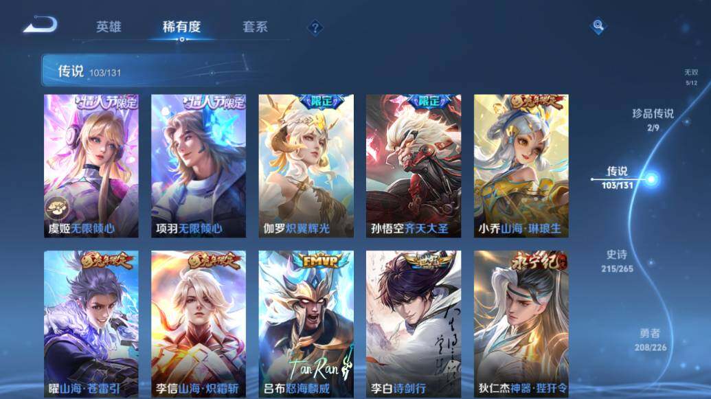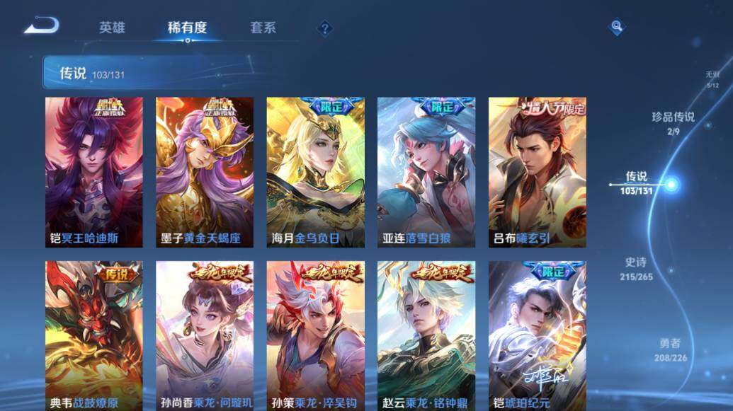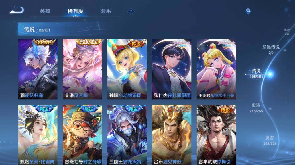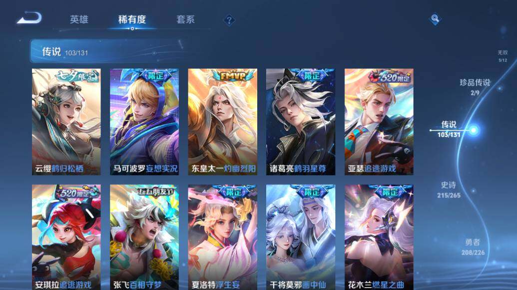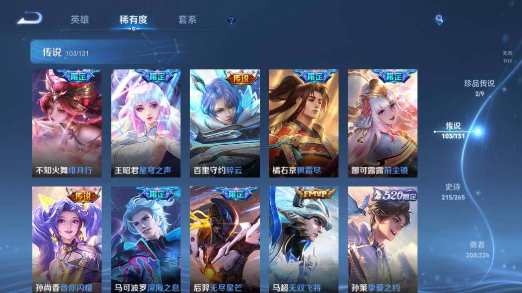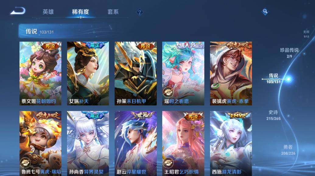 【传说皮肤】:后羿神树通天,曹操万灵伏威,大司命死亡执政官,司空震愿照山河定,妲己愿照众生和,澜愿照九州拓,虞姬愿照岁时盈,云缨幻光神枪,裴擒虎祥瑞亨通,夏侯惇霜北刀,铠冥王哈迪斯,墨子黄金天蝎座,海月金乌负日,亚连落雪白狼,吕布曦玄引,典韦战鼓燎原,孙尚香乘龙问璇玑,孙策乘龙淬吴钩,赵云乘龙铭钟鼎,铠琥珀纪元,澜逐花归海,艾琳觅芳踪,孙膑小动物乐团,狄仁杰夜礼服假面,王昭君永恒水手月亮,甄姬至美化雀舞,鲁班七号时之奇旅,兰陵王影龙天霄,吕布遇见神鼓,宫本武藏惊梅引,云缨鹤归松栖,马可波罗妄想实况,东皇太一灼幽烈阳,诸葛亮鹤羽星尊,亚瑟追逃游戏,安琪拉追逃游戏,张飞百相守梦,夏洛特浮生妄,干将莫邪画中仙,花木兰燃星之曲,虞姬无限倾心,项羽无限倾心,伽罗炽翼辉光,孙悟空齐天大圣,小乔山海琳琅生,曜山海苍雷引,李信山海炽霜斩,吕布怒