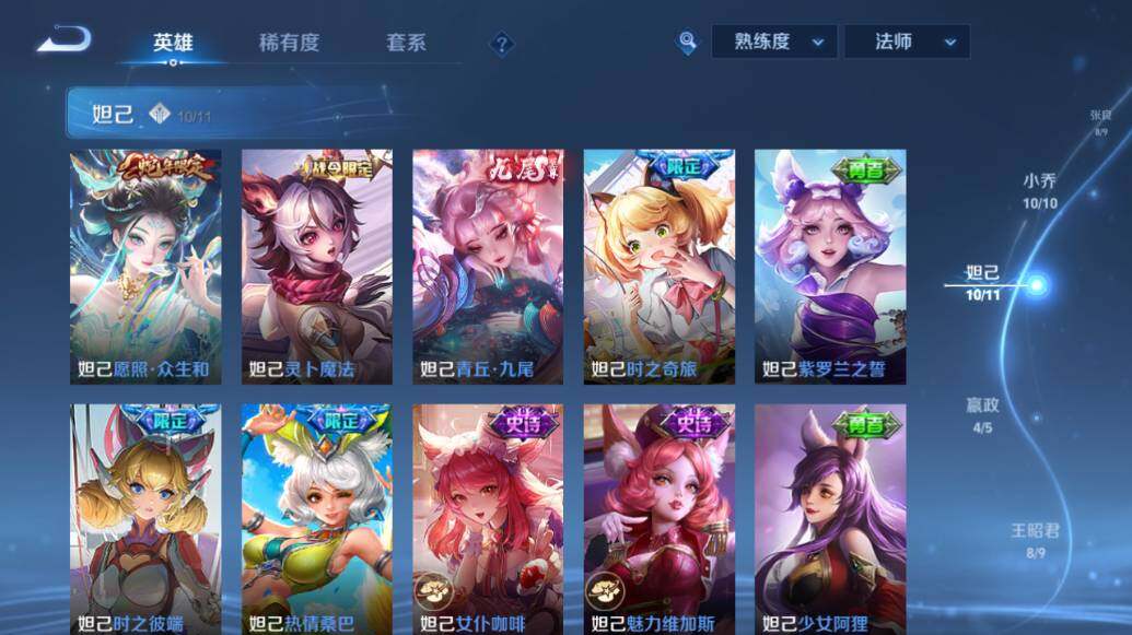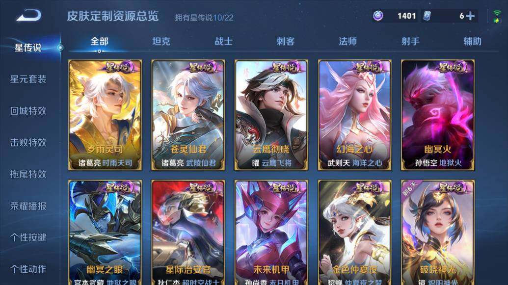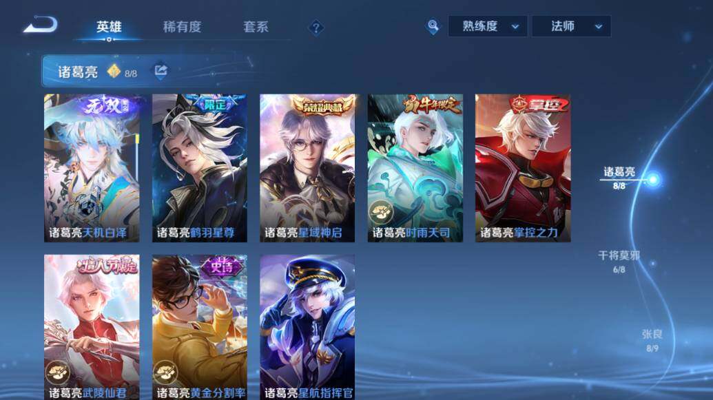 【星传说】:诸葛亮-岁雨灵司,诸葛亮-苍灵仙君,曜-云鹰彻晓,武则天-幻海之心,孙悟空-幽冥火,宫本武藏-幽冥之眼,狄仁杰-星际治安官,孙尚香-未来机甲,貂蝉-金色仲夏夜,镜-破晓神光