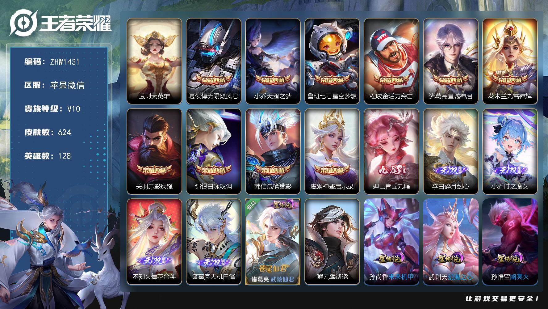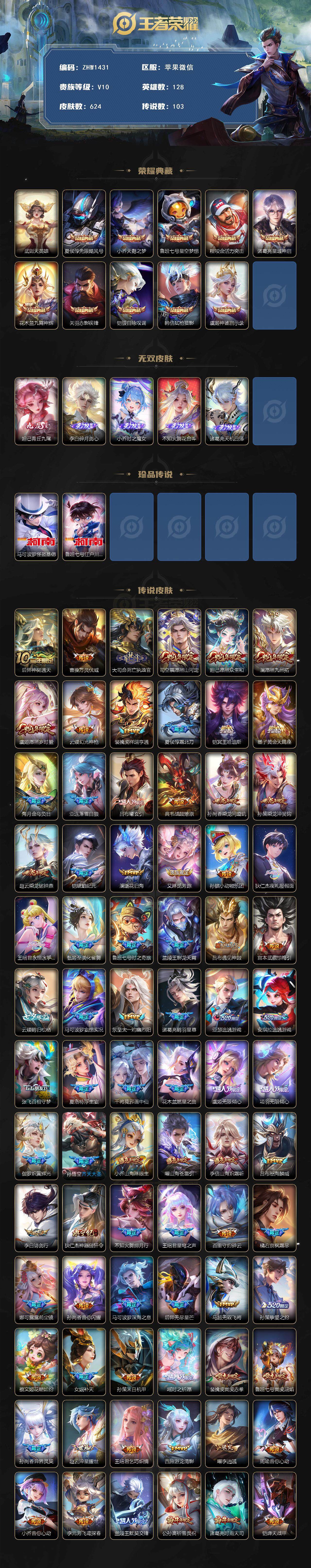 [13979998]苹果WX-V10-最强王者段位-128英雄-624皮肤-10典藏-0珍品无双-5无双-2珍品传说-103传说-215史诗