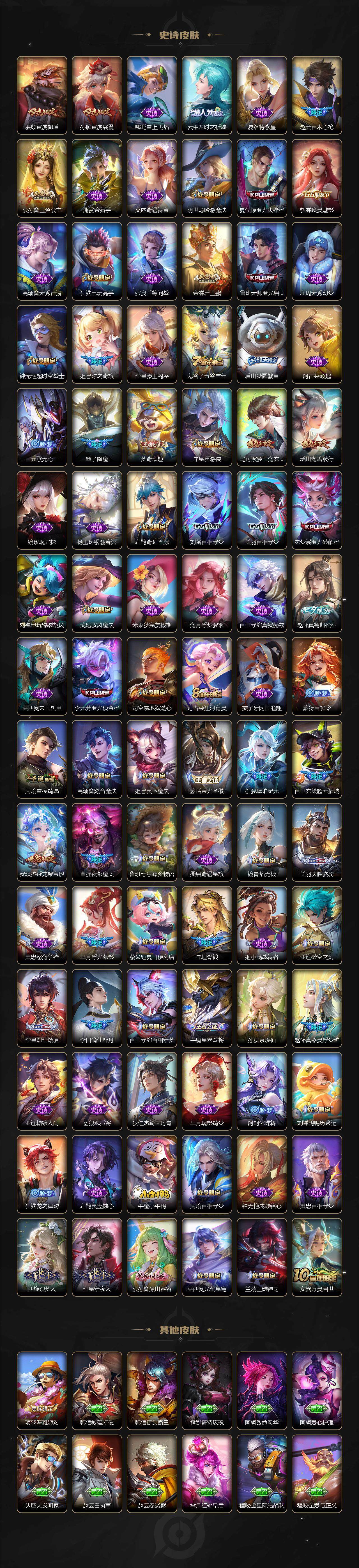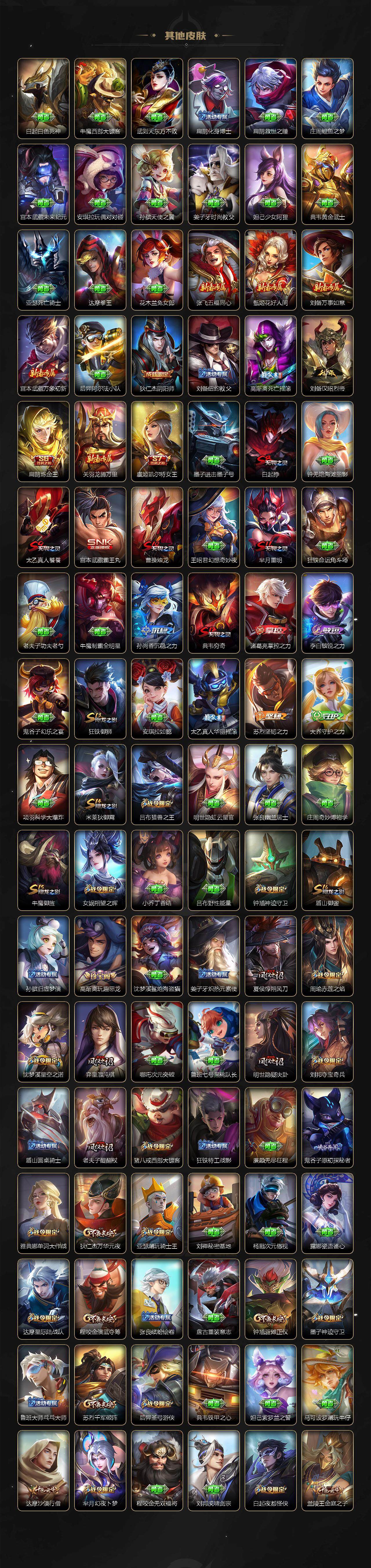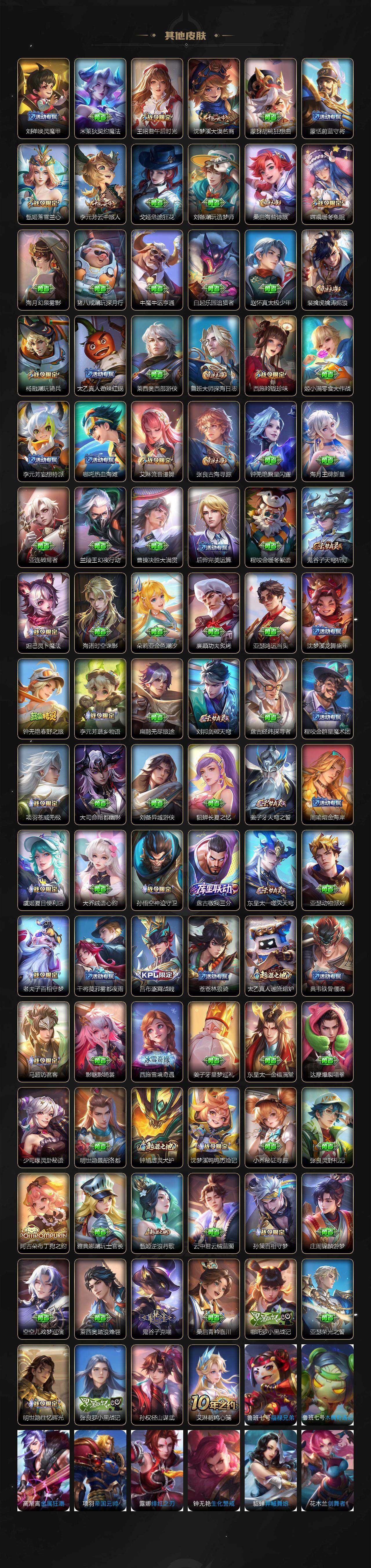 扁鹊炼金王,虞姬凯尔特女王,白起狰,太乙真人饕餮,曹操烛龙,芈月重明,典韦穷奇,狂铁御狮,米莱狄御霄,牛魔御旌,盾山御銮,夏侯惇朔风刀,明世隐疑决卦,老夫子醍醐杖,鬼谷子原初探秘者,狄仁杰万华元夜,程咬金演武夺筹,钟馗驱傩正仪,苏烈千军破阵,吕布猎兽之王,嬴政白昼王子,女娲朔望之晖,典韦蓝屏警告,钟馗神迹守卫,鲁班七号狮舞东方,沈梦溪星空之诺,李元芳银河之约,刘邦夺宝奇兵,马可波罗暗影游猎,蒙犽狂想玩偶喵,元歌云间偶戏,弈星混沌棋,达摩沙漠行僧,兰陵王金庭之子,沈梦溪大漠名商,李元芳云中旅人,桑启海盐诗旅,裴擒虎擒涛扼浪,鲁班大师探海日志,张良古海寻踪,项羽苍威无极,镜青焰无极