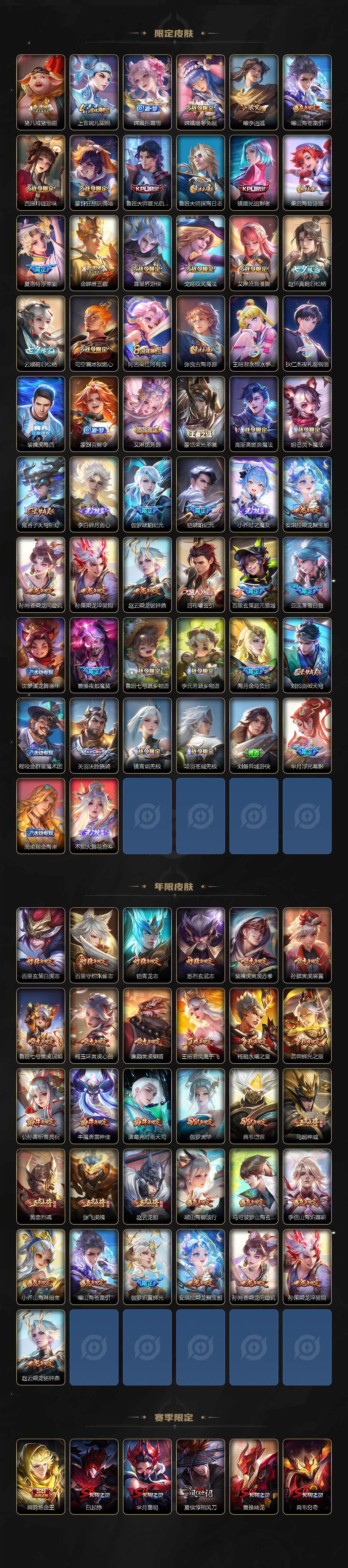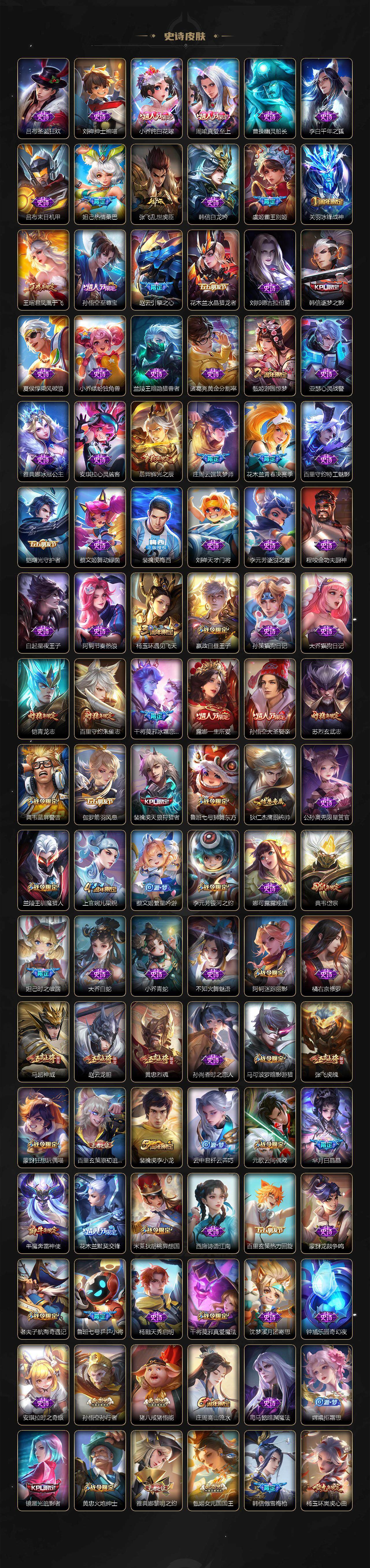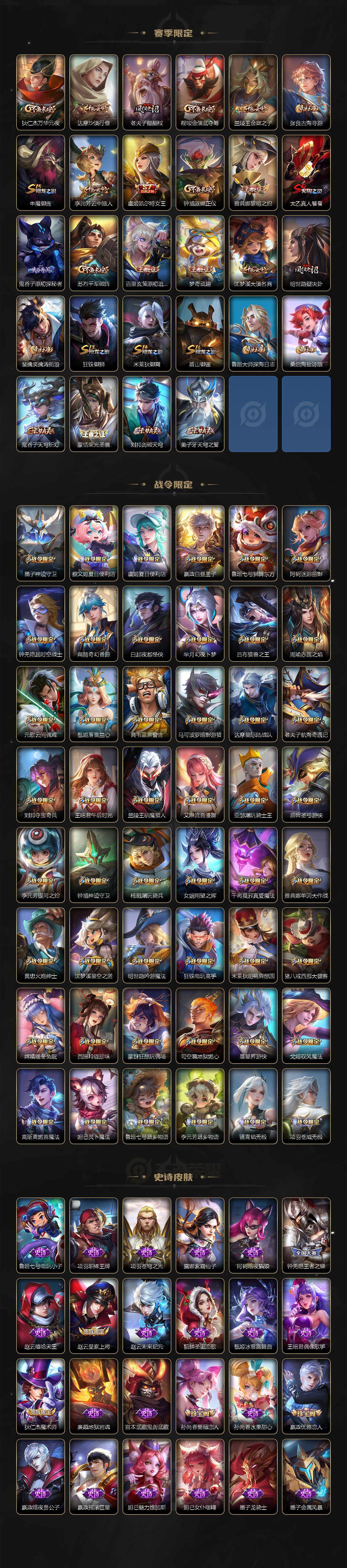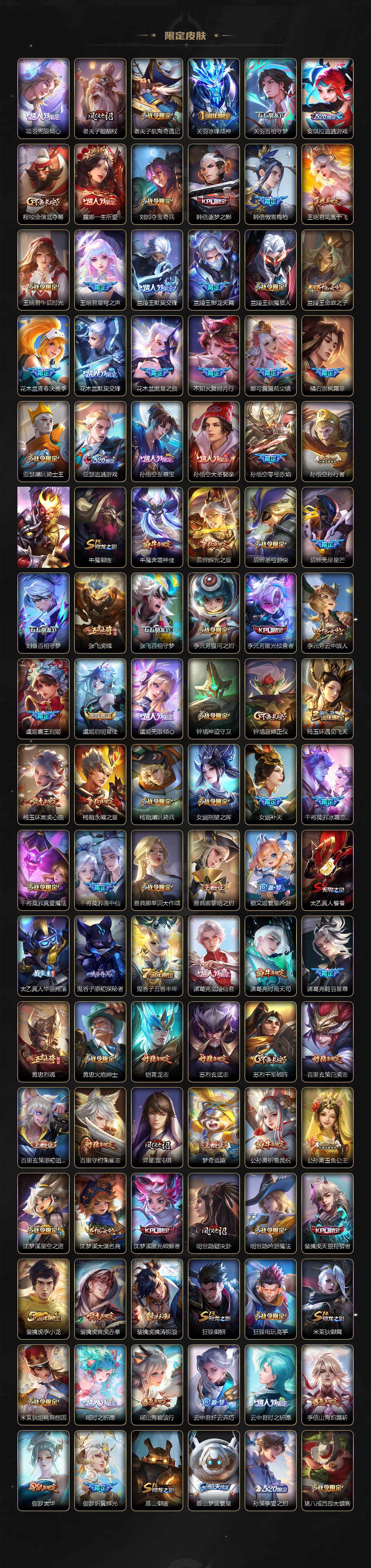 扁鹊炼金王,虞姬凯尔特女王,白起狰,太乙真人饕餮,曹操烛龙,芈月重明,典韦穷奇,狂铁御狮,米莱狄御霄,牛魔御旌,盾山御銮,夏侯惇朔风刀,明世隐疑决卦,老夫子醍醐杖,鬼谷子原初探秘者,狄仁杰万华元夜,程咬金演武夺筹,钟馗驱傩正仪,苏烈千军破阵,吕布猎兽之王,嬴政白昼王子,女娲朔望之晖,典韦蓝屏警告,钟馗神迹守卫,鲁班七号狮舞东方,沈梦溪星空之诺,李元芳银河之约,刘邦夺宝奇兵,马可波罗暗影游猎,蒙犽狂想玩偶喵,元歌云间偶戏,弈星混沌棋,达摩沙漠行僧,兰陵王金庭之子,沈梦溪大漠名商,李元芳云中旅人,桑启海盐诗旅,裴擒虎擒涛扼浪,鲁班大师探海日志,张良古海寻踪,项羽苍威无极,镜青焰无极