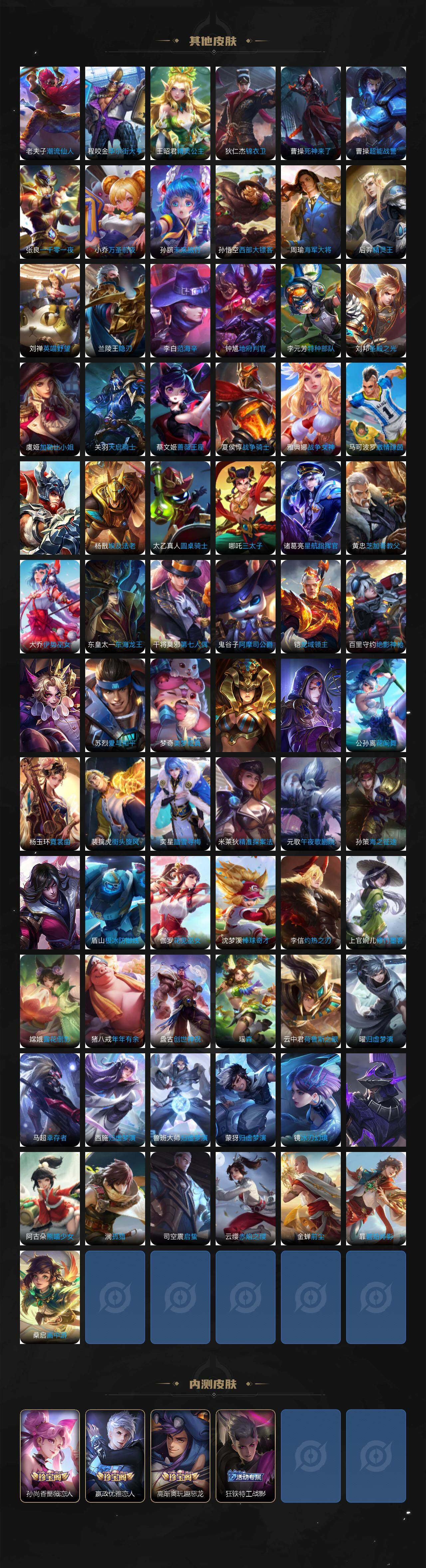 【英雄全皮】:小乔全皮,赵云全皮,墨子全皮,鲁班七号全皮,刘禅全皮,阿轲全皮,钟无艳全皮,扁鹊全皮,周瑜全皮,夏侯惇全皮,典韦全皮,狄仁杰全皮,达摩全皮,程咬金全皮,姜子牙全皮,刘邦全皮,孙权全皮,兰陵王全皮,不知火舞全皮,娜可露露全皮,橘右京全皮,牛魔全皮,虞姬全皮,钟馗全皮,苍全皮,太乙真人全皮,鬼谷子全皮,诸葛亮全皮,黄忠全皮,沈梦溪全皮,裴擒虎全皮,狂铁全皮,李信全皮,盾山全皮,猪八戒全皮,亚连全皮,海月全皮,鲁班大师全皮,蒙恬全皮,阿古朵全皮,夏洛特全皮,司空震全皮,金蝉全皮,赵怀真全皮,莱西奥全皮,空空儿全皮,影全皮