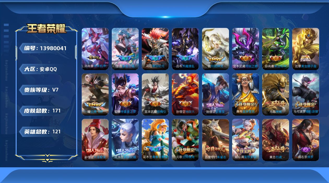 [13980041]可二次【店主推荐捡漏号!可直接换绑】,安卓Q-V7-至尊星耀V段位-121英雄-171皮肤-0典藏-0珍品无双-0无双-0珍品传说-11传说-48史诗