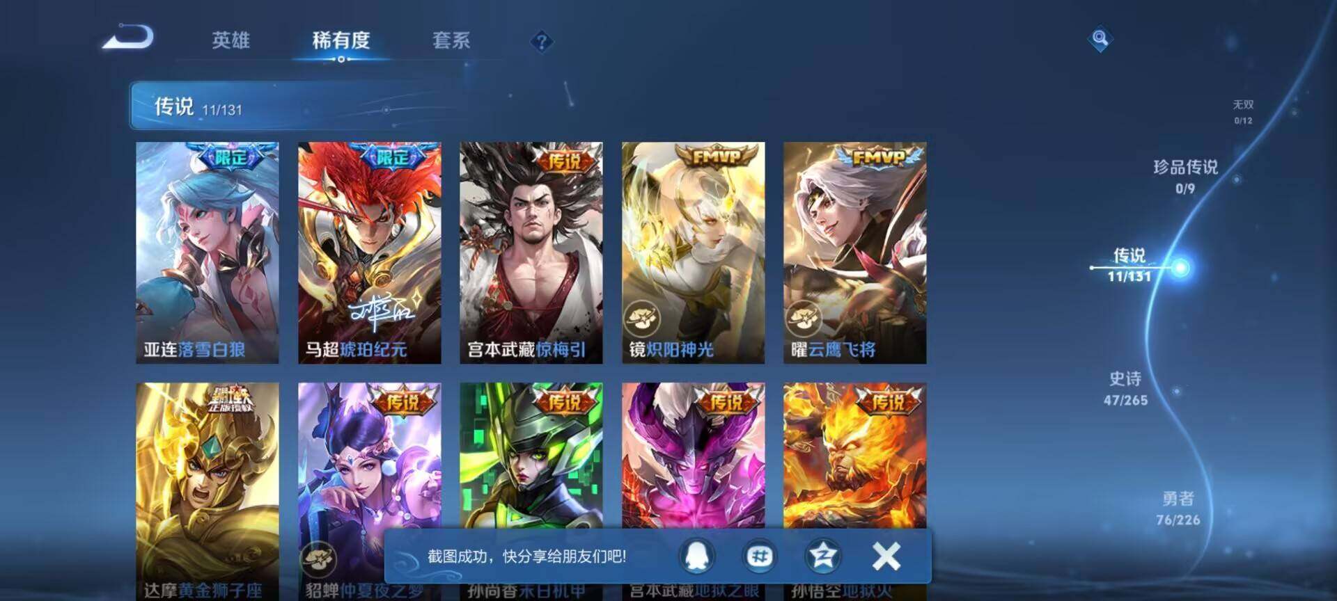 【传说皮肤】:亚连落雪白狼,马超琥珀纪元,宫本武藏惊梅引,镜炽阳神光,曜云鹰飞将,达摩黄金狮子座,貂蝉仲夏夜之梦,孙尚香末日机甲,宫本武藏地狱之眼,孙悟空地狱火,吕布天魔缭乱