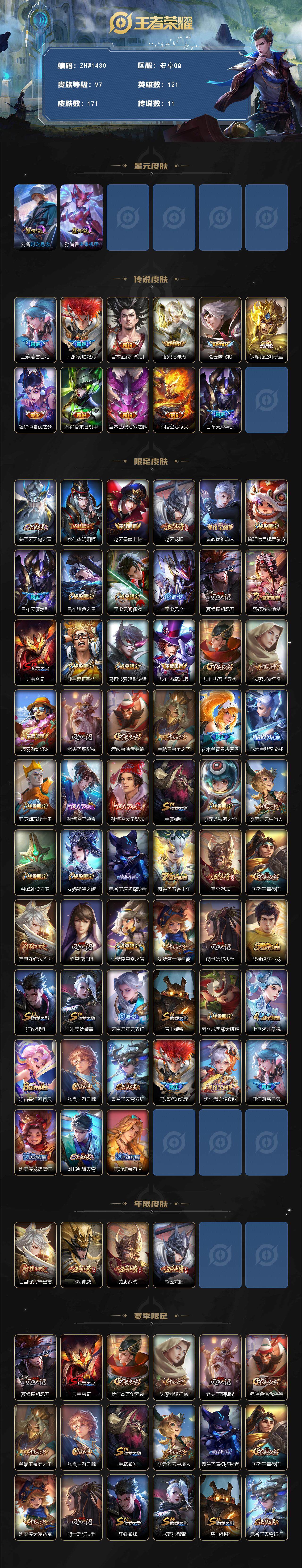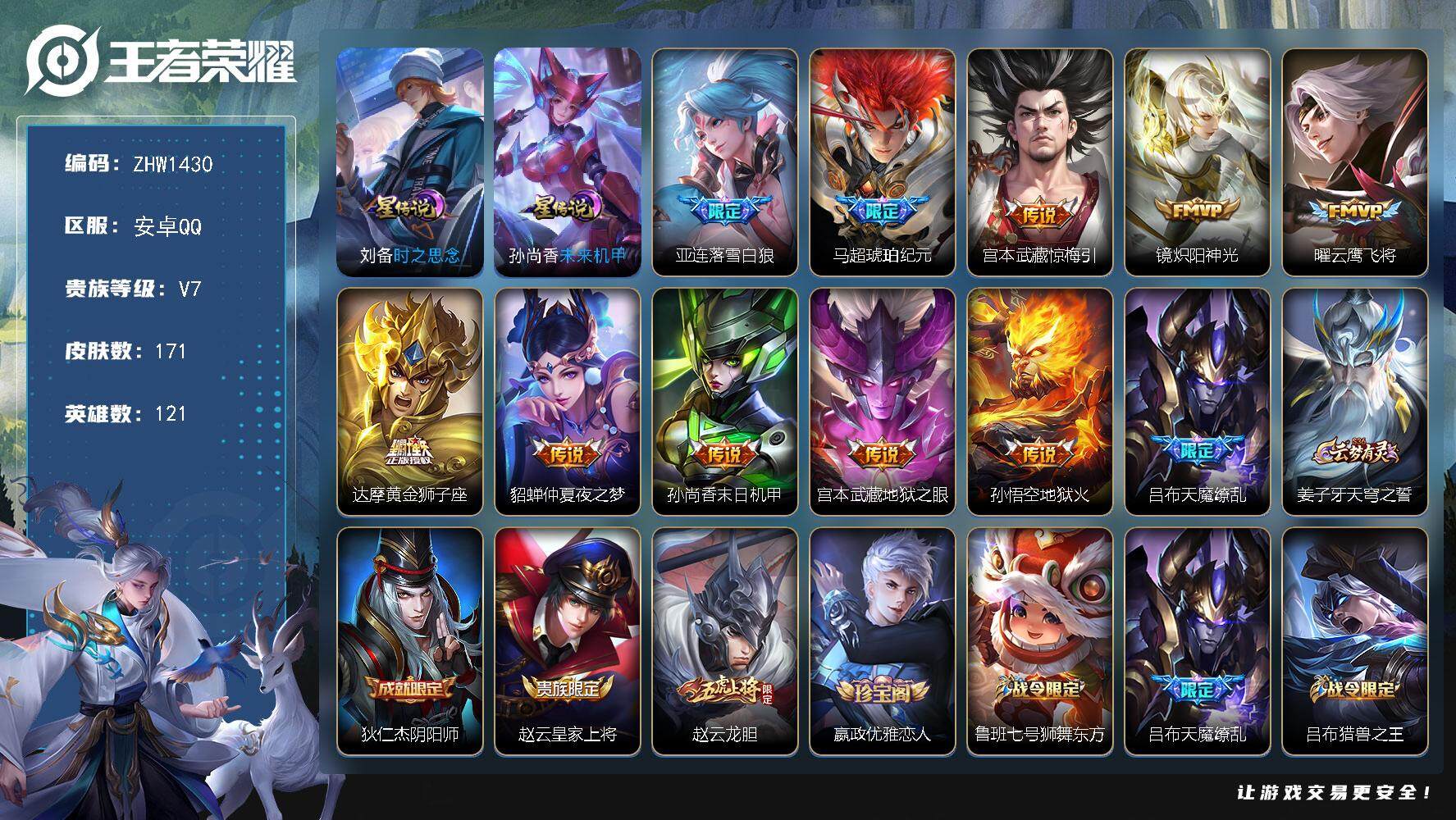 [13980041]可二次【店主推荐捡漏号!可直接换绑】,安卓Q-V7-至尊星耀V段位-121英雄-171皮肤-0典藏-0珍品无双-0无双-0珍品传说-11传说-48史诗 【传说皮肤】:亚连落雪白狼,马超琥珀纪元,宫本武藏惊梅引,镜炽阳神光,曜云鹰飞将,达摩黄金狮子座,貂蝉仲夏夜之梦,孙尚香末日机甲,宫本武藏地狱之眼,孙悟空地狱火,吕布天魔缭乱 【限定皮肤】:姜子牙天穹之誓,狄仁杰阴阳师,赵云皇家上将,赵云龙胆,嬴政优雅恋人,鲁班七号狮舞东方,吕布天魔缭乱,吕布猎兽之王,元歌云间偶戏,元歌无心,夏侯惇朔风刀,甄姬游园惊梦,典韦穷奇,典韦蓝屏警告,马可波罗暗影游猎,狄仁杰魔术师,狄仁杰万华元夜,达摩沙漠行僧,项羽海滩派对,老夫子醍醐杖,程咬金演武夺筹,兰陵王金庭之子,花木兰青春决赛季,花木兰默契交锋,亚瑟潮玩骑士王,孙悟空至尊宝,孙悟空大圣娶亲,牛魔御旌,李元芳银河之约,李元芳云中旅人,钟馗神迹守卫,女娲朔望之晖,鬼谷子原初探秘者,鬼谷子五谷丰年,黄忠烈魂,苏烈千军破阵,百里守约朱雀志,弈星混沌棋,沈梦溪星空之诺,沈梦溪大漠名商,明世隐疑决卦,裴擒虎李小龙,狂铁御狮,米莱狄御霄,云中君纤云弄巧,盾山御銮,猪八戒西部大镖客,上官婉儿梁祝,阿古朵江河有灵,张良古海寻踪,鬼谷子天穹祈灯,马超琥珀纪元,姬小满妄想食味,亚连落雪白狼,沈梦溪龙舞盛年,刘邦剑破天穹,周瑜熔金海岸 【年限皮肤】:百里守约朱雀志,马超神威,黄忠烈魂,赵云龙胆 【赛季限定】:夏侯惇朔风刀,典韦穷奇,狄仁杰万华元夜,达摩沙漠行僧,老夫子醍醐杖,程咬金演武夺筹,兰陵王金庭之子,张良古海寻踪,牛魔御旌,李元芳云中旅人,鬼谷子原初探秘者,苏烈千军破阵,弈星混沌棋,沈梦溪大漠名商,明世隐疑决卦,狂铁御狮,米莱狄御霄,盾山御銮,鬼谷子天穹祈灯,刘邦剑破天穹,姜子牙天穹之誓 【战令限定】:鲁班七号狮舞东方,吕布猎兽之王,元歌云间偶戏,典韦蓝屏警告,马可波罗暗影游猎,亚瑟潮玩骑士王,李元芳银河之约,钟馗神迹守卫,女娲朔望之晖,沈梦溪星空之诺,猪八戒西部大镖客 【史诗皮肤】:鲁班七号电玩小子,赵云皇家上将,赵云未来纪元,甄姬冰雪圆舞曲,王昭君偶像歌手,狄仁杰魔术师,廉颇地狱岩魂,宫本武藏鬼剑武藏,孙尚香水果甜心,嬴政优雅恋人,妲己魅力维加斯,妲己女仆咖啡,墨子金属风暴,曹操幽灵船长,李白千年之狐,张飞乱世虎臣,韩信白龙吟,孙悟空至尊宝,花