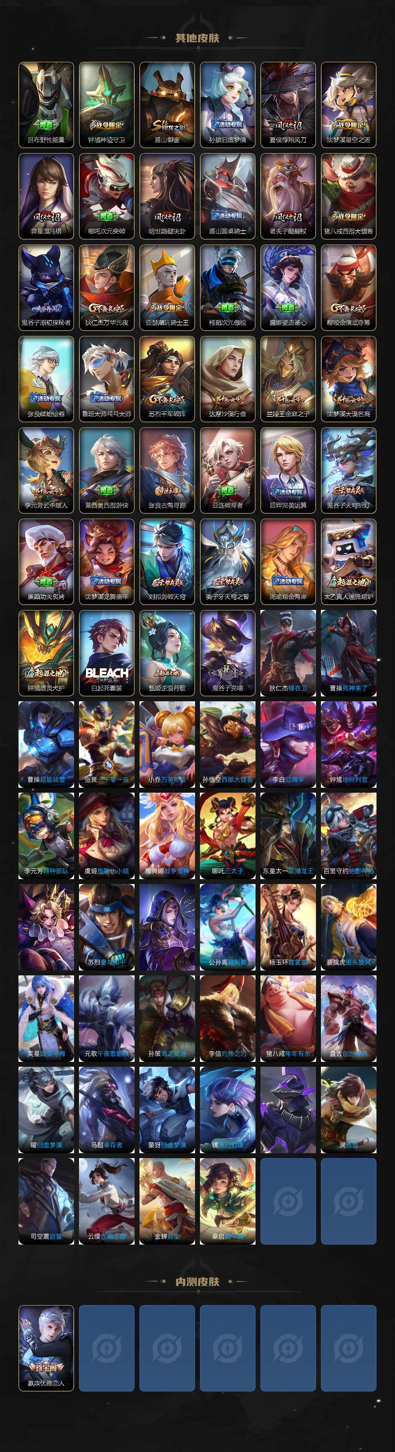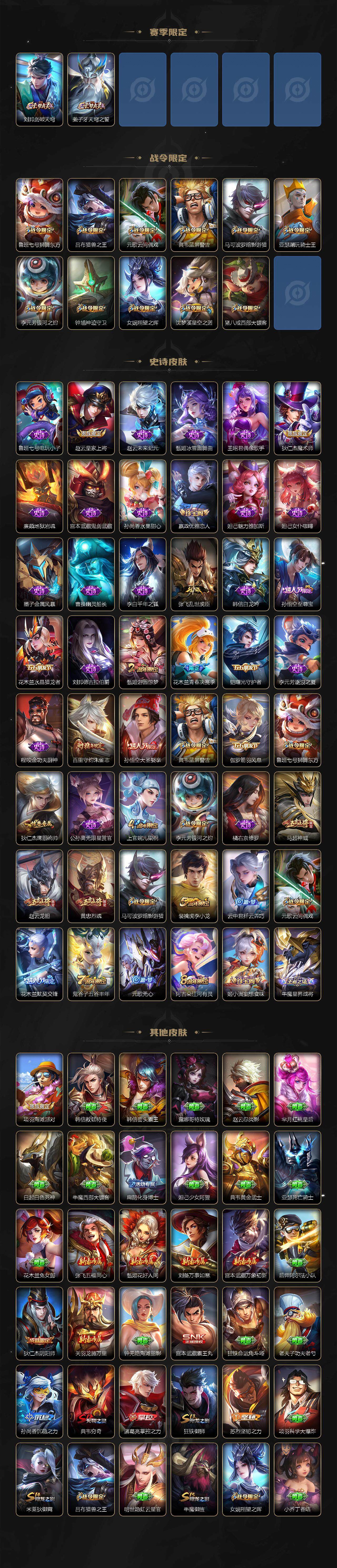 【限定皮肤】:姜子牙天穹之誓,狄仁杰阴阳师,赵云皇家上将,赵云龙胆,嬴政优雅恋人,鲁班七号狮舞东方,吕布天魔缭乱,吕布猎兽之王,元歌云间偶戏,元歌无心,夏侯惇朔风刀,甄姬游园惊梦,典韦穷奇,典韦蓝屏警告,马可波罗暗影游猎,狄仁杰魔术师,狄仁杰万华元夜,达摩沙漠行僧,项羽海滩派对,老夫子醍醐杖,程咬金演武夺筹,兰陵王金庭之子,花木兰青春决赛季,花木兰默契交锋,亚瑟潮玩骑士王,孙悟空至尊宝,孙悟空大圣娶亲,牛魔御旌,李元芳银河之约,李元芳云中旅人,钟馗神迹守卫,女娲朔望之晖,鬼谷子原初探秘者,鬼谷子五谷丰年,黄忠烈魂,苏烈千军破阵,百里守约朱雀志,弈星混沌棋,沈梦溪星空之诺,沈梦溪大漠名商,明世隐疑决卦,裴擒虎李小龙,狂铁御狮,米莱狄御霄,云中君纤云弄巧,盾山御銮,猪八戒西部大镖客,上官婉儿梁祝,阿古朵江河有灵,张良古海寻踪,鬼谷子天穹祈灯,马超琥珀纪元,姬小满妄想食味,亚连落雪白狼,沈梦溪龙舞盛年,刘邦剑破天穹,周瑜熔金海岸