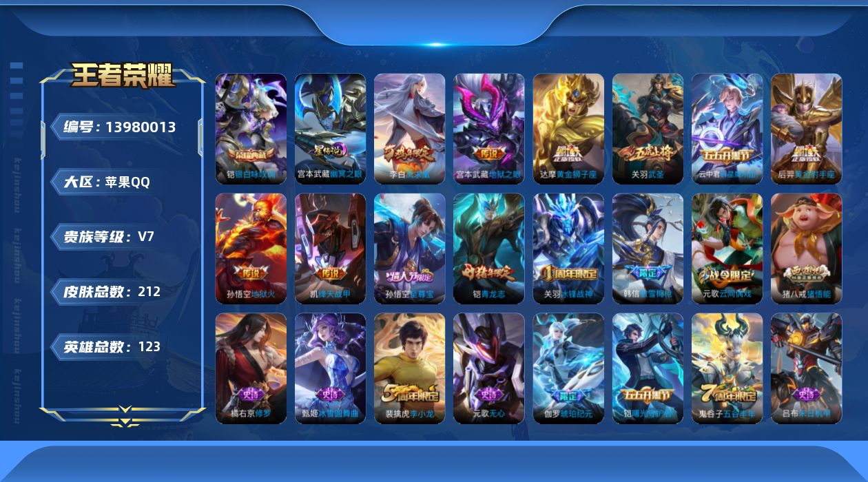 [13980013]可二次,【店主推荐捡漏号!可直接换绑】苹果Q-V7-永恒钻石I段位-123英雄-212皮肤-1典藏-8传说-47史诗