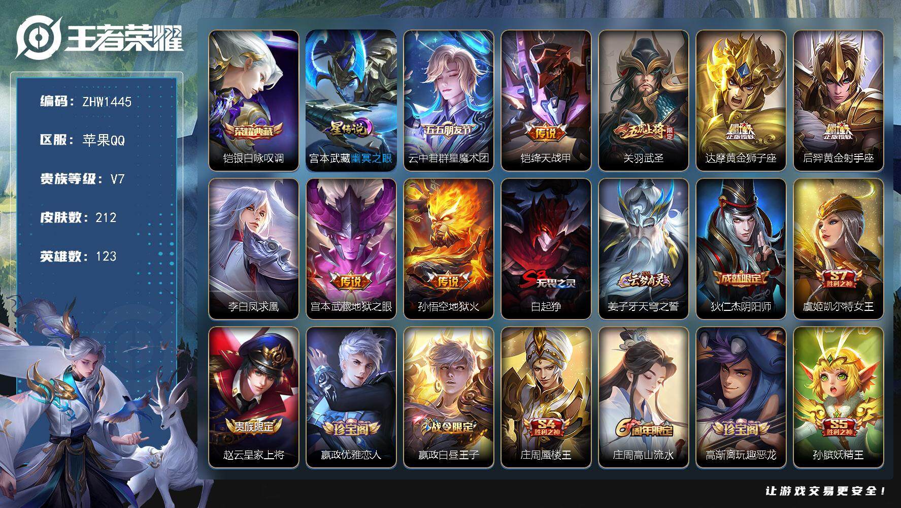 - [11628825]V7 5传说 123英雄 143皮肤 可修改实名 优质装备:炽阳神光,一念神魔,李逍遥,山海·炽霜斩(李信年限),炽翼辉光(娃娃菜牛角包) 珍宝阁皮:蔷薇恋人 限定皮:飞衡(韩信年限),梁祝,逐梦之星,天狼征服者,李小龙,蜜橘之夏,山海·玄木吟(马可年限) 史诗皮:龙之律动,百相守梦-周瑜,百相守梦-黄忠,黄金分割率,特工魅影,千年之狐,无限星赏官,晚萤,龙骑士(小龙虾),末日机甲-吕布,猫狗日记-孙策,乱世虎臣,节奏热浪,修罗,暗隐猎兽者,幽灵船长,鬼剑武藏,舞动绿茵,缤纷独角兽,乘风破浪,曙光守护者,箭羽风息,圣诞狂欢,圣诞恋歌,鹰眼统帅,魅力维加斯,未来纪元-赵云