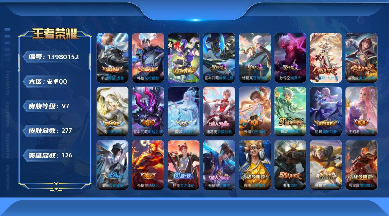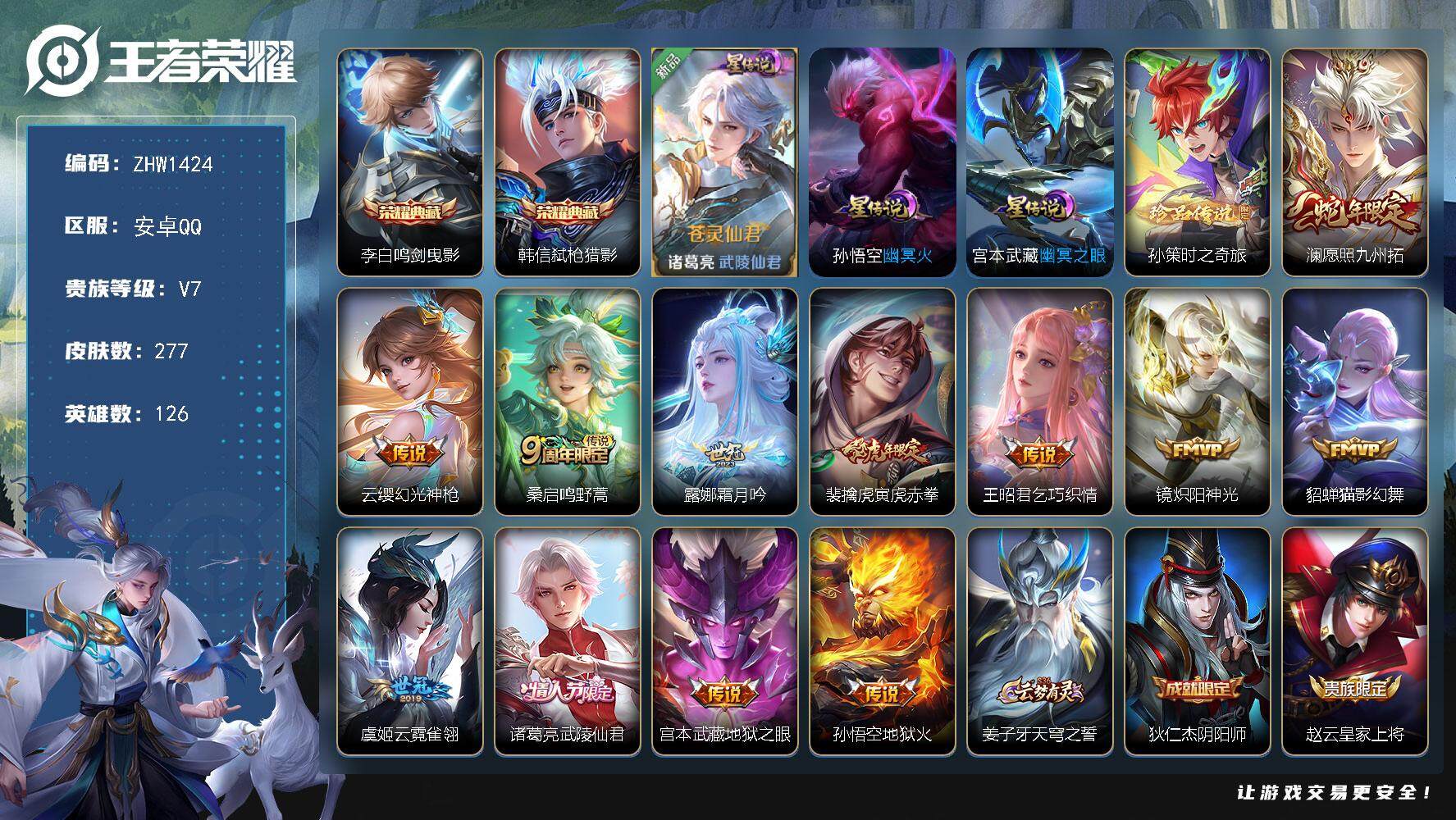 [13980152]【店主推荐捡漏号!可直接换绑】安卓Q-V7-最强王者段位-126英雄-277皮肤-2典藏-1珍品传说-12传说-78史诗