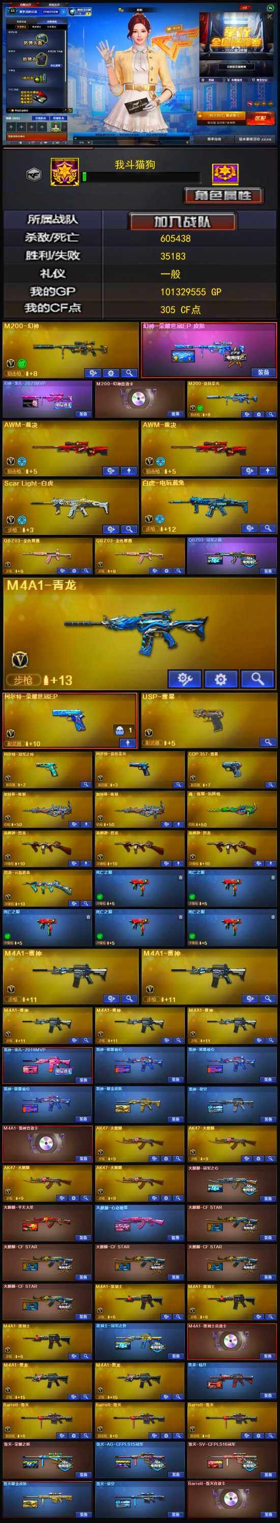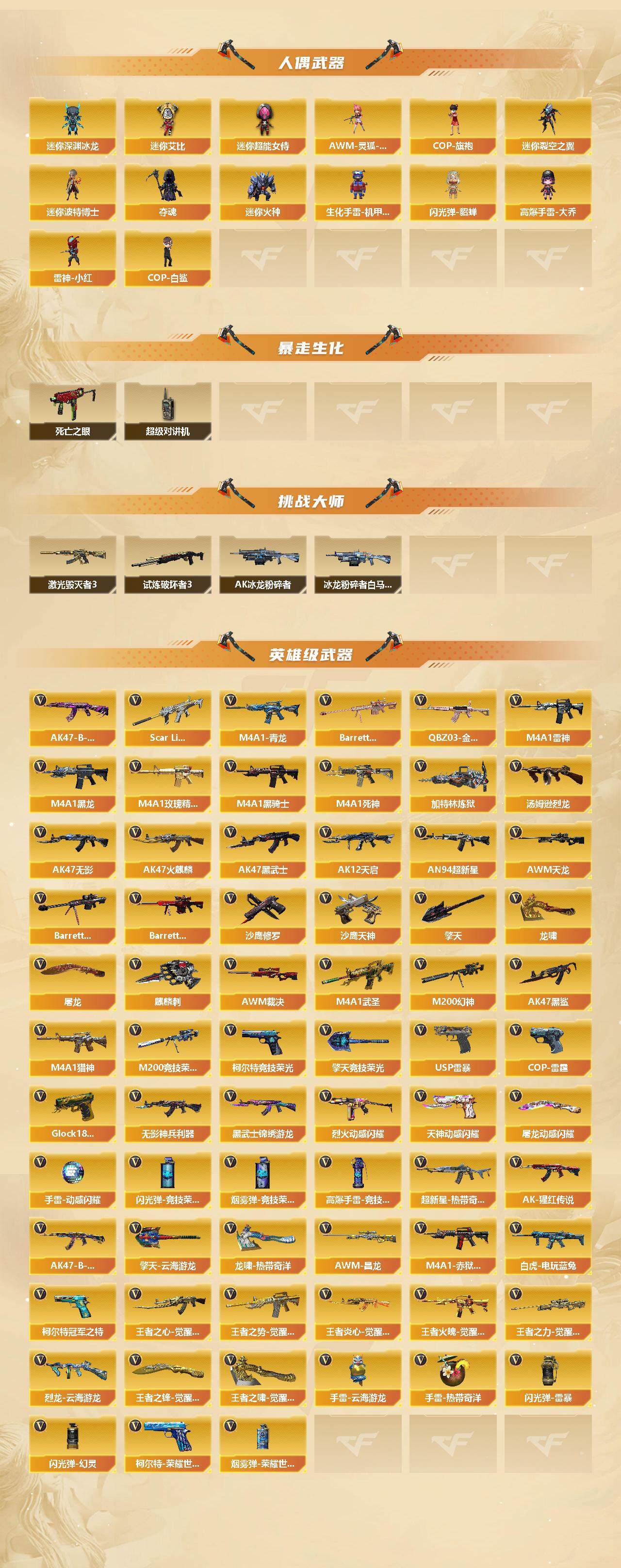 【热门武器】:QBZ03-金色蔷薇*2,Scar Light-白虎,M4A1-青龙,M200-幻神,M200-竞技荣光,死亡之眼*5,白虎-电玩蓝兔,柯尔特-冠军之特,M4A1-黑骑士*3,汤姆逊-烈龙*3,加特林-炼狱*2,雷神-小红,COP-白鲨*2,USP-雷暴,沙鹰-修罗*5